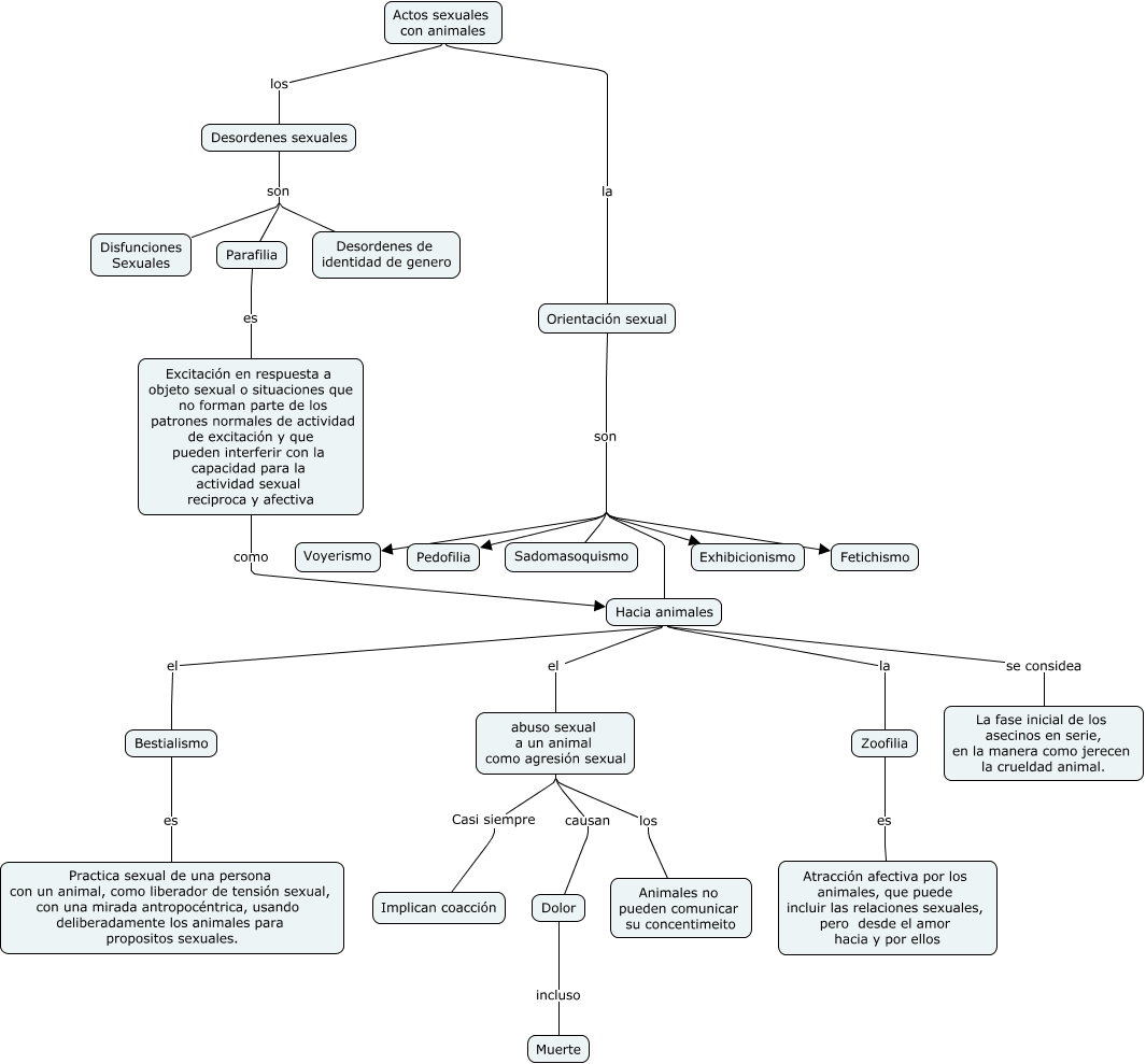 Este Cmap, tiene información relacionada con: Actos sexuales animales, Zoofilia es Atracción afectiva por los animales, que puede incluir las relaciones sexuales, pero desde el amor hacia y por ellos, Orientación sexual son Sadomasoquismo, Orientación sexual son Exhibicionismo, Bestialismo es Practica sexual de una persona con un animal, como liberador de tensión sexual, con una mirada antropocéntrica, usando deliberadamente los animales para propositos sexuales., Desordenes sexuales son Disfunciones Sexuales, Excitación en respuesta a objeto sexual o situaciones que no forman parte de los patrones normales de actividad de excitación y que pueden interferir con la capacidad para la actividad sexual reciproca y afectiva como Hacia animales, Hacia animales el abuso sexual a un animal como agresión sexual, Hacia animales la Zoofilia, abuso sexual a un animal como agresión sexual causan Dolor, abuso sexual a un animal como agresión sexual Casi siempre Implican coacción, Orientación sexual son Hacia animales, Orientación sexual son Voyerismo, Orientación sexual son Fetichismo, Hacia animales se considea La fase inicial de los asecinos en serie, en la manera como jerecen la crueldad animal., Hacia animales el Bestialismo, Desordenes sexuales son Desordenes de identidad de genero, Actos sexuales con animales los Desordenes sexuales, Dolor incluso Muerte, Parafilia es Excitación en respuesta a objeto sexual o situaciones que no forman parte de los patrones normales de actividad de excitación y que pueden interferir con la capacidad para la actividad sexual reciproca y afectiva, abuso sexual a un animal como agresión sexual los Animales no pueden comunicar su concentimeito