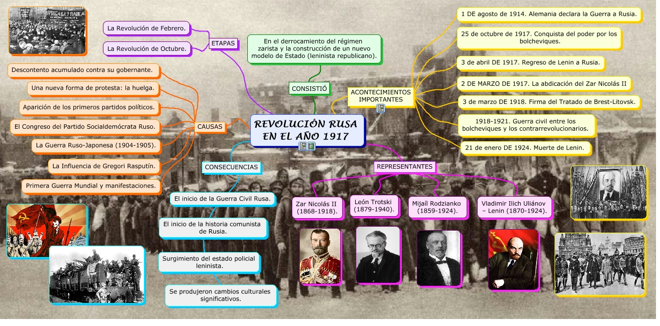 Este Cmap, tiene información relacionada con: REVOLUCIÓN RUSA, REVOLUCIÓN RUSA EN EL AÑO 1917 ACONTECIMIENTOS IMPORTANTES 2 DE MARZO DE 1917. La abdicación del Zar Nicolás II, REVOLUCIÓN RUSA EN EL AÑO 1917 CAUSAS Primera Guerra Mundial y manifestaciones., REVOLUCIÓN RUSA EN EL AÑO 1917 CONSISTIÓ En el derrocamiento del régimen zarista y la construcción de un nuevo modelo de Estado (leninista republicano)., REVOLUCIÓN RUSA EN EL AÑO 1917 CAUSAS Descontento acumulado contra su gobernante., REVOLUCIÓN RUSA EN EL AÑO 1917 ACONTECIMIENTOS IMPORTANTES 1918-1921. Guerra civil entre los bolcheviques y los contrarrevolucionarios., REVOLUCIÓN RUSA EN EL AÑO 1917 CAUSAS El Congreso del Partido Socialdemócrata Ruso., REVOLUCIÓN RUSA EN EL AÑO 1917 REPRESENTANTES Mijaíl Rodzianko (1859-1924)., REVOLUCIÓN RUSA EN EL AÑO 1917 CAUSAS Aparición de los primeros partidos políticos., REVOLUCIÓN RUSA EN EL AÑO 1917 REPRESENTANTES Vladimir Ilich Uliánov – Lenin (1870-1924)., REVOLUCIÓN RUSA EN EL AÑO 1917 ACONTECIMIENTOS IMPORTANTES 21 de enero DE 1924. Muerte de Lenin., REVOLUCIÓN RUSA EN EL AÑO 1917 CONSECUENCIAS Se produjeron cambios culturales significativos., REVOLUCIÓN RUSA EN EL AÑO 1917 ACONTECIMIENTOS IMPORTANTES 1 DE agosto de 1914. Alemania declara la Guerra a Rusia., REVOLUCIÓN RUSA EN EL AÑO 1917 ACONTECIMIENTOS IMPORTANTES 25 de octubre de 1917. Conquista del poder por los bolcheviques., REVOLUCIÓN RUSA EN EL AÑO 1917 CONSECUENCIAS El inicio de la historia comunista de Rusia., REVOLUCIÓN RUSA EN EL AÑO 1917 ACONTECIMIENTOS IMPORTANTES 3 de abril DE 1917. Regreso de Lenin a Rusia., REVOLUCIÓN RUSA EN EL AÑO 1917 ETAPAS La Revolución de Octubre., REVOLUCIÓN RUSA EN EL AÑO 1917 REPRESENTANTES León Trotski (1879-1940)., REVOLUCIÓN RUSA EN EL AÑO 1917 CAUSAS La Influencia de Gregori Rasputín., REVOLUCIÓN RUSA EN EL AÑO 1917 ETAPAS La Revolución de Febrero., REVOLUCIÓN RUSA EN EL AÑO 1917 CONSECUENCIAS El inicio de la Guerra Civil Rusa.