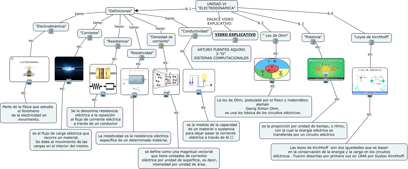 Este Cmap, tiene información relacionada con: MAPA6__ARTUROFUENTESAQUINO, "Corriente" es:, UNIDAD VI "ELECTRODINAMICA" 6.1 "Definiciones", es: Las leyes de Kirchhoff son dos igualdades que se basan en la conservación de la energía y la carga en los circuitos eléctricos . Fueron descritas por primera vez en 1846 por Gustav Kirchhoff., "Definiciones" tiene: "Conductividad", es: Parte de la física que estudia el fenómeno de la electricidad en movimiento., "Resistividad" es:, "Definiciones" tiene: "Electrodinamica", "Conductividad" es:, "Definiciones" tiene: "Densidad de corriente", es: es la proporción por unidad de tiempo, o ritmo, con la cual la energía eléctrica es transferida por un circuito eléctrico, " Ley de Ohm" es:, "Potencia" es:, es: se define como una magnitud vectorial que tiene unidades de corriente eléctrica por unidad de superficie, es decir, intensidad por unidad de área., "Definiciones" tiene: "Resistencia", es: es la medida de la capacidad de un material o sustancia para dejar pasar la corriente eléctrica a través de él., es: La resistividad es la resistencia eléctrica específica de un determinado material., UNIDAD VI "ELECTRODINAMICA" 6.3 "Potencia", UNIDAD VI "ELECTRODINAMICA" 6.2 " Ley de Ohm", UNIDAD VI "ELECTRODINAMICA" ENLACE VIDEO EXPLICATIVO: VIDEO EXPLICATIVO, "Densidad de corriente" es: