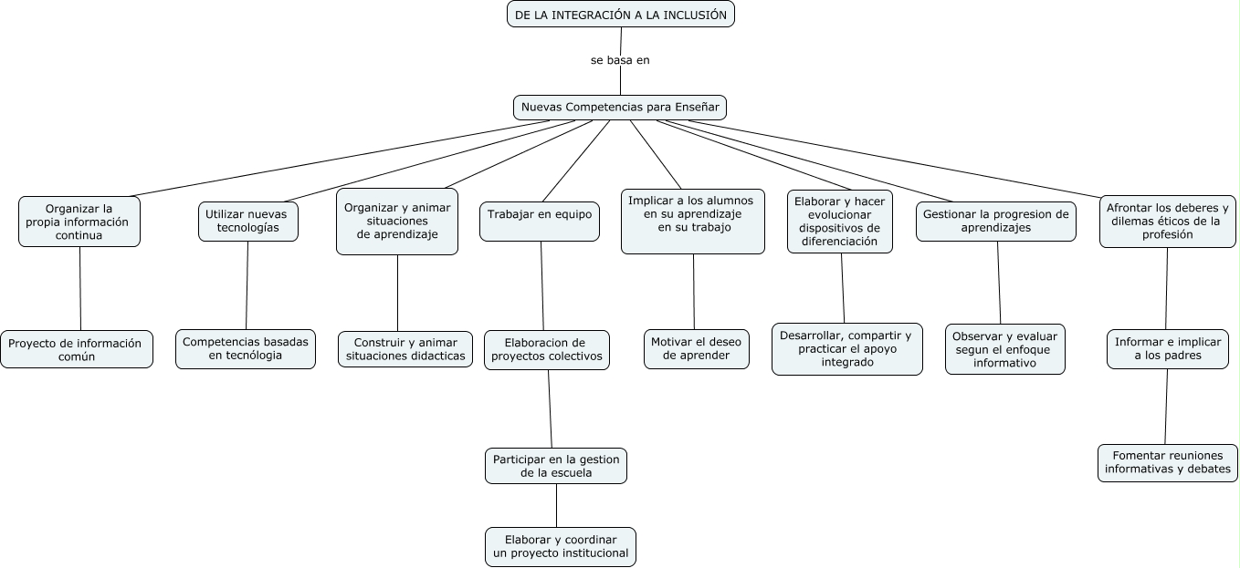 Este Cmap, tiene información relacionada con: DE LA INTEGRACIÓN A LA INCLUSIÓN, Organizar la propia información continua ???? Proyecto de información común, Elaborar y hacer evolucionar dispositivos de diferenciación ???? Desarrollar, compartir y practicar el apoyo integrado, Nuevas Competencias para Enseñar ???? Implicar a los alumnos en su aprendizaje en su trabajo, Participar en la gestion de la escuela ???? Elaborar y coordinar un proyecto institucional, Nuevas Competencias para Enseñar ???? Organizar la propia información continua, Implicar a los alumnos en su aprendizaje en su trabajo ???? Motivar el deseo de aprender, Utilizar nuevas tecnologías ???? Competencias basadas en tecnólogia, Nuevas Competencias para Enseñar ???? Trabajar en equipo, Organizar y animar situaciones de aprendizaje ???? Construir y animar situaciones didacticas, Nuevas Competencias para Enseñar ???? Organizar y animar situaciones de aprendizaje, DE LA INTEGRACIÓN A LA INCLUSIÓN se basa en Nuevas Competencias para Enseñar, Nuevas Competencias para Enseñar ???? Utilizar nuevas tecnologías, Afrontar los deberes y dilemas éticos de la profesión ???? Informar e implicar a los padres, Elaboracion de proyectos colectivos ???? Participar en la gestion de la escuela, Nuevas Competencias para Enseñar ???? Elaborar y hacer evolucionar dispositivos de diferenciación, Trabajar en equipo ???? Elaboracion de proyectos colectivos, Informar e implicar a los padres ???? Fomentar reuniones informativas y debates, Nuevas Competencias para Enseñar ???? Gestionar la progresion de aprendizajes, Gestionar la progresion de aprendizajes ???? Observar y evaluar segun el enfoque informativo, Nuevas Competencias para Enseñar ???? Afrontar los deberes y dilemas éticos de la profesión