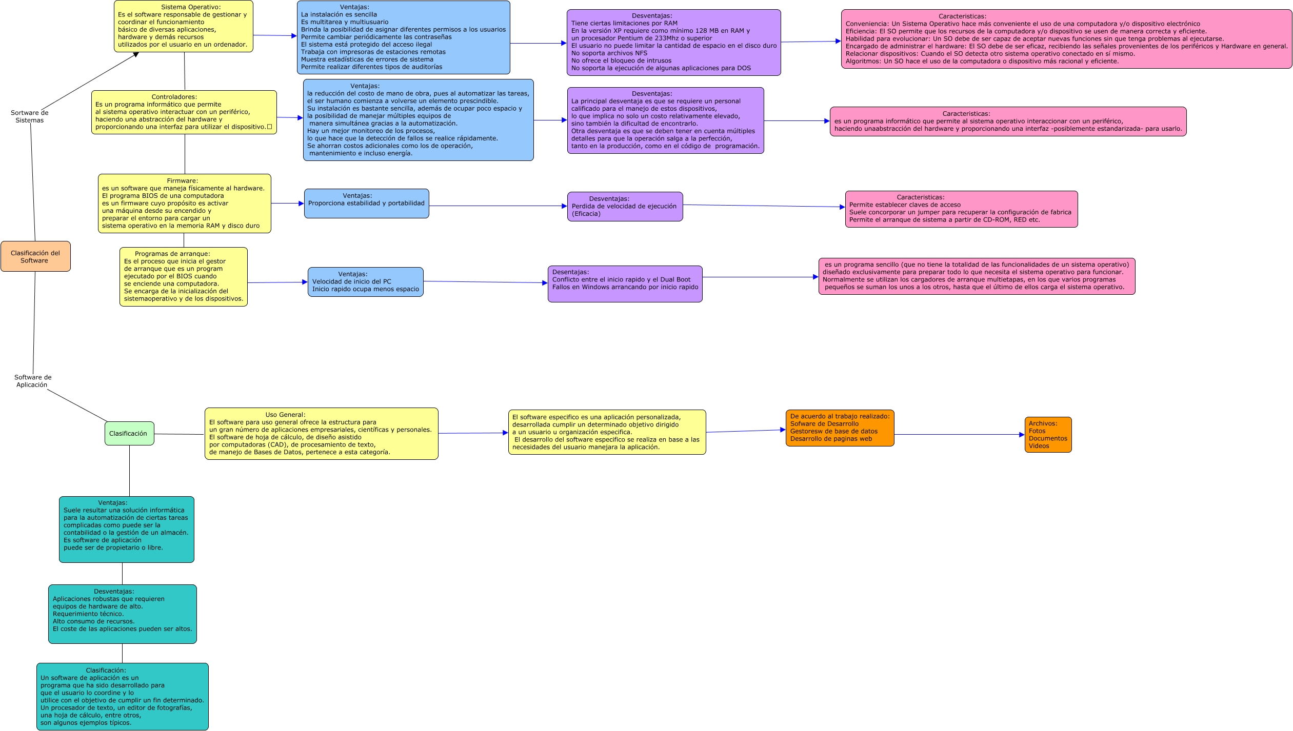 Este Cmap, tiene información relacionada con: U1-A3-MireyaHernándezBarrientos, Clasificación del Software Software de Aplicación Clasificación, Firmware: es un software que maneja físicamente al hardware. El programa BIOS de una computadora es un firmware cuyo propósito es activar una máquina desde su encendido y preparar el entorno para cargar un sistema operativo en la memoria RAM y disco duro ???? Ventajas: Proporciona estabilidad y portabilidad, El software especifico es una aplicación personalizada, desarrollada cumplir un determinado objetivo dirigido a un usuario u organización especifica. El desarrollo del software especifico se realiza en base a las necesidades del usuario manejara la aplicación. De De acuerdo al trabajo realizado: Sofware de Desarrollo Gestoresw de base de datos Desarrollo de paginas web, Controladores: Es un programa informático que permite al sistema operativo interactuar con un periférico, haciendo una abstracción del hardware y proporcionando una interfaz para utilizar el dispositivo. ???? Ventajas: la reducción del costo de mano de obra, pues al automatizar las tareas, el ser humano comienza a volverse un elemento prescindible. Su instalación es bastante sencilla, además de ocupar poco espacio y la posibilidad de manejar múltiples equipos de manera simultánea gracias a la automatización. Hay un mejor monitoreo de los procesos, lo que hace que la detección de fallos se realice rápidamente. Se ahorran costos adicionales como los de operación, mantenimiento e incluso energía., Clasificación ???? Ventajas: Suele resultar una solución informática para la automatización de ciertas tareas complicadas como puede ser la contabilidad o la gestión de un almacén. Es software de aplicación puede ser de propietario o libre., Ventajas: La instalación es sencilla Es multitarea y multiusuario Brinda la posibilidad de asignar diferentes permisos a los usuarios Permite cambiar periódicamente las contraseñas El sistema está protegido del acceso ilegal Trabaja con impresoras de estaciones remotas Muestra estadísticas de errores de sistema Permite realizar diferentes tipos de auditorías ???? Desventajas: Tiene ciertas limitaciones por RAM En la versión XP requiere como mínimo 128 MB en RAM y un procesador Pentium de 233Mhz o superior El usuario no puede limitar la cantidad de espacio en el disco duro No soporta archivos NFS No ofrece el bloqueo de intrusos No soporta la ejecución de algunas aplicaciones para DOS, Ventajas: la reducción del costo de mano de obra, pues al automatizar las tareas, el ser humano comienza a volverse un elemento prescindible. Su instalación es bastante sencilla, además de ocupar poco espacio y la posibilidad de manejar múltiples equipos de manera simultánea gracias a la automatización. Hay un mejor monitoreo de los procesos, lo que hace que la detección de fallos se realice rápidamente. Se ahorran costos adicionales como los de operación, mantenimiento e incluso energía. ???? Desventajas: La principal desventaja es que se requiere un personal calificado para el manejo de estos dispositivos, lo que implica no solo un costo relativamente elevado, sino también la dificultad de encontrarlo. Otra desventaja es que se deben tener en cuenta múltiples detalles para que la operación salga a la perfección, tanto en la producción, como en el código de programación., Desentajas: Conflicto entre el inicio rapido y el Dual Boot Fallos en Windows arrancando por inicio rapido ???? es un programa sencillo (que no tiene la totalidad de las funcionalidades de un sistema operativo) diseñado exclusivamente para preparar todo lo que necesita el sistema operativo para funcionar. Normalmente se utilizan los cargadores de arranque multietapas, en los que varios programas pequeños se suman los unos a los otros, hasta que el último de ellos carga el sistema operativo., Desventajas: Aplicaciones robustas que requieren equipos de hardware de alto. Requerimiento técnico. Alto consumo de recursos. El coste de las aplicaciones pueden ser altos. ???? Clasificación: Un software de aplicación es un programa que ha sido desarrollado para que el usuario lo coordine y lo utilice con el objetivo de cumplir un fin determinado. Un procesador de texto, un editor de fotografías, una hoja de cálculo, entre otros, son algunos ejemplos típicos., De acuerdo al trabajo realizado: Sofware de Desarrollo Gestoresw de base de datos Desarrollo de paginas web ???? Archivos: Fotos Documentos Videos, Sistema Operativo: Es el software responsable de gestionar y coordinar el funcionamiento básico de diversas aplicaciones, hardware y demás recursos utilizados por el usuario en un ordenador. Firmware: es un software que maneja físicamente al hardware. El programa BIOS de una computadora es un firmware cuyo propósito es activar una máquina desde su encendido y preparar el entorno para cargar un sistema operativo en la memoria RAM y disco duro, Desventajas: Tiene ciertas limitaciones por RAM En la versión XP requiere como mínimo 128 MB en RAM y un procesador Pentium de 233Mhz o superior El usuario no puede limitar la cantidad de espacio en el disco duro No soporta archivos NFS No ofrece el bloqueo de intrusos No soporta la ejecución de algunas aplicaciones para DOS ???? Caracteristicas: Conveniencia: Un Sistema Operativo hace más conveniente el uso de una computadora y/o dispositivo electrónico Eficiencia: El SO permite que los recursos de la computadora y/o dispositivo se usen de manera correcta y eficiente. Habilidad para evolucionar: Un SO debe de ser capaz de aceptar nuevas funciones sin que tenga problemas al ejecutarse. Encargado de administrar el hardware: El SO debe de ser eficaz, recibiendo las señales provenientes de los periféricos y Hardware en general. Relacionar dispositivos: Cuando el SO detecta otro sistema operativo conectado en sí mismo. Algoritmos: Un SO hace el uso de la computadora o dispositivo más racional y ef