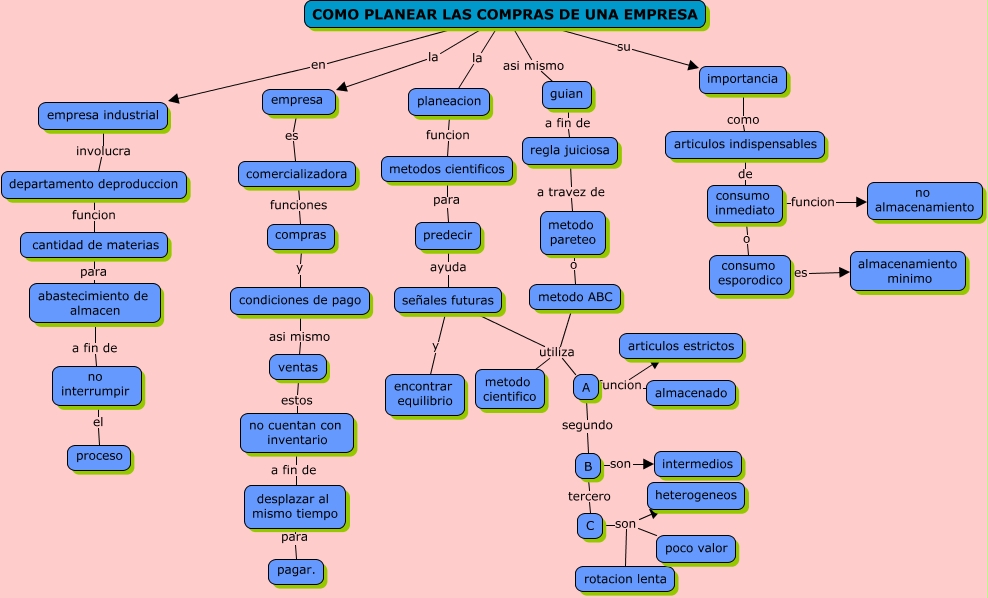 Este Cmap, tiene información relacionada con: 104 como planear las compras de una empresa, COMO PLANEAR LAS COMPRAS DE UNA EMPRESA la empresa, B tercero C, B son intermedios, señales futuras y encontrar equilibrio, condiciones de pago asi mismo ventas, COMO PLANEAR LAS COMPRAS DE UNA EMPRESA la planeacion, articulos indispensables de consumo inmediato, A segundo B, metodo ABC utiliza A, COMO PLANEAR LAS COMPRAS DE UNA EMPRESA asi mismo guian, consumo inmediato o consumo esporodico, importancia como articulos indispensables, metodo pareteo o metodo ABC, desplazar al mismo tiempo para pagar., señales futuras utiliza metodo cientifico, empresa es comercializadora, abastecimiento de almacen a fin de no interrumpir, departamento deproduccion funcion cantidad de materias, ventas estos no cuentan con inventario, COMO PLANEAR LAS COMPRAS DE UNA EMPRESA su importancia