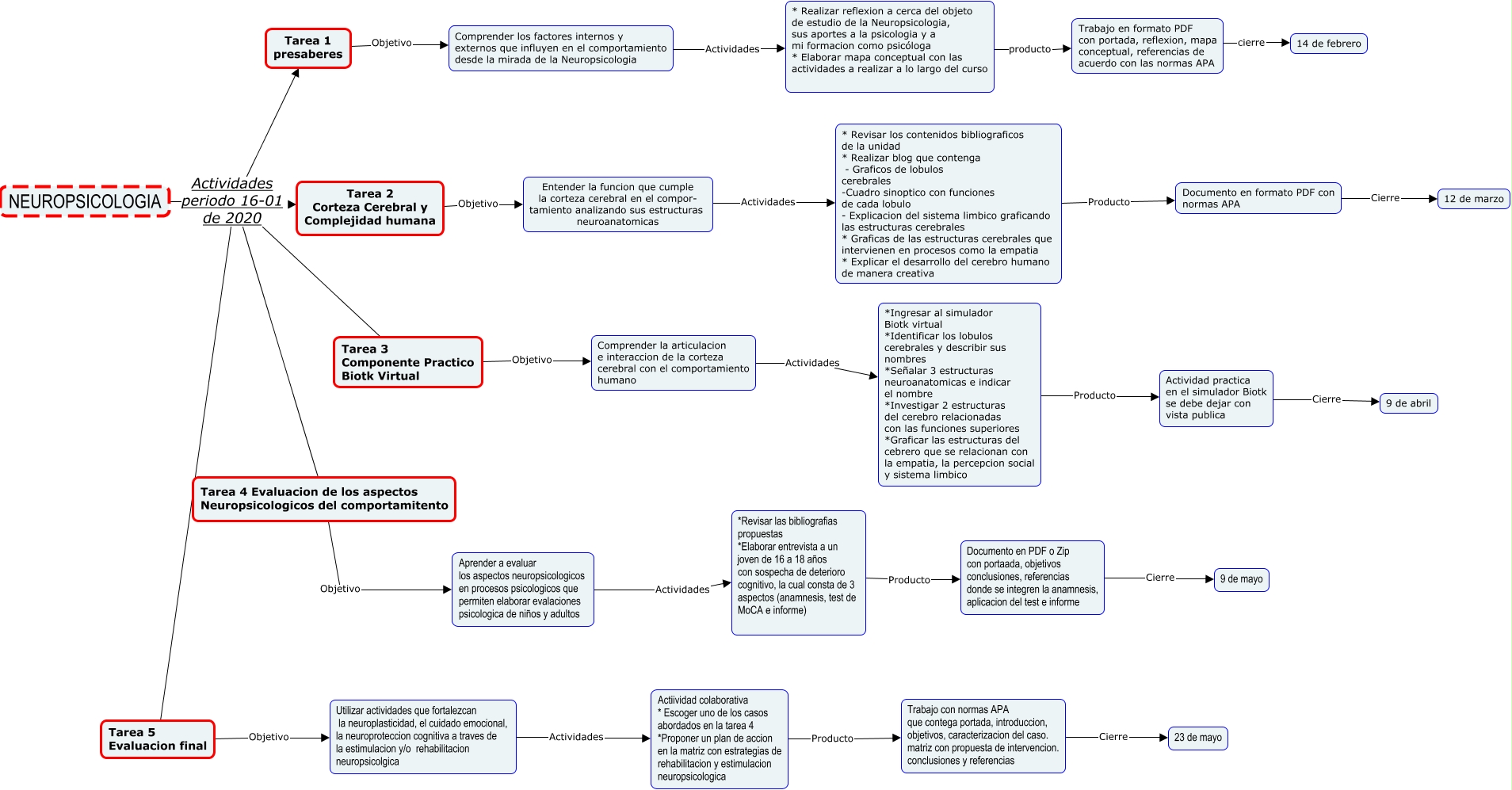 Este Cmap, tiene información relacionada con: TAREA 1 NEUROPSICOLOGIA, Utilizar actividades que fortalezcan la neuroplasticidad, el cuidado emocional, la neuroproteccion cognitiva a traves de la estimulacion y/o rehabilitacion neuropsicolgica Actividades Actiividad colaborativa * Escoger uno de los casos abordados en la tarea 4 *Proponer un plan de accion en la matriz con estrategias de rehabilitacion y estimulacion neuropsicologica, Documento en formato PDF con normas APA Cierre 12 de marzo, Entender la funcion que cumple la corteza cerebral en el compor- tamiento analizando sus estructuras neuroanatomicas Actividades * Revisar los contenidos bibliograficos de la unidad * Realizar blog que contenga - Graficos de lobulos cerebrales -Cuadro sinoptico con funciones de cada lobulo - Explicacion del sistema limbico graficando las estructuras cerebrales * Graficas de las estructuras cerebrales que intervienen en procesos como la empatia * Explicar el desarrollo del cerebro humano de manera creativa, NEUROPSICOLOGIA Actividades periodo 16-01 de 2020 Tarea 1 presaberes, * Realizar reflexion a cerca del objeto de estudio de la Neuropsicologia, sus aportes a la psicologia y a mi formacion como psicóloga * Elaborar mapa conceptual con las actividades a realizar a lo largo del curso producto Trabajo en formato PDF con portada, reflexion, mapa conceptual, referencias de acuerdo con las normas APA, Trabajo en formato PDF con portada, reflexion, mapa conceptual, referencias de acuerdo con las normas APA cierre 14 de febrero, Trabajo con normas APA que contega portada, introduccion, objetivos, caracterizacion del caso. matriz con propuesta de intervencion. conclusiones y referencias Cierre 23 de mayo, Tarea 5 Evaluacion final Objetivo Utilizar actividades que fortalezcan la neuroplasticidad, el cuidado emocional, la neuroproteccion cognitiva a traves de la estimulacion y/o rehabilitacion neuropsicolgica, NEUROPSICOLOGIA Actividades periodo 16-01 de 2020 Tarea 4 Evaluacion de los aspectos Neuropsicologicos del comportamitento, NEUROPSICOLOGIA Actividades periodo 16-01 de 2020 Tarea 3 Componente Practico Biotk Virtual, Tarea 4 Evaluacion de los aspectos Neuropsicologicos del comportamitento Objetivo Aprender a evaluar los aspectos neuropsicologicos en procesos psicologicos que permiten elaborar evalaciones psicologica de niños y adultos, Tarea 2 Corteza Cerebral y Complejidad humana Objetivo Entender la funcion que cumple la corteza cerebral en el compor- tamiento analizando sus estructuras neuroanatomicas, *Revisar las bibliografias propuestas *Elaborar entrevista a un joven de 16 a 18 años con sospecha de deterioro cognitivo, la cual consta de 3 aspectos (anamnesis, test de MoCA e informe) Producto Documento en PDF o Zip con portaada, objetivos conclusiones, referencias donde se integren la anamnesis, aplicacion del test e informe, Tarea 3 Componente Practico Biotk Virtual Objetivo Comprender la articulacion e interaccion de la corteza cerebral con el comportamiento humano, Tarea 1 presaberes Objetivo Comprender los factores internos y externos que influyen en el comportamiento desde la mirada de la Neuropsicologia, Documento en PDF o Zip con portaada, objetivos conclusiones, referencias donde se integren la anamnesis, aplicacion del test e informe Cierre 9 de mayo, Actividad practica en el simulador Biotk se debe dejar con vista publica Cierre 9 de abril, *Ingresar al simulador Biotk virtual *Identificar los lobulos cerebrales y describir sus nombres *Señalar 3 estructuras neuroanatomicas e indicar el nombre *Investigar 2 estructuras del cerebro relacionadas con las funciones superiores *Graficar las estructuras del cebrero que se relacionan con la empatia, la percepcion social y sistema limbico Producto Actividad practica en el simulador Biotk se debe dejar con vista publica, Comprender los factores internos y externos que influyen en el comportamiento desde la mirada de la Neuropsicologia Actividades * Realizar reflexion a cerca del objeto de estudio de la Neuropsicologia, sus aportes a la psicologia y a mi formacion como psicóloga * Elaborar mapa conceptual con las actividades a realizar a lo largo del curso, NEUROPSICOLOGIA Actividades periodo 16-01 de 2020 Tarea 2 Corteza Cerebral y Complejidad humana