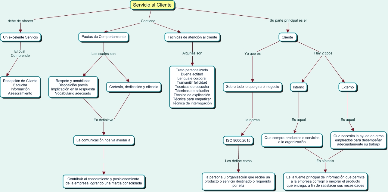 Este Cmap, tiene información relacionada con: Servicio al cliente, Que necesita la ayuda de otros empleados para desempeñar adecuadamente su trabajo En síntesis Es la fuente principal de información que permite a la empresa corregir o mejorar el producto que entrega, a fin de satisfacer sus necesidades, Servicio al Cliente Contiene Técnicas de atención al cliente, Cortesía, dedicación y eficacia En definitiva La comunicación nos va ayudar a, Pautas de Comportamiento Las cuales son Cortesía, dedicación y eficacia, Servicio al Cliente Su parte principal es el Cliente, Respeto y amabilidad Disposición previa Implicación en la respuesta Vocabulario adecuado En definitiva La comunicación nos va ayudar a, ISO 9000:2015 Los define como la persona u organización que recibe un producto o servicio destinado o requerido por ella, Servicio al Cliente Contiene Pautas de Comportamiento, Servicio al Cliente debe de ofrecer Un excelente Servicio, Interno Es aquel Que compra productos o servicios a la organización, Cliente Hay 2 tipos Interno, Externo Es aquel Que necesita la ayuda de otros empleados para desempeñar adecuadamente su trabajo, Que compra productos o servicios a la organización En síntesis Es la fuente principal de información que permite a la empresa corregir o mejorar el producto que entrega, a fin de satisfacer sus necesidades, Pautas de Comportamiento Las cuales son Respeto y amabilidad Disposición previa Implicación en la respuesta Vocabulario adecuado, Cliente Hay 2 tipos Externo, Técnicas de atención al cliente Algunas son Trato personalizado Buena actitud Lenguaje corporal Transmitir felicidad Técnicas de escucha Técnicas de solución Técnica de explicación Técnica para empatizar Técnica de interrogación, La comunicación nos va ayudar a Contribuir al conocimiento y posicionamiento de la empresa logrando una marca consolidada, Cliente Ya que es Sobre todo lo que gira el negocio, Sobre todo lo que gira el negocio la norma ISO 9000:2015, Un excelente Servicio El cual Comprende Recepción de Cliente Escucha Información Asesoramiento