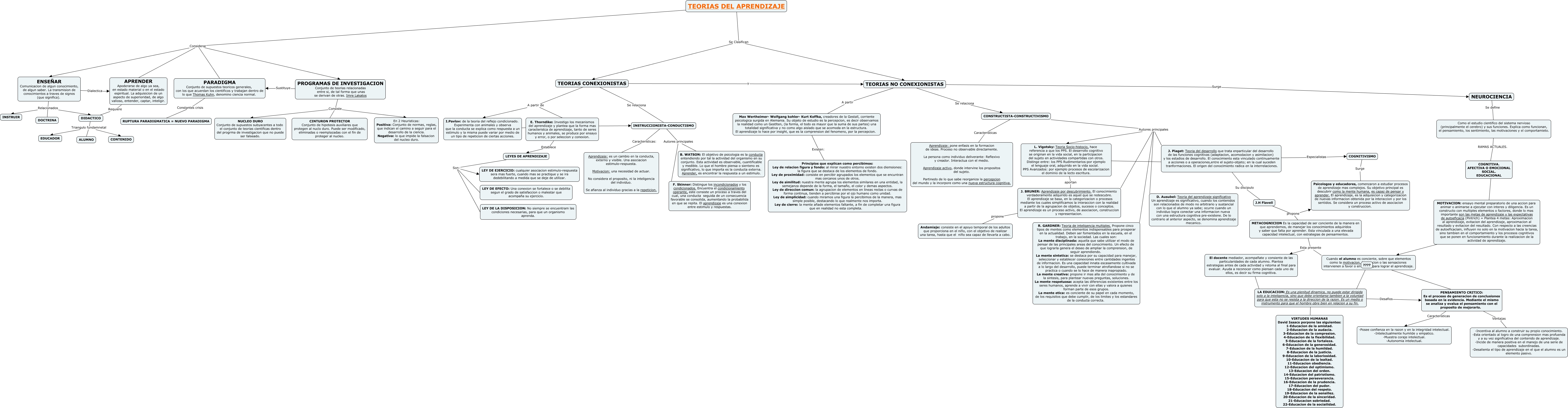 Este Cmap, tiene información relacionada con: TRAB. PRACT.OBLIG.- TEOR. DEL APREN, CONSTRUCTISTA-CONSTRUCTIVISMO Autores principales J. BRUNER: Aprendizaje por descubrimiento. El conocimiento verdaderamente adquirido es aquel que se redescubre. El aprendizaje se basa, en la categorizacion o procesos mediante los cuales simplificamos la interaccion con la realidad a partir de la agrupacion de objetos, sucesos o conceptos. El aprendizaje es un proceso activo, de asociacion, construccion y representacion., TEORIAS DEL APRENDIZAJE Considerar PARADIGMA Conjunto de supuestos teoricos generales, con los que acuerdan los cientificos y trabajan dentro de lo que Thomas Kuhn, denomino ciencia normal., PENSAMIENTO CRITICO: Es el proceso de generacion de conclusiones basada en la evidencia. Mediante el mismo se analiza y evalua el pensamiento con el proposito de mejorarlo. Ventajas -Incentiva al alumno a construir su propio conocimiento. -Esta orientado al logro de una comprension mas profuenda y a su vez significativa del contenido de aprendizaje. -Incide de manera positiva en el manejo de una serie de capacidades subordinadas. -Desalienta el tipo de aprendizaje en el que el alumno es un elemento pasivo., CONSTRUCTISTA-CONSTRUCTIVISMO Autores principales R. GARDNER: Teoria de inteligencia multiples. Propone cinco tipos de mentes como elementos indispensables para prosperar en la actualidad. Deben ser fomentados en la escuela, en el trabajo, en la sociedad. Las cuales son: La mente disciplinada: aquella que sabe utilizar el modo de pensar de las principales areas del conocimiento. Un efecto de que lograrla genera el deseo de ampliar la comprension, de seguir aprendiendo. La mente sintetica: se destaca por su capacidad para manejar, seleccionar y establecer conexiones entre cantidades ingentes de informacion. Es una capacidad innata escasamente cultivada a lo largo del desarrollo, puede terminar atrofiandose si no se practica o cuando se lo hace de manera inapropiado. La mente creativa: propone ir mas alla del conocimiento y de la sintesis, para plantear nuevas preguntas, soluciones. La mente respetuosa: acepta las diferencias existentes entre los seres humanos, aprende a vivir con ellas y valora a quienes forman parte de esos grupos. La mente etica: es conciente de su papel en cada momento, de los requisitos que debe cumplir, de los limites y los estandares de la conducta correcta., PARADIGMA Conjunto de supuestos teoricos generales, con los que acuerdan los cientificos y trabajan dentro de lo que Thomas Kuhn, denomino ciencia normal. Constantes crisis RUPTURA PARADIGMATICA = NUEVO PARADIGMA, MOTIVACION: ensayo mental preparatorio de una accion para animar o animarse a ejecutar con interes y diligencia. Es un constructo con multiples elementos o factores, donde lo mas importante son las metas de aprendizaje y las expectativas de autoeficacia (Pintrich) = Plantea 4 metas: Aproximacion al aprendizaje, evitacion del aprendizaje, aproximacion al resultado y evitacion del resultado. Con respecto a las creencias de autoeficaciain, influyen no solo en la motivacion hacia la tarea, sino tambien en el comportamiento y los procesos cognitivos que se ponen en funcionamiento durante la realizacion de la actividad de aprendizaje. ???? Cuando el alumno es conciente, sobre que elementos como la motivacion, la emocion o las sensaciones intervienen a favor o en contra para lograr el aprendizaje., J. Piaget: Teoria del desarrollo que trata enparticular del desarrollo de las funciones cognitivas (adaptacion, acomodacion y asimilacion) y los estadios de desarrollo. El conocimiento esta vinculado continuamente a acciones o a operaciones,entre el sujeto-objeto; en la cual suceden tranformaciones. El origen del conocimiento radica en la interrelaciones. Su discipulo J.H Flavell, LEYES DE APRENDIZAJE Son: LEY DE EJERCICIO: cualquier asociacion estimulo-respuesta sera mas fuerte, cuando mas se practique y se ira dedebilitando a medida que se deje de utilizar., PENSAMIENTO CRITICO: Es el proceso de generacion de conclusiones basada en la evidencia. Mediante el mismo se analiza y evalua el pensamiento con el proposito de mejorarlo. Caracteristicas -Posee confienza en la razon y en la integridad intelectual. -Intelectualmente humilde y empatico. -Muestra coraje intelectual. -Autonomia intelectual., METACOGNICION Es la capacidad de ser conciente de la manera en que aprendemos, de manejar los conocimientos adquiridos y saber que falta por aprender. Esta vinculada a una elevada capacidad intelectual, con estrategias de pensamientos. Esta presente El docente mediador, acompañate y consiente de las particularidades de cada alumno. Plantea estrategias antes de cada actividad y retoma al final para evaluar. Ayuda a reconocer como piensan cada uno de ellos, es decir su firma cognitiva., J. Piaget: Teoria del desarrollo que trata enparticular del desarrollo de las funciones cognitivas (adaptacion, acomodacion y asimilacion) y los estadios de desarrollo. El conocimiento esta vinculado continuamente a acciones o a operaciones,entre el sujeto-objeto; en la cual suceden tranformaciones. El origen del conocimiento radica en la interrelaciones. Especialistas COGNITIVISMO, J. BRUNER: Aprendizaje por descubrimiento. El conocimiento verdaderamente adquirido es aquel que se redescubre. El aprendizaje se basa, en la categorizacion o procesos mediante los cuales simplificamos la interaccion con la realidad a partir de la agrupacion de objetos, sucesos o conceptos. El aprendizaje es un proceso activo, de asociacion, construccion y representacion. propone Andamiaje: consiste en el apoyo temporal de los adultos que proporciona en el niño, con el objetivo de realizar una tarea, hasta que el niño sea capaz de llevarla a cabo., TEORIAS NO CONEXIONISTAS A partir Max Wertheimer- Wolfgang kohler- Kurt Koffka, creadores de la Gestall, corriente psicologica surgida en Alemania. Su objeto de estudio es la percepcion, es decir observamos la realidad como un