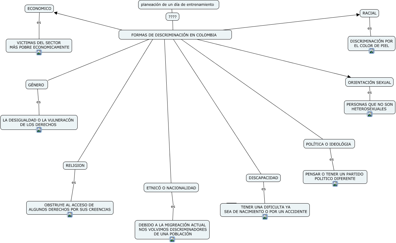 Este Cmap, tiene información relacionada con: MAPA CONCEPTUAL AREA SOCIALES, FORMAS DE DISCRIMINACIÓN EN COLOMBIA ???? ECONOMICO, RELIGION es OBSTRUYE AL ACCESO DE ALGUNOS DERECHOS POR SUS CREENCIAS, FORMAS DE DISCRIMINACIÓN EN COLOMBIA ???? GÉNERO, GÉNERO es LA DESIGUALDAD O LA VULNERACÓN DE LOS DERECHOS, RACIAL es DISCRIMINACIÓN POR EL COLOR DE PIEL, ECONOMICO es VICTIMAS DEL SECTOR MÁS POBRE ECONOMICAMENTE, FORMAS DE DISCRIMINACIÓN EN COLOMBIA ???? DISCAPACIDAD, FORMAS DE DISCRIMINACIÓN EN COLOMBIA ???? RACIAL, planeación de un día de entrenamiento ???? ????, DISCAPACIDAD es TENER UNA DIFICULTA YA SEA DE NACIMIENTO O POR UN ACCIDENTE, POLÍTICA O IDEOLÓGIA es PENSAR O TENER UN PARTIDO POLITICO DIFERENTE, FORMAS DE DISCRIMINACIÓN EN COLOMBIA ???? RELIGION, ORIENTACIÓN SEXUAL es PERSONAS QUE NO SON HETEROSEXUALES, FORMAS DE DISCRIMINACIÓN EN COLOMBIA ???? ETNICÓ O NACIONALIDAD, FORMAS DE DISCRIMINACIÓN EN COLOMBIA ???? POLÍTICA O IDEOLÓGIA, FORMAS DE DISCRIMINACIÓN EN COLOMBIA ???? ORIENTACIÓN SEXUAL, ETNICÓ O NACIONALIDAD es DEBIDO A LA MIGREACIÓN ACTUAL NOS VOLVIMOS DISCRIMINADORES DE UNA POBLACIÓN, ???? ???? FORMAS DE DISCRIMINACIÓN EN COLOMBIA