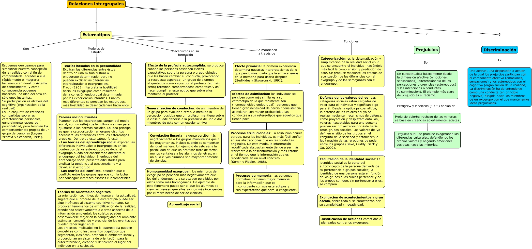 Este Cmap, tiene información relacionada con: PSocial-Estereotipos, prejuicios y discriminación, Estereotipos Se mantienen a través de Efecto primacía: la primera experiencia determina nuestras interpretaciones de lo que percibimos, dado que la almacenemos en la memoria para usarla después (Sedikides y Skowronski, 1991)., Estereotipos Funciones Facilitación de la identidad social: La identidad social es la parte del autoconcepto de la persona derivada de su pertenencia a grupos sociales; la identidad de una persona está en función de los grupos a los cuales pertenece y de los grupos con que, sin pertenecer a ellos, se compara., Estereotipos Funciones Categorización: es la sistematización y simplificación de la realidad social en la que se encuentra el individuo, haciéndole más fácil la comprensión y predicción de éste. Se produce mediante los efectos de acentuación de las diferencias con el exogrupo y de las semejanzas con el endogrupo., Relaciones intergrupales 3 Discriminación, Estereotipos Modelos de estudio Teorías socioculturales Plantean que los estereotipos surgen del medio social, son un reflejo de la cultura y sirven para ajustarse a las normas sociales. La idea principal es que la categorización en grupos distintos acentuará las diferencias entre los estereotipos grupales. Dentro de esta categoría están: - Las teorías del aprendizaje social explican las diferencias individuales o intergrupales en los contenidos de los estereotipos, es decir, el exogrupo pueda ser considerado diferente al endogrupo del individuo. El enfoque del aprendizaje social presenta dificultades para explicar la tendencia al etnocentrismo y a devaluar al exogrupo. - Las teorías del conflicto, postulan que el conflicto entre los grupos aparece con la lucha por conseguir intereses escasos e incompatibles., Estereotipos Mecanismos en su formación Generalización de conductas: de un miembro de un grupo para evaluar a otros. A menudo la percepción positiva que un profesor mantiene sobre la clase puede deberse a la presencia de uno o dos miembros de ésta con un excelente nivel., Relaciones intergrupales 1 Estereotipos, Estereotipos Se mantienen a través de Efectos de asimilación: los individuos se perciben como más similares a su estereotipo de lo que realmente son (homogeneidad endogrupal); personas que tienen gran necesidad de percibir consistencia asimilarán con mayor probabilidad las conductas a sus estereotipos que aquellos que tienen poca., Relaciones intergrupales 2 Prejuicios, Discriminación Es Una actitud, una disposición a actuar, de la cual los prejuicios participan con el componente afectivo (emociones, sensaciones) y los estereotipos con el cognitivo (organización de la realidad). La discriminación ha de entenderse como una conducta (en principio negativa) dirigida hacia los miembros de un exogrupo con el que mantenemos ideas prejuiciosas., Estereotipos Modelos de estudio Teorías basadas en la personalidad: Explican las diferencias entre éstos dentro de una misma cultura o endogrupo determinado, pero no pueden explicar las diferencias interculturales o intergrupales. Freud (1953) interpreta la hostilidad hacia los exogrupos como resultado de la cohesión endogrupal determinada por las experiencias infantiles. Cuanto más diferentes se perciban los exogrupos, más hostilidad se desencadenará hacia ellos., Estereotipos Funciones Justificación de acciones cometidas o planeadas contra los exogrupos., Estereotipos Se mantienen a través de Procesos de memoria: las personas normalmente tienen mejor memoria para la información que es incongruente con sus estereotipos y sus expectativas que para la congruente., Estereotipos Se mantienen a través de Procesos atribucionales: La atribución ocurre porque, para los individuos, es más fácil confiar en sus abstracciones que en las conductas originales. De este modo, la información recodificada abstractamente tiende a ser más resistente a la desconfirmación y más estable en el tiempo que la información que es recodificada en un nivel concreto (Semin y Fiedler, 1988)., Estereotipos Se mantienen a través de Efectos de asimilación: los individuos se perciben como más similares a su estereotipo de lo que realmente son (homogeneidad endogrupal); personas que tienen gran necesidad de percibir consistencia asimilarán con mayor probabilidad las conductas a sus estereotipos que aquellos que tienen poca., Estereotipos Mecanismos en su formación Efecto de la profecía autocumplida: se produce cuando las personas sostienen ciertas expectativas sobre la persona o grupo objetivo que les hacen cambiar su conducta, provocando la respuesta esperada; un grupo de alumnos etiquetados como vagos por el profesor (aun sin serlo) terminan comportándose como tales y así hacer cumplir el estereotipo que sobre ellos mantiene el profesor., Estereotipos Mecanismos en su formación Correlación ilusoria: la gente percibe más negativamente a los grupos minoritarios que a los mayoritarios, incluso cuando se comportan de igual manera. Un ejemplo de esto sería la posibilidad de que un profesor trate de forma menos ventajosa a los alumnos de letras, en un aula cuyos alumnos son mayoritariamente de ciencias., Estereotipos Funciones Defensa de los valores del yo: Las categorías sociales están cargadas de valor para el individuo y significan algo para él. Desde la óptica psicoanalítica, la defensa de los valores del yo se realiza mediante mecanismos de defensa, como proyección y desplazamiento. Así, valores inaceptables para una persona pueden ser proyectados por ésta hacia otros grupos sociales. Los valores del yo definen el sitio de los grupos en el conjunto de la sociedad y establecen la legitimación de las relaciones de poder entre los grupos (Fiske, Cuddy, Glick y Xu, 2002)., Estereotipos Mecanismos en su formación Aprendizaje social, Se conceptualiza básicamente desde la dimensión afectiva (emociones, sensaciones), diferenci
