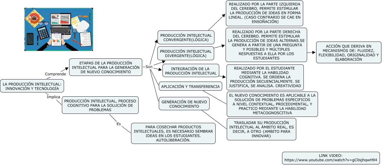 Este Cmap, tiene información relacionada con: La producción intelectual, ETAPAS DE LA PRODUCCIÓN INTELECTUAL PARA LA GENERACIÓN DE NUEVO CONOCIMIENTO Son PRODUCCIÓN INTELECTUAL CONVERGENTE(LÓGICA), PRODUCCIÓN INTELECTUAL CONVERGENTE(LÓGICA) ???? REALIZADO POR LA PARTE IZQUIERDA DEL CEREBRO. PERMITE ESTIMULAR LA PRODUCCIÓN DE IDEAS EN FORMA LINEAL. (CASO CONTRARIO SE CAE EN ENSOÑACIÓN), REALIZADO POR LA PARTE DERECHA DEL CEREBRO. PERMITE ESTIMULAR LA PRODUCCIÓN DE IDEAS ALTERNAS.SE GENERA A PARTIR DE UNA PREGUNTA Y POSIBLES Y MÚLTIPLES RESPUESTAS A ELLA POR LOS ESTUDIANTES ???? ACCIÓN QUE DERIVA EN MECANISMOS DE: FLUIDEZ, FLEXIBILIDAD, ORIGINALIDAD Y ELABORACIÓN, ETAPAS DE LA PRODUCCIÓN INTELECTUAL PARA LA GENERACIÓN DE NUEVO CONOCIMIENTO Son PRODUCCIÓN INTELECTUAL DIVERGENTE(LÓGICA), APLICACIÓN Y TRANSFERENCIA ???? EL NUEVO CONOCIMIENTO ES APLICABLE A LA SOLUCIÓN DE PROBLEMAS ESPECIFICOS A NIVEL CONTEXTUAL, PROCEDIMENTAL, Y PRACTICO MEDIANTE LA HABILIDAD METACOGNOSCITIVA, ETAPAS DE LA PRODUCCIÓN INTELECTUAL PARA LA GENERACIÓN DE NUEVO CONOCIMIENTO Son INTEGRACIÓN DE LA PRODUCCIÓN INTELECTUAL, ETAPAS DE LA PRODUCCIÓN INTELECTUAL PARA LA GENERACIÓN DE NUEVO CONOCIMIENTO Son GENERACIÓN DE NUEVO CONOCIMIENTO, PRODUCCIÓN INTELECTUAL, PROCESO COGNITIVO PARA LA SOLUCIÓN DE PROBLEMAS Es PARA COSECHAR PRODUCTOS INTELECTUALES, ES NECESARIO SEMBRAR IDEAS EN LOS ESTUDIANTES. AUTOLIBERACIÓN., PRODUCCIÓN INTELECTUAL DIVERGENTE(LÓGICA) ???? REALIZADO POR LA PARTE DERECHA DEL CEREBRO. PERMITE ESTIMULAR LA PRODUCCIÓN DE IDEAS ALTERNAS.SE GENERA A PARTIR DE UNA PREGUNTA Y POSIBLES Y MÚLTIPLES RESPUESTAS A ELLA POR LOS ESTUDIANTES, GENERACIÓN DE NUEVO CONOCIMIENTO ???? TRASLADAR SU PRODUCCIÓN INTELECTUAL AL ÁMBITO REAL, ES DECIR, A OTRO {AMBITO PARA INNOVAR}, INTEGRACIÓN DE LA PRODUCCIÓN INTELECTUAL ???? REALIZADO POR EL ESTUDIANTE MEDIANTE LA HABILIDAD COGNITIVA. SE ORDENA LA PRODUCCIÓN SECUENCIALMENTE. SE JUSTIFICA, SE ANALISA. CREATIVIDAD, LA PRODUCCIÓN INTELECTUAL: INNOVACIÓN Y TECNOLOGÍA Implica PRODUCCIÓN INTELECTUAL, PROCESO COGNITIVO PARA LA SOLUCIÓN DE PROBLEMAS, LA PRODUCCIÓN INTELECTUAL: INNOVACIÓN Y TECNOLOGÍA Comprende ETAPAS DE LA PRODUCCIÓN INTELECTUAL PARA LA GENERACIÓN DE NUEVO CONOCIMIENTO, ETAPAS DE LA PRODUCCIÓN INTELECTUAL PARA LA GENERACIÓN DE NUEVO CONOCIMIENTO Son APLICACIÓN Y TRANSFERENCIA