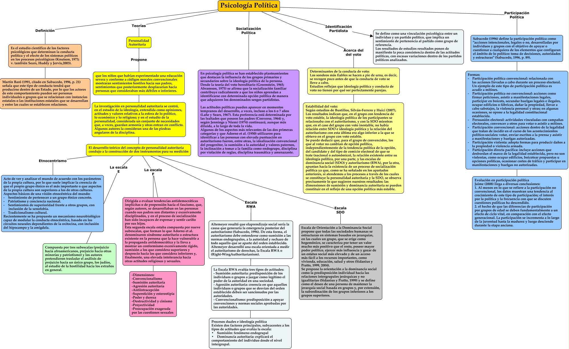 Este Cmap, tiene información relacionada con: Psicología Política-Fase 4, El desarrollo teórico del concepto de personalidad autoritaria condujo a la construcción de dos instrumentos para su medición Escala SDO Escala de Orientación a la Dominancia Social propone que todas las sociedades humanas se estructuran en sistemas basados en jerarquías, en las cuales un grupo, que se erige como hegemónico, se caracteriza por tener un valor mucho más positivo que el resto, poseer mayor poder político, ejercer más influencia y gozar de un estatus social más elevado y de un acceso más fácil a los recursos importantes, como vivienda, educación, salud y otros (Sidanius y Pratto, 1999, 2004). Se propone la orientación a la dominancia social como la predisposición individual hacia las relaciones intergrupales jerárquicas y no igualitarias (Sidanius y Pratto, 1999) y se define como el deseo de una persona de mantener la jerarquía social basada en grupos y, por extensión, la subordinación de los grupos inferiores a los grupos superiores., Psicología Política Acerca del del voto Determinantes de la conducta de voto: Los sondeos más fiables se hacen a pie de urna, es decir, se recogen poco antes de que la conducta de voto se lleve a cabo. Estudios reflejan que ideología política y conducta de voto no tienen por qué ser perfectamente parejas., El desarrollo teórico del concepto de personalidad autoritaria condujo a la construcción de dos instrumentos para su medición Escala RWA Procesos duales e ideología política Existen dos factores principales, subyacentes a los tipos de actitudes que evalúa la escala: • Sumisión: fenómeno endogrupal • Dominancia autoritaria: explicará el comportamiento del individuo desde el nivel intergrupal., El desarrollo teórico del concepto de personalidad autoritaria condujo a la construcción de dos instrumentos para su medición La escala E Compuesta por tres subescalas (prejuicio hacia afroamericanos, prejuicio hacia otras minorías y patriotismo) y los autores pretendieron trasladar el análisis de prejuicio hacia un único grupo, los judíos, al estudio de la hostilidad hacia los extraños en general., Personalidad Autoritaria ???? El desarrollo teórico del concepto de personalidad autoritaria condujo a la construcción de dos instrumentos para su medición, El desarrollo teórico del concepto de personalidad autoritaria condujo a la construcción de dos instrumentos para su medición La escala F Dirigida a evaluar tendencias antidemocráticas implícitas o de propensión hacia el fascismo, que, según autores, se desarrollaban en las personas cuando sus padres son distantes y excesivamente disciplinados, y en el proceso de socialización han sido incapaces de expresar y sentir cariño por sus hijos. Esta segunda escala estaba compuesta por nueve subescalas, que forman lo que Adorno et al. denominaron síndrome autoritario o estructura existente en la persona que la hace vulnerable a la propaganda antidemocrática y la lleva a mostrar un conformismo excesivamente rígido, sumisión a los que considera superiores y desprecio hacia los que considera inferiores y, finalmente, una elevada intolerancia hacia otras actitudes religiosas y sexuales., Psicología Política Participación Política Formas: - Participación política convencional: relacionada con las acciones llevadas a cabo durante un proceso electoral. Un ejemplo de este tipo de participación política es acudir a mítines. - Participación política no convencional: acciones como firmar peticiones, asistir a manifestaciones legales, participar en boicots, secundar huelgas legales e ilegales, ocupar edificios o fábricas, dañar la propiedad, llevar a cabo sabotajes, la violencia personal y otras; en algunas ocasiones, se opone a la legalidad constitucional establecida. - Persuasión electoral: actividades vinculadas con campañas electorales, convencer a otros para votar o asistir a mítines. - Participación convencional: acciones dentro de la legalidad que tratan de incidir en el curso de los acontecimientos político-sociales: votar, enviar escritos a la prensa y asistir a manifestaciones y huelgas autorizadas. - Participación violenta: adopta formas para producir daños a la propiedad o violencia armada. - Participación directa pacífica: incluye acciones que desbordan el marco de la legalidad establecida, pero no son violentas, como ocupar edificios, boicotear propuestas u opciones políticas, ocasionar cortes de tráfico y participar en manifestaciones y huelgas no autorizadas., Psicología Política Participación Política Sabucedo (1996) define la participación política como "acciones intencionales, legales o no, desarrolladas por individuos y grupos con el objetivo de apoyar o cuestionar a cualquiera de los elementos que configuran el ámbito de lo político: toma de decisiones, autoridades y estructuras" (Sabucedo, 1996, p. 89)., Psicología Política Acerca del del voto Estabilidad del voto: Según estudios de Bustillos, Silván-Ferrero y Huici (2007), Los resultados indican que, en el grupo con tendencia de voto estable, la ideología política de los participantes se relacionaba con el autoritarismo, y con la SDO mientras que, en el caso del grupo con voto inestable, no había relación entre SDO e ideología política y la relación del autoritarismo con esta última era algo inferior a la que se obtuvo en el grupo con voto estable. Se puede deducir que, para el grupo de convencidos, los que al votar no cambian de opción política, independientemente de la tendencia política de la opción, del candidato y del tipo de comicio electoral de que se trate (nacional o autonómico), la relación existente entre su ideología política, por una parte, y las escalas de dominancia social (SDO) y autoritarismo (RWA), por la otra, apuntan hacia la existencia de un proceso de socialización política ya que, como se ha señalado en los apartados anteriores, si atende