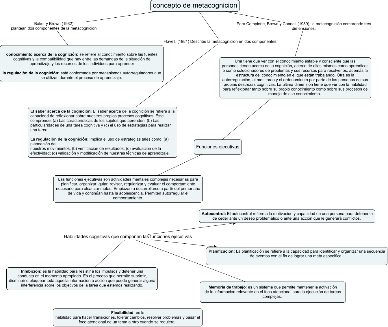Este Cmap, tiene información relacionada con: mapa conceptualy51, Una tiene que ver con el conocimiento estable y consciente que las personas tienen acerca de la cognición, acerca de ellos mismos como aprendices o como solucionadores de problemas y sus recursos para resolverlos, además la estructura del conocimiento en el que están trabajando. Otra es la autorregulación, el monitoreo y el ordenamiento por parte de las personas de sus propias destrezas cognitivas. La última dimensión tiene que ver con la habilidad para reflexionar tanto sobre su propio conocimiento como sobre sus procesos de manejo de ese conocimiento. ???? Funciones ejecutivas, Las funciones ejecutivas son actividades mentales complejas necesarias para planificar, organizar, guiar, revisar, regularizar y evaluar el comportamiento necesario para alcanzar metas. Empiezan a desarrollarse a partir del primer año de vida y continúan hasta la adolescencia. Permiten autorregular el comportamiento. Habilidades cognitivas que componen las funciones ejecutivas Flexibilidad: es la habilidad para hacer transiciones, tolerar cambios, resolver problemas y pasar el foco atencional de un tema a otro cuando se requiera., Las funciones ejecutivas son actividades mentales complejas necesarias para planificar, organizar, guiar, revisar, regularizar y evaluar el comportamiento necesario para alcanzar metas. Empiezan a desarrollarse a partir del primer año de vida y continúan hasta la adolescencia. Permiten autorregular el comportamiento. Habilidades cognitivas que componen las funciones ejecutivas Autocontrol: El autocontrol refiere a la motivación y capacidad de una persona para detenerse de ceder ante un deseo problemático o ante una acción que le generará conflictos., concepto de metacognicion Flavell, (1981) Describe la metacognición en dos componentes: El saber acerca de la cognición: El saber acerca de la cognición se refiere a la capacidad de reflexionar sobre nuestros propios procesos cognitivos. Éste comprende: (a) Las características de los sujetos que aprenden; (b) Las particularidades de una tarea cognitiva y (c) el uso de estrategias para realizar una tarea. La regulación de la cognición: Implica el uso de estrategias tales como: (a) planeación de nuestros movimientos; (b) verificación de resultados; (c) evaluación de la efectividad; (d) validación y modificación de nuestras técnicas de aprendizaje., Las funciones ejecutivas son actividades mentales complejas necesarias para planificar, organizar, guiar, revisar, regularizar y evaluar el comportamiento necesario para alcanzar metas. Empiezan a desarrollarse a partir del primer año de vida y continúan hasta la adolescencia. Permiten autorregular el comportamiento. Habilidades cognitivas que componen las funciones ejecutivas Planificacion: La planificación se refiere a la capacidad para identificar y organizar una secuencia de eventos con el fin de lograr una meta específica., Funciones ejecutivas ???? Las funciones ejecutivas son actividades mentales complejas necesarias para planificar, organizar, guiar, revisar, regularizar y evaluar el comportamiento necesario para alcanzar metas. Empiezan a desarrollarse a partir del primer año de vida y continúan hasta la adolescencia. Permiten autorregular el comportamiento., concepto de metacognicion Para Campione, Brown y Connell (1989), la metacognición comprende tres dimensiones: ????, Las funciones ejecutivas son actividades mentales complejas necesarias para planificar, organizar, guiar, revisar, regularizar y evaluar el comportamiento necesario para alcanzar metas. Empiezan a desarrollarse a partir del primer año de vida y continúan hasta la adolescencia. Permiten autorregular el comportamiento. Habilidades cognitivas que componen las funciones ejecutivas Inhibicion: es la habilidad para resistir a los impulsos y detener una conducta en el momento apropiado. Es el proceso que permite suprimir, disminuir o bloquear toda aquella información o acción que puede generar alguna interferencia sobre los objetivos de la tarea que estemos realizando., concepto de metacognicion Baker y Brown (1982) plantean dos componentes de la metacognicion conocimiento acerca de la cognición: se refiere al conocimiento sobre las fuentes cognitivas y la compatibilidad que hay entre las demandas de la situación de aprendizaje y los recursos de los individuos para aprender la regulación de la cognición: está conformada por mecanismos autorreguladores que se utilizan durante el proceso de aprendizaje., Las funciones ejecutivas son actividades mentales complejas necesarias para planificar, organizar, guiar, revisar, regularizar y evaluar el comportamiento necesario para alcanzar metas. Empiezan a desarrollarse a partir del primer año de vida y continúan hasta la adolescencia. Permiten autorregular el comportamiento. Habilidades cognitivas que componen las funciones ejecutivas Memoria de trabajo: es un sistema que permite mantener la activación de la información relevante en el foco atencional para la ejecución de tareas complejas.