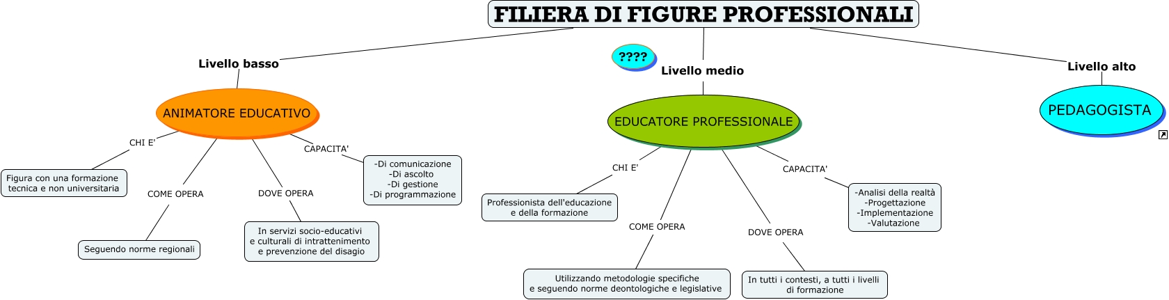 Questa Cmap, creata con IHMC CmapTools, contiene informazioni relative a: mappa generale, ANIMATORE EDUCATIVO DOVE OPERA In servizi socio-educativi e culturali di intrattenimento e prevenzione del disagio, FILIERA DI FIGURE PROFESSIONALI Livello alto PEDAGOGISTA, FILIERA DI FIGURE PROFESSIONALI Livello medio EDUCATORE PROFESSIONALE, EDUCATORE PROFESSIONALE CHI E' Professionista dell'educazione e della formazione, FILIERA DI FIGURE PROFESSIONALI Livello basso ANIMATORE EDUCATIVO, EDUCATORE PROFESSIONALE COME OPERA Utilizzando metodologie specifiche e seguendo norme deontologiche e legislative, EDUCATORE PROFESSIONALE DOVE OPERA In tutti i contesti, a tutti i livelli di formazione, ANIMATORE EDUCATIVO CHI E' Figura con una formazione tecnica e non universitaria, EDUCATORE PROFESSIONALE CAPACITA' -Analisi della realtà -Progettazione -Implementazione -Valutazione, ANIMATORE EDUCATIVO CAPACITA' -Di comunicazione -Di ascolto -Di gestione -Di programmazione, ANIMATORE EDUCATIVO COME OPERA Seguendo norme regionali