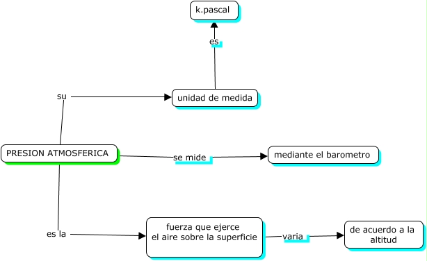 Este Cmap, tiene información relacionada con: mapa conceptual 9, unidad de medida es k.pascal, PRESION ATMOSFERICA es la fuerza que ejerce el aire sobre la superficie, fuerza que ejerce el aire sobre la superficie varia de acuerdo a la altitud, PRESION ATMOSFERICA su unidad de medida, PRESION ATMOSFERICA se mide mediante el barometro