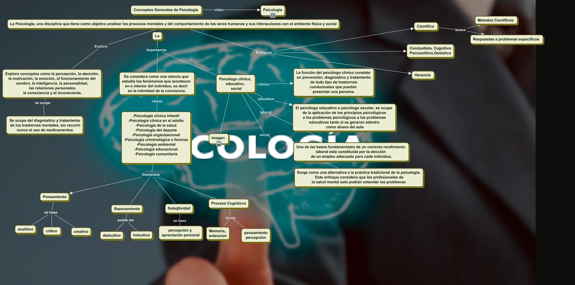 Este Cmap, tiene información relacionada con: Mapa Semantico, iSAE, Psicólogo clínico, educativo, social educativo El psícólogo educativo o psicólogo escolar, se ocupa de la aplicación de los principios psicológicos a los problemas psicológicos a los problemas educativos tanto si se generan adentro como afuera del aula, Cientifico busca Metodos Cientificos, Razonamiento puede ser deductivo, Razonamiento puede ser inductivo, Psicólogo clínico, educativo, social laboral Una de las bases fundamentales de un correcto rendimiento laboral está constituida por la elección de un empleo adecuado para cada individuo,, La Psicologïa, una disciplina que tiene como objetivo analizar los procesos mentales y del comportamiento de los seres humanos y sus interacciones con el ambiente físico y social Enfoques Cientifico, Pensamiento se basa analitico, Es considera como una ciencia que estudia los fenómenos que acontecen en e interior del individuo, es decir en la intimidad de la conciencia. clases -Psicología clínica infantil -Psicología clínica en el adulto -Psicología de la salud -Psicología del deporte -Psicología organizacional -Psicología criminológica o forense -Psicología ambiental -Psicología educacional -Psicología comunitaria, -Psicología clínica infantil -Psicología clínica en el adulto -Psicología de la salud -Psicología del deporte -Psicología organizacional -Psicología criminológica o forense -Psicología ambiental -Psicología educacional -Psicología comunitaria Elementos Subejtividad, La Psicologïa, una disciplina que tiene como objetivo analizar los procesos mentales y del comportamiento de los seres humanos y sus interacciones con el ambiente físico y social Enfoques Condustista, Cognitivo Psicoanlítico,Gestalico, Proceso Cognitovo divide pensamiento percepción, La Importancia Psicólogo clínico, educativo, social, Cientifico busca Respuestas a problemas especificos, Explora conceptos como la percepción, la atención, la motivación, la emoción, el funcionamiento del cerebro, la inteligencia, la personalidad, las relaciones personales, la consciencia y el inconsciente. se ocupa Se ocupa del diagnóstico y tratamiento de los trastornos mentales, sin recurrir nunca al uso de medicamentos., -Psicología clínica infantil -Psicología clínica en el adulto -Psicología de la salud -Psicología del deporte -Psicología organizacional -Psicología criminológica o forense -Psicología ambiental -Psicología educacional -Psicología comunitaria Elementos Pensamiento, -Psicología clínica infantil -Psicología clínica en el adulto -Psicología de la salud -Psicología del deporte -Psicología organizacional -Psicología criminológica o forense -Psicología ambiental -Psicología educacional -Psicología comunitaria Elementos Razonamiento, La Importancia Es considera como una ciencia que estudia los fenómenos que acontecen en e interior del individuo, es decir en la intimidad de la conciencia., Psicólogo clínico, educativo, social ???? imagen, La Psicologïa, una disciplina que tiene como objetivo analizar los procesos mentales y del comportamiento de los seres humanos y sus interacciones con el ambiente físico y social Enfoques Herencia, Psicólogo clínico, educativo, social clínico La función del psicólogo clínico consiste en prevensión, diagnostico y tratamiento de todo tipo de trastornos conductuales que puedan presentar una persona.