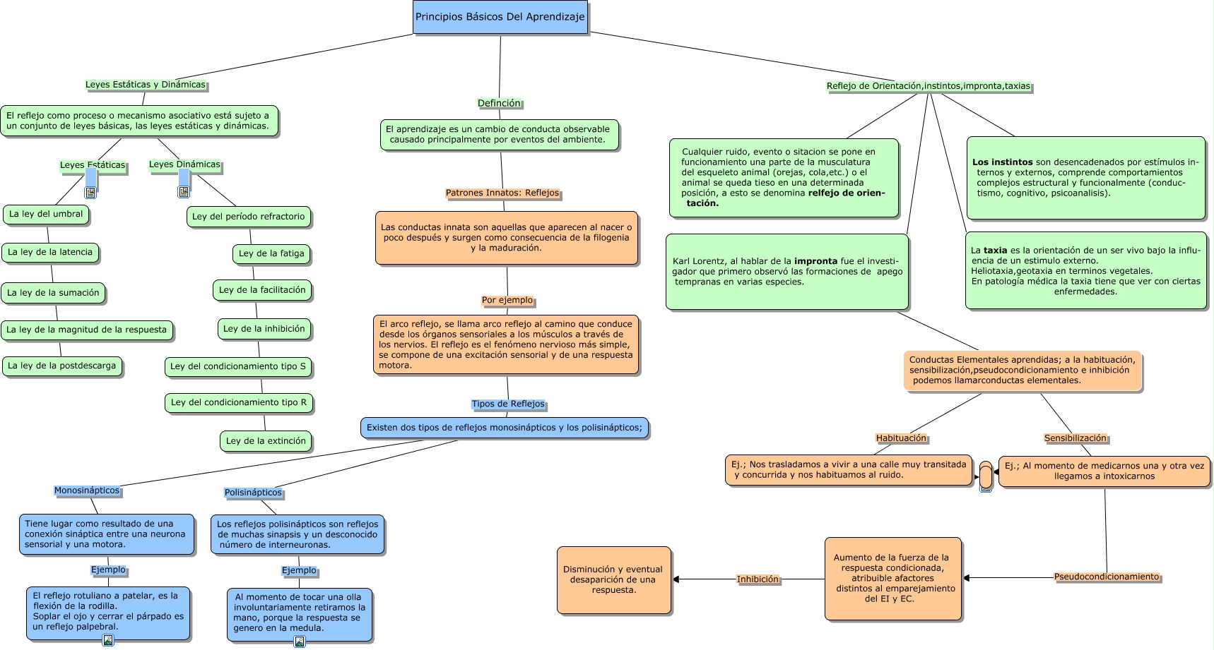 Este Cmap, tiene información relacionada con: Principios Basicos del Aprendizaje (3), Principios Básicos Del Aprendizaje Reflejo de Orientación,instintos,impronta,taxias Karl Lorentz, al hablar de la impronta fue el investi- gador que primero observó las formaciones de apego tempranas en varias especies., Ej.; Nos trasladamos a vivir a una calle muy transitada y concurrida y nos habituamos al ruido. ????, El aprendizaje es un cambio de conducta observable causado principalmente por eventos del ambiente. Patrones Innatos: Reflejos Las conductas innata son aquellas que aparecen al nacer o poco después y surgen como consecuencia de la filogenia y la maduración., Existen dos tipos de reflejos monosinápticos y los polisinápticos; Monosinápticos Tiene lugar como resultado de una conexión sináptica entre una neurona sensorial y una motora., Ley del período refractorio ???? Ley de la extinción, Principios Básicos Del Aprendizaje Reflejo de Orientación,instintos,impronta,taxias La taxia es la orientación de un ser vivo bajo la influ- encia de un estimulo externo. Heliotaxia,geotaxia en terminos vegetales. En patología médica la taxia tiene que ver con ciertas enfermedades., Principios Básicos Del Aprendizaje Reflejo de Orientación,instintos,impronta,taxias Cualquier ruido, evento o sitacion se pone en funcionamiento una parte de la musculatura del esqueleto animal (orejas, cola,etc.) o el animal se queda tieso en una determinada posición, a esto se denomina relfejo de orien- tación., La ley del umbral ???? La ley de la postdescarga, Existen dos tipos de reflejos monosinápticos y los polisinápticos; Polisinápticos Los reflejos polisinápticos son reflejos de muchas sinapsis y un desconocido número de interneuronas., Principios Básicos Del Aprendizaje Leyes Estáticas y Dinámicas El reflejo como proceso o mecanismo asociativo está sujeto a un conjunto de leyes básicas, las leyes estáticas y dinámicas., Ej.; Al momento de medicarnos una y otra vez llegamos a intoxicarnos Pseudocondicionamiento Aumento de la fuerza de la respuesta condicionada, atribuible afactores distintos al emparejamiento del EI y EC., Karl Lorentz, al hablar de la impronta fue el investi- gador que primero observó las formaciones de apego tempranas en varias especies. ???? Conductas Elementales aprendidas; a la habituación, sensibilización,pseudocondicionamiento e inhibición podemos llamarconductas elementales., Los reflejos polisinápticos son reflejos de muchas sinapsis y un desconocido número de interneuronas. Ejemplo Al momento de tocar una olla involuntariamente retiramos la mano, porque la respuesta se genero en la medula., El arco reflejo, se llama arco reflejo al camino que conduce desde los órganos sensoriales a los músculos a través de los nervios. El reflejo es el fenómeno nervioso más simple, se compone de una excitación sensorial y de una respuesta motora. Tipos de Reflejos Existen dos tipos de reflejos monosinápticos y los polisinápticos;, El reflejo como proceso o mecanismo asociativo está sujeto a un conjunto de leyes básicas, las leyes estáticas y dinámicas. Leyes Estáticas La ley del umbral, Las conductas innata son aquellas que aparecen al nacer o poco después y surgen como consecuencia de la filogenia y la maduración. Por ejemplo El arco reflejo, se llama arco reflejo al camino que conduce desde los órganos sensoriales a los músculos a través de los nervios. El reflejo es el fenómeno nervioso más simple, se compone de una excitación sensorial y de una respuesta motora., Ej.; Al momento de medicarnos una y otra vez llegamos a intoxicarnos ????, Conductas Elementales aprendidas; a la habituación, sensibilización,pseudocondicionamiento e inhibición podemos llamarconductas elementales. Habituación Ej.; Nos trasladamos a vivir a una calle muy transitada y concurrida y nos habituamos al ruido., Conductas Elementales aprendidas; a la habituación, sensibilización,pseudocondicionamiento e inhibición podemos llamarconductas elementales. Sensibilización Ej.; Al momento de medicarnos una y otra vez llegamos a intoxicarnos, Principios Básicos Del Aprendizaje Reflejo de Orientación,instintos,impronta,taxias Los instintos son desencadenados por estímulos in- ternos y externos, comprende comportamientos complejos estructural y funcionalmente (conduc- tismo, cognitivo, psicoanalisis).
