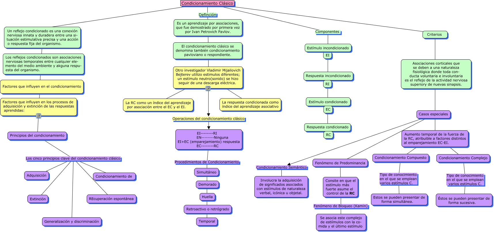 Este Cmap, tiene información relacionada con: Condicionamiento Clásico (3), Consite en que el estímulo más fuerte asume el control de la RC Fenómeno de Bloqueo (Kamin) Se asocia este complejo de estiímulos con la co- mida y el último estímulo, Criterios ???? Aumento temporal de la fuerza de la RC, atribuible a factores distintos al emparejamiento EC-EI., Principios del condicionamiento Los cinco principios clave del condicionamiento clásico Extinción, Condicionamiento Clásico Componentes Respuesta condicionado, EI--------RI EN--------Ninguna EI+EC (emparejamiento) respuesta EC--------RC Procedimientos de Condicionamiento Temporal, Es un aprendizaje por asociaciones, que fue demostrado por primera vez por Ivan Petrovich Pavlov. Otro investigador Vladimir Mijailovich Bejterev utilizo estimulos diferentes; un estímulo neutro(sonido) se hizo seguir de una descarga eléctrica., Principios del condicionamiento Los cinco principios clave del condicionamiento clásico Generalización y discriminación, Aumento temporal de la fuerza de la RC, atribuible a factores distintos al emparejamiento EC-EI. ???? Condicionamiento Complejo, Fenómeno de Predominancia ???? Consite en que el estímulo más fuerte asume el control de la RC, Otro investigador Vladimir Mijailovich Bejterev utilizo estimulos diferentes; un estímulo neutro(sonido) se hizo seguir de una descarga eléctrica. ???? La respuesta condicionada como índice del aprendizaje asociativo, Condicionamiento Clásico ???? Criterios, Condicionamiento Complejo Tipo de conocimiento en el que se emplean varios estímulos C. Éstos se pueden presentar de forma sucesiva., Principios del condicionamiento Los cinco principios clave del condicionamiento clásico REcuperación espontánea, Casos especiales Condicionamiento Semántico Involucra la adquisición de significados asociados con estímulos de naturaleza verbal, icónica u objetal., Principios del condicionamiento Los cinco principios clave del condicionamiento clásico Condicionamiento de, Condicionamiento Clásico Definción Es un aprendizaje por asociaciones, que fue demostrado por primera vez por Ivan Petrovich Pavlov., Otro investigador Vladimir Mijailovich Bejterev utilizo estimulos diferentes; un estímulo neutro(sonido) se hizo seguir de una descarga eléctrica. ???? La RC como un índice del aprendizaje por asociación entre el EC y el EI., Principios del condicionamiento Los cinco principios clave del condicionamiento clásico Adquisición, Condicionamiento Clásico ???? Un reflejo condicionado es una conexión nerviosa innata y duradera entre una si- tuación estimulativa precisa y una acción o respuesta fija del organismo., Aumento temporal de la fuerza de la RC, atribuible a factores distintos al emparejamiento EC-EI. ???? Condicionamiento Compuesto