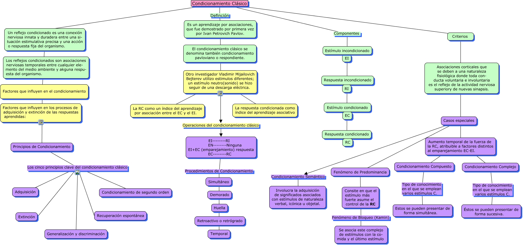 Este Cmap, tiene información relacionada con: Condicionamiento Clásico, Consite en que el estímulo más fuerte asume el control de la RC Fenómeno de Bloqueo (Kamin) Se asocia este complejo de estiímulos con la co- mida y el último estímulo, Principios de Condicionamiento Los cinco principios clave del condicionamiento clásico Extinción, Criterios ???? Aumento temporal de la fuerza de la RC, atribuible a factores distintos al emparejamiento EC-EI., EI--------RI EN--------Ninguna EI+EC (emparejamiento) respuesta EC--------RC Procedimientos de Condicionamiento Temporal, Condicionamiento Clásico Componentes Respuesta condicionado, Es un aprendizaje por asociaciones, que fue demostrado por primera vez por Ivan Petrovich Pavlov. Otro investigador Vladimir Mijailovich Bejterev utilizo estimulos diferentes; un estímulo neutro(sonido) se hizo seguir de una descarga eléctrica., Principios de Condicionamiento Los cinco principios clave del condicionamiento clásico Generalización y discriminación, Fenómeno de Predominancia ???? Consite en que el estímulo más fuerte asume el control de la RC, Aumento temporal de la fuerza de la RC, atribuible a factores distintos al emparejamiento EC-EI. ???? Condicionamiento Complejo, Principios de Condicionamiento Los cinco principios clave del condicionamiento clásico Recuperación espontánea, Condicionamiento Clásico ???? Criterios, Condicionamiento Complejo Tipo de conocimiento en el que se emplean varios estímulos C. Éstos se pueden presentar de forma sucesiva., Otro investigador Vladimir Mijailovich Bejterev utilizo estimulos diferentes; un estímulo neutro(sonido) se hizo seguir de una descarga eléctrica. ???? La respuesta condicionada como índice del aprendizaje asociativo, Casos especiales Condicionamiento Semántico Involucra la adquisición de significados asociados con estímulos de naturaleza verbal, icónica u objetal., Principios de Condicionamiento Los cinco principios clave del condicionamiento clásico Condicionamiento de segundo orden, Condicionamiento Clásico Definción Es un aprendizaje por asociaciones, que fue demostrado por primera vez por Ivan Petrovich Pavlov., Otro investigador Vladimir Mijailovich Bejterev utilizo estimulos diferentes; un estímulo neutro(sonido) se hizo seguir de una descarga eléctrica. ???? La RC como un índice del aprendizaje por asociación entre el EC y el EI., Principios de Condicionamiento Los cinco principios clave del condicionamiento clásico Adquisición, Condicionamiento Clásico ???? Un reflejo condicionado es una conexión nerviosa innata y duradera entre una si- tuación estimulativa precisa y una acción o respuesta fija del organismo., Aumento temporal de la fuerza de la RC, atribuible a factores distintos al emparejamiento EC-EI. ???? Condicionamiento Compuesto