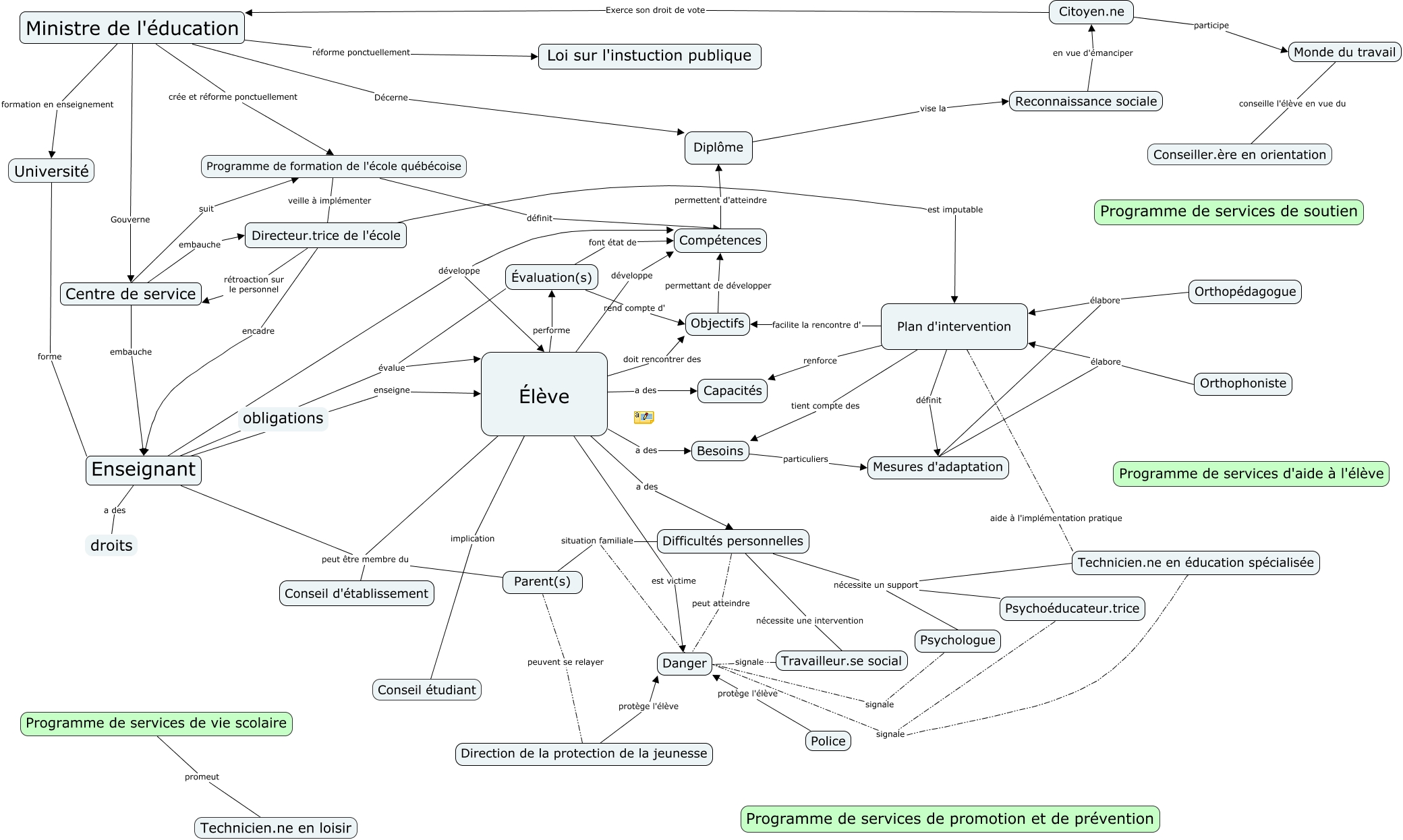 Cette carte de concepts créée avec IHMC CmapTools traite de: TP3_v1, Programme de formation de l'école québécoise définit Compétences, Parent(s) situation familiale Difficultés personnelles, Orthophoniste élabore Mesures d'adaptation, Difficultés personnelles peut atteindre Danger, Évaluation(s) évalue Élève, Orthophoniste élabore Plan d'intervention, Diplôme vise la Reconnaissance sociale, Reconnaissance sociale en vue d'émanciper Citoyen.ne, Directeur.trice de l'école encadre Enseignant, Élève développe Compétences, Difficultés personnelles nécessite un support Psychoéducateur.trice, Citoyen.ne participe Monde du travail, Enseignant peut être membre du Conseil d'établissement, Conseiller.ère en orientation conseille l'élève en vue du Monde du travail, Parent(s) peut être membre du Conseil d'établissement, Plan d'intervention renforce Capacités, Travailleur.se social signale Danger, Enseignant développe Élève, Plan d'intervention aide à l'implémentation pratique Technicien.ne en éducation spécialisée, Orthopédagogue élabore Plan d'intervention