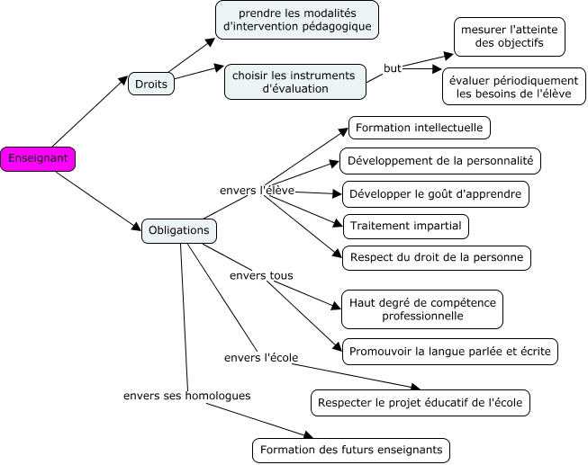 Cette carte de concepts créée avec IHMC CmapTools traite de: Droits et obligations de l'enseignant, Droits prendre les modalités d'intervention pédagogique, Obligations envers l'élève Formation intellectuelle, choisir les instruments d'évaluation but mesurer l'atteinte des objectifs, Obligations envers tous Haut degré de compétence professionnelle, Obligations envers tous Promouvoir la langue parlée et écrite, Droits choisir les instruments d'évaluation, Obligations envers l'élève Développer le goût d'apprendre, Obligations envers l'élève Respect du droit de la personne, Obligations envers l'élève Traitement impartial, Obligations envers l'élève Développement de la personnalité, Obligations envers ses homologues Formation des futurs enseignants, Obligations envers l'école Respecter le projet éducatif de l'école, choisir les instruments d'évaluation but évaluer périodiquement les besoins de l'élève, Enseignant Droits, Enseignant Obligations