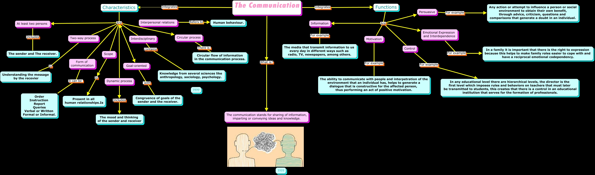 Este Cmap, tiene información relacionada con: Mapa Ingles, Dynamic process Includes The mood and thinking of the sender and receiver, Form of communication It can be Order Instruction Report Queries Verbal or Written Formal or Informal., Characteristics Are Goal-oriented, Functions Are Persuasive, The Communication Integrates Functions, Control For example In any educational level there are hierarchical levels, the director is the first level which imposes rules and behaviors on teachers that must later be transmitted to students, this creates that there is a control in an educational institution that serves for the formation of professionals., Information For example The media that transmit information to us every day in different ways such as radio, TV, newspapers, among others., Characteristics Are Scope, Characteristics Are At least two persons, Functions Are Information, Characteristics Are Dynamic process, Motivation For example The ability to communicate with people and interpetration of the environment that an individual has, helps to generate a dialogue that is constructive for the affected person, thus performing an act of positive motivation., Emotional Expression and Interdependence For example In a family it is important that there is the right to expression because this helps to make family roles easier to cope with and have a reciprocal emotional codependency., Characteristics Are Circular process, Functions Are Emotional Expression and Interdependence, Functions Are Control, Interpersonal relations Refers to Human behaviour., Characteristics Are Two-way process, Persuasive For example Any action or attempt to influence a person or social environment to obtain their own benefit, through advice, criticism, questions and comparisons that generate a doubt in an individual., Interdisciplinary contains Knowledge from several sciences like anthropology, sociology, psychology.
