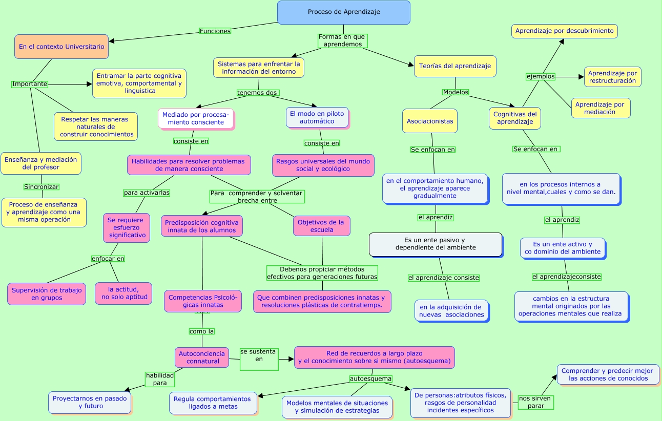 Este Cmap, tiene información relacionada con: Ambientes promotores para el aprendizaje Eje 1, En el contexto Universitario Importante Entramar la parte cognitiva emotiva, comportamental y linguistica, En el contexto Universitario Importante Respetar las maneras naturales de construir conocimientos, Predisposición cognitiva innata de los alumnos ???? Competencias Psicoló- gicas innatas, Autoconciencia connatural se sustenta en Red de recuerdos a largo plazo y el conocimiento sobre si mismo (autoesquema), Proceso de Aprendizaje Funciones En el contexto Universitario, El modo en piloto automático consiste en Rasgos universales del mundo social y ecológico, en los procesos internos a nivel mental,cuales y como se dan. el aprendiz Es un ente activo y co dominio del ambiente, Predisposición cognitiva innata de los alumnos Debenos propiciar métodos efectivos para generaciones futuras Que combinen predisposiciones innatas y resoluciones plásticas de contratiemps., Cognitivas del aprendizaje ejemplos Aprendizaje por restructuración, Sistemas para enfrentar la información del entorno tenemos dos Mediado por procesa- miento consciente, Teorías del aprendizaje Modelos Cognitivas del aprendizaje, Enseñanza y mediación del profesor Sincronizar Proceso de enseñanza y aprendizaje como una misma operación, Se requiere esfuerzo significativo enfocar en la actitud, no solo aptitud, Red de recuerdos a largo plazo y el conocimiento sobre si mismo (autoesquema) autoesquema De personas:atributos físicos, rasgos de personalidad incidentes específicos, Asociacionistas Se enfocan en en el comportamiento humano, el aprendizaje aparece gradualmente, Habilidades para resolver problemas de manera consciente Para comprender y solventar brecha entre Objetivos de la escuela, Cognitivas del aprendizaje ejemplos Aprendizaje por mediación, Proceso de Aprendizaje Formas en que aprendemos Sistemas para enfrentar la información del entorno, Proceso de Aprendizaje Formas en que aprendemos Teorías del aprendizaje, En el contexto Universitario Importante Enseñanza y mediación del profesor