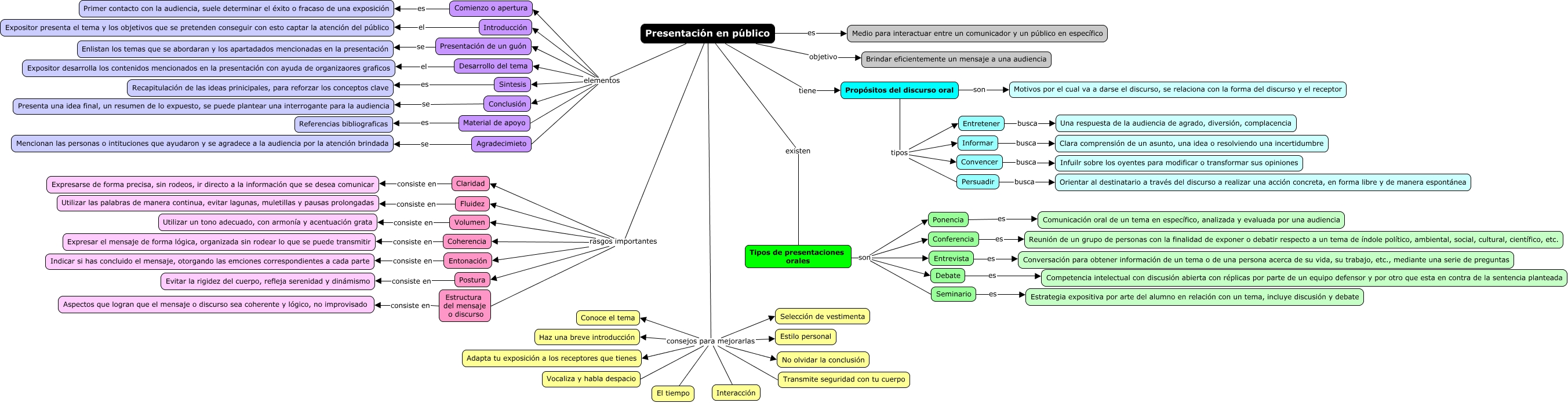 Este Cmap, tiene información relacionada con: Presentación en público, Presentación en público consejos para mejorarlas Transmite seguridad con tu cuerpo, Presentación en público rasgos importantes Estructura del mensaje o discurso, Comienzo o apertura es Primer contacto con la audiencia, suele determinar el éxito o fracaso de una exposición, Entretener busca Una respuesta de la audiencia de agrado, diversión, complacencia, Propósitos del discurso oral tipos Persuadir, Presentación en público es Medio para interactuar entre un comunicador y un público en específico, Tipos de presentaciones orales son Debate, Tipos de presentaciones orales son Entrevista, Tipos de presentaciones orales son Ponencia, Presentación en público elementos Sintesis, Agradecimieto se Mencionan las personas o intituciones que ayudaron y se agradece a la audiencia por la atención brindada, Entrevista es Conversación para obtener información de un tema o de una persona acerca de su vida, su trabajo, etc., mediante una serie de preguntas, Introducción el Expositor presenta el tema y los objetivos que se pretenden conseguir con esto captar la atención del público, Postura consiste en Evitar la rigidez del cuerpo, refleja serenidad y dinámismo, Presentación en público consejos para mejorarlas Interacción, Conferencia es Reunión de un grupo de personas con la finalidad de exponer o debatir respecto a un tema de índole político, ambiental, social, cultural, científico, etc., Presentación en público tiene Propósitos del discurso oral, Presentación en público rasgos importantes Claridad, Presentación en público rasgos importantes Volumen, Presentación en público consejos para mejorarlas Adapta tu exposición a los receptores que tienes