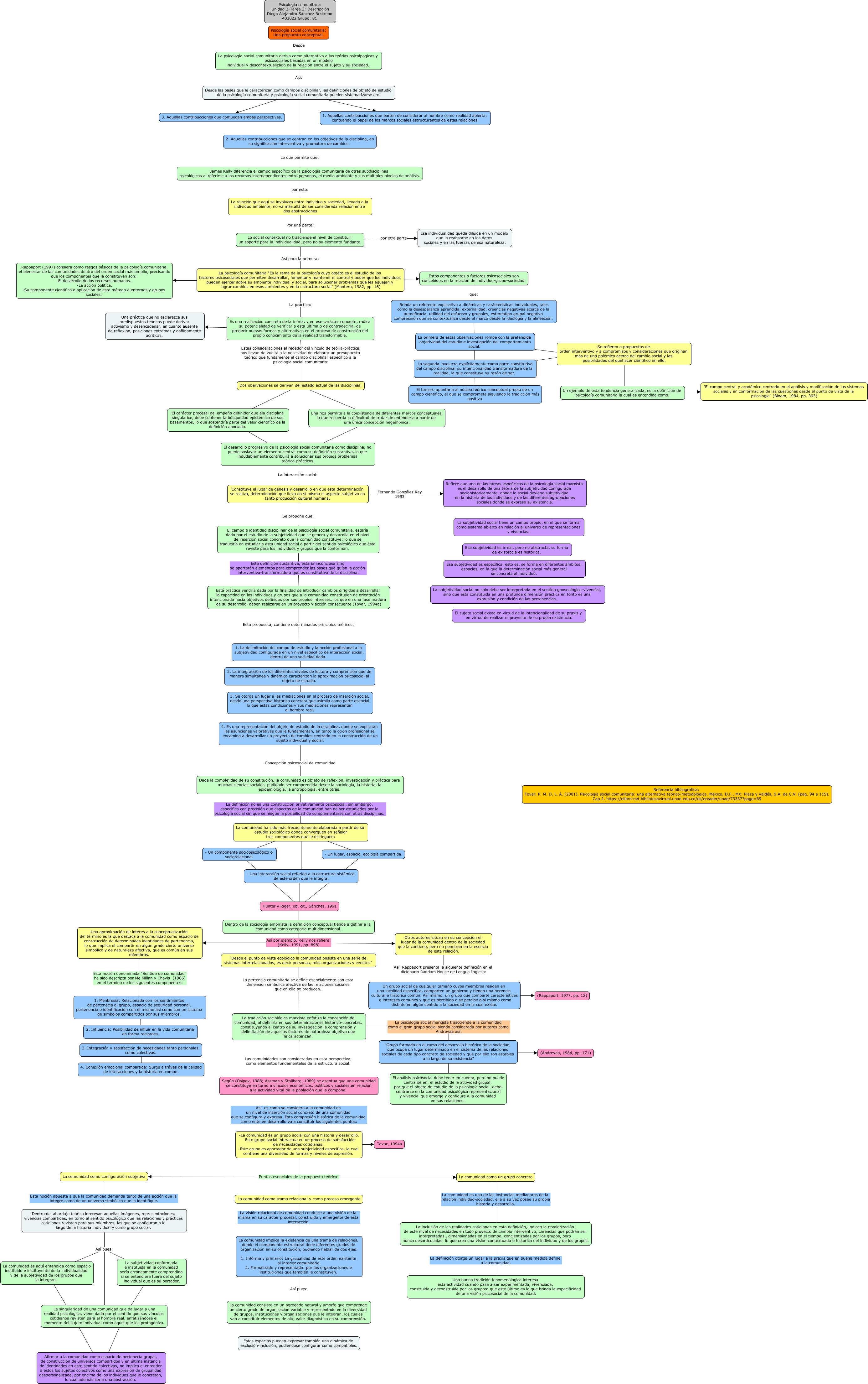 Este Cmap, tiene información relacionada con: Psicología social comunitaria_Una propuesta conceptual_Diego Sánchez Restrepo_UNAD, La comunidad ha sido más frecuentemente elaborada a partir de su estudio sociológico donde converguen en señalar tres componentes que le distinguen: ???? - Una interacción social referida a la estructura sistémica de este orden que le integra., -La comunidad es un grupo social con una historia y desarrollo. -Este grupo social interactua en un proceso de satisfacción de necesidades cotidianas. -Este grupo es aportador de una subjetividad especifica, la cual contiene una diversidad de formas y niveles de expresión. Puntos esenciales de la propuesta teórica: La comunidad como un grupo concreto, La comunidad como trama relaciona! y como proceso emergente La visión relacional de comunidad conduice a una visión de la misma en su carácter procesal, construido y emergente de esta interacción. La comunidad implica la existencia de una trama de relaciones, donde el componente estructural tiene diferentes grados de organización en su constitución, pudiendo hablar de dos ejes: 1. Informa y primario: La grupalidad de este orden existente al interior comunitario. 2. Formalizado y representado: por las organizaciones e instituciones que también le constituyen., El desarrollo progresivo de la psicología social comunitaria como disciplina, no puede soslayar un elemento central como su definición sustantiva, lo que indudablemente contribuirá a solucionar sus propios problemas teórico-prácticos. La interacción social: Constituye el lugar de génesis y desarrollo en que esta determinación se realiza, determinación que lleva en sí misma el aspecto subjetivo en tanto producción cultural humana., Lo social contextual no trasciende el nivel de constituir un soporte para la individualidad, pero no su elemento fundante. Así para la primera: La psicología comunitaria "Es la rama de la psicología cuyo objeto es el estudio de los factores psicosociales que permiten desarrollar, fomentar y mantener el control y poder que los individuos pueden ejercer sobre su ambiente individual y social, para solucionar problemas que les aquejan y lograr cambios en esos ambientes y en la estructura social" (Montero, 1982, pp. 16), Otros autores situan en su concepción el lugar de la comunidad dentro de la sociedad que la contiene, pero no penetran en la esencia de esta relación. Así, Rappaport presenta la siguiente definición en el dicionario Randam House de Lengua Inglesa: Un grupo social de cualquier tamaño cuyos miembros residen en una localidad especifica, comparten un gobierno y tienen una herencia cultural e historica común. Así mismo, un grupo que comparte carácteristicas e intereses comunes y que es percibido o se percibe a si mismo como distinto en algún sentido a la sociedad en la cual existe., 1. La delimitación del campo de estudio y la acción profesional a la subjetividad configurada en un nivel especifico de interacción social, dentro de una sociedad dada. ???? 4. Es una representación del objeto de estudio de la disciplina, donde se explicitan las asunciones valorativas que le fundamentan, en tanto la ccion profesional se encamina a desarrollar un proyecto de cambios centrado en la construcción de un sujeto individual y social., El campo e identidad disciplinar de la psicología social comunitaria, estaría dado por el estudio de la subjetividad que se genera y desarrolla en el nivel de inserción social concreto que la comunidad constituye; lo que se traduciría en estudiar a esta unidad social a partir del sentido psicológico que ésta reviste para los individuos y grupos que la conforman. Esta definición sustantiva, estaría inconclusa sino se aportarán elementos para comprender las bases que guían la acción interventiva-transformadora que es constitutiva de la disciplina. Está práctica vendría dada por la finalidad de introducir cambios dirigidos a desarrollar la capacidad en los individuos y grupos que a la comunidad constituyen de orientación intencionada hacia objetivos definidos por sus propios intereses, los que en una fase madura de su desarrollo, deben realizarse en un proyecto y acción consecuente (Tovar, 1994a), Lo social contextual no trasciende el nivel de constituir un soporte para la individualidad, pero no su elemento fundante. por otra parte Esa individualidad queda diluida en un modelo que la reabsorbe en los datos sociales y en las fuerzas de esa naturaleza., - Una interacción social referida a la estructura sistémica de este orden que le integra. ???? Hunter y Riger, ob. cit., Sánchez, 1991, - Un componente sociopsicológico o sociorelacional ???? Hunter y Riger, ob. cit., Sánchez, 1991, Es una realización concreta de la teória, y en ese carácter concreto, radica su potencialidad de verificar a esta última o de contradecirla, de predecir nuevas formas y alternativas en el proceso de construcción del propio conocimiento de la realidad transformable. Estas consideraciones al rededor del vinculo de teória-práctica, nos llevan de vuelta a la necesidad de elaborar un presupuesto teórico que fundamente el campo disciplinar especifico a la psicología social comunitaria: Dos obervaciones se derivan del estado actual de las disciplinas:, La psicología comunitaria "Es la rama de la psicología cuyo objeto es el estudio de los factores psicosociales que permiten desarrollar, fomentar y mantener el control y poder que los individuos pueden ejercer sobre su ambiente individual y social, para solucionar problemas que les aquejan y lograr cambios en esos ambientes y en la estructura social" (Montero, 1982, pp. 16) La práctica: Es una realización concreta de la teória, y en ese carácter concreto, radica su potencialidad de verificar a esta última o de contradecirla, de predecir nuevas formas y alternativas en el proceso de construcción del propio conocimiento de la realidad transformable., Una nos permite a la 