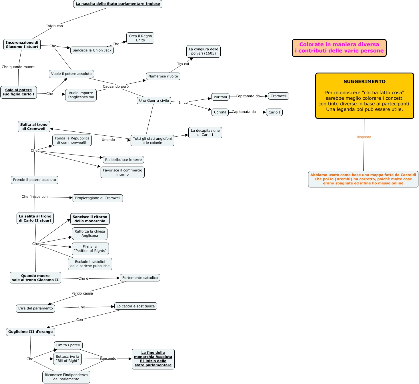 Questa Cmap, creata con IHMC CmapTools, contiene informazioni relative a: Gruppo Brembi (Storia), Guglielmo III d'orange Che Riconosce l'indipendenza del parlamento, Salita al trono di Cromwell Che Favorisce il commercio interno, Salita al trono di Cromwell Che Ridistribuisce le terre, Vuole il potere assoluto Causando però Numerose rivolte, Una Guerra civile In cui Puritani, Una Guerra civile Che finisce con La decapitazione di Carlo I, Salita al trono di Cromwell Che Fonda la Repubblica di commonwealth, Numerose rivolte Tra cui La congiura delle polveri (1605), La salita al trono di Carlo II stuart Che Quando muore sale al trono Giacomo II, Una Guerra civile In cui Corona, Prende il potere assoluto Che finisce con l'impiccagione di Cromwell, Limita i poteri Sancendo La fine della monarchia Assoluta E l'inizio dello stato parlamentare, La salita al trono di Carlo II stuart Che Firma la "Petition of Rights", Puritani Capitanata da Cromwell, Quando muore sale al trono Giacomo II Che è Fortemente cattolico, Vuole il potere assoluto Causando però Una Guerra civile, L'ira del parlamento Che Lo caccia e sostituisce, Sottoscrive la "Bill of Right" Sancendo La fine della monarchia Assoluta E l'inizio dello stato parlamentare, Vuole imporre l'anglicanesimo Causando però Numerose rivolte, Prende il potere assoluto Che finisce con La salita al trono di Carlo II stuart