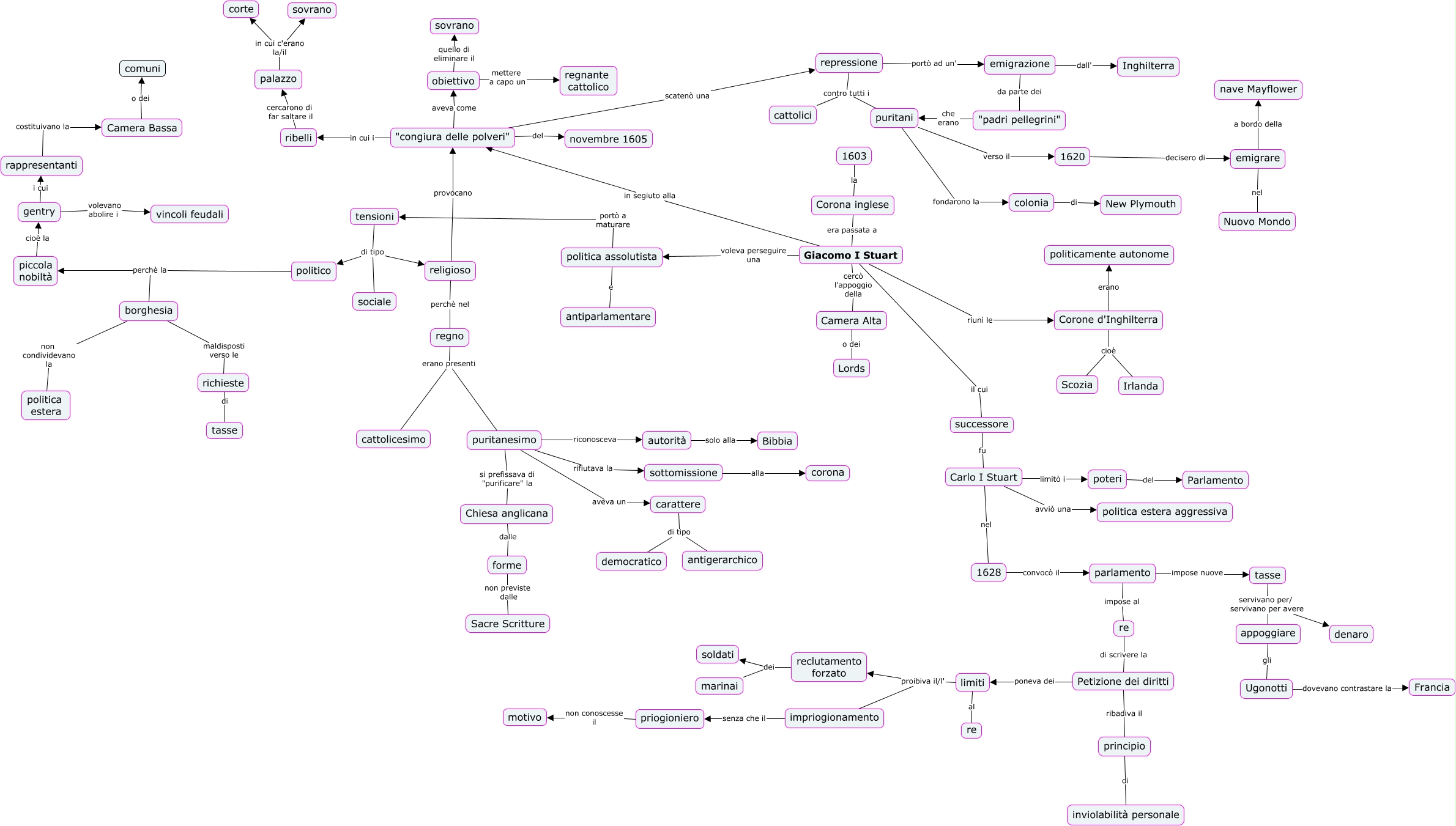 Questa Cmap, creata con IHMC CmapTools, contiene informazioni relative a: Gruppo 2 (Alice), successore fu Carlo I Stuart, politico perchè la piccola nobiltà, repressione contro tutti i puritani, politica assolutista e antiparlamentare, Chiesa anglicana dalle forme, Ugonotti dovevano contrastare la Francia, Carlo I Stuart nel 1628, "padri pellegrini" che erano puritani, gentry i cui rappresentanti, puritani verso il 1620, priogioniero non conoscesse il motivo, sottomissione alla corona, Petizione dei diritti ribadiva il principio, poteri del Parlamento, piccola nobiltà cioè la gentry, ribelli cercarono di far saltare il palazzo, "congiura delle polveri" scatenò una repressione, palazzo in cui c'erano la/il corte, forme non previste dalle Sacre Scritture, Camera Alta o dei Lords