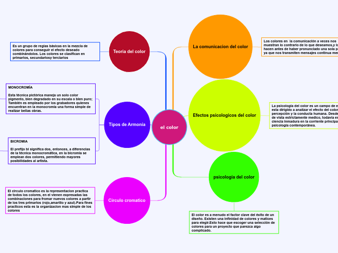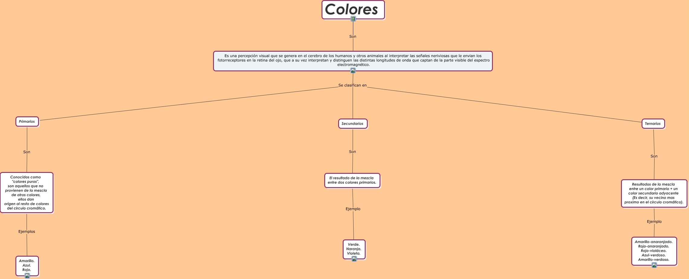 Este Cmap, tiene información relacionada con: COLORES, Colores Son Es una percepción visual que se genera en el cerebro de los humanos y otros animales al interpretar las señales neriviosas que le envian los fotorreceptores en la retina del ojo, que a su vez interpretan y distinguen las distintas longitudes de onda que captan de la parte visible del espectro electromagnético., Es una percepción visual que se genera en el cerebro de los humanos y otros animales al interpretar las señales neriviosas que le envian los fotorreceptores en la retina del ojo, que a su vez interpretan y distinguen las distintas longitudes de onda que captan de la parte visible del espectro electromagnético. Se clasifican en Secundarios, Primarios Son Conocidos como "colores puros", son aquellos que no provienen de la mezcla de otros colores, ellos dan origen al resto de colores del circulo cromático., Es una percepción visual que se genera en el cerebro de los humanos y otros animales al interpretar las señales neriviosas que le envian los fotorreceptores en la retina del ojo, que a su vez interpretan y distinguen las distintas longitudes de onda que captan de la parte visible del espectro electromagnético. Se clasifican en Primarios, Resultados de la mezcla entre un color primario + un color secundario adyacente (Es decir, su vecino mas proximo en el círculo cromático). Ejemplo Amarillo-anaranjado. Rojo-anaranjado. Rojo-violáceo. Azul-verdoso. Amarillo-verdoso., Secundarios Son El resultado de la mezcla entre dos colores primarios., Es una percepción visual que se genera en el cerebro de los humanos y otros animales al interpretar las señales neriviosas que le envian los fotorreceptores en la retina del ojo, que a su vez interpretan y distinguen las distintas longitudes de onda que captan de la parte visible del espectro electromagnético. Se clasifican en Ternarios, Conocidos como "colores puros", son aquellos que no provienen de la mezcla de otros colores, ellos dan origen al resto de colores del circulo cromático. Ejemplos Amarillo. Azul. Rojo., El resultado de la mezcla entre dos colores primarios. Ejemplo Verde. Naranja. Violeta., Ternarios Son Resultados de la mezcla entre un color primario + un color secundario adyacente (Es decir, su vecino mas proximo en el círculo cromático).