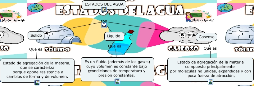 Este Cmap, tiene información relacionada con: ESTADOS DEL AGUA, Solido Que es Estado de agregación de la materia, que se caracteriza porque opone resistencia a cambios de forma y de volumen., ESTADOS DEL AGUA son Solido, ESTADOS DEL AGUA son Gaseoso, ESTADOS DEL AGUA son Liquido, Gaseoso Que es Estado de agregación de la materia compuesto principalmente por moléculas no unidas, expandidas y con poca fuerza de atracción,, Liquido Que es Es un fluido (además de los gases) cuyo volumen es constante bajo çcondiciones de temperatura y presión constantes.