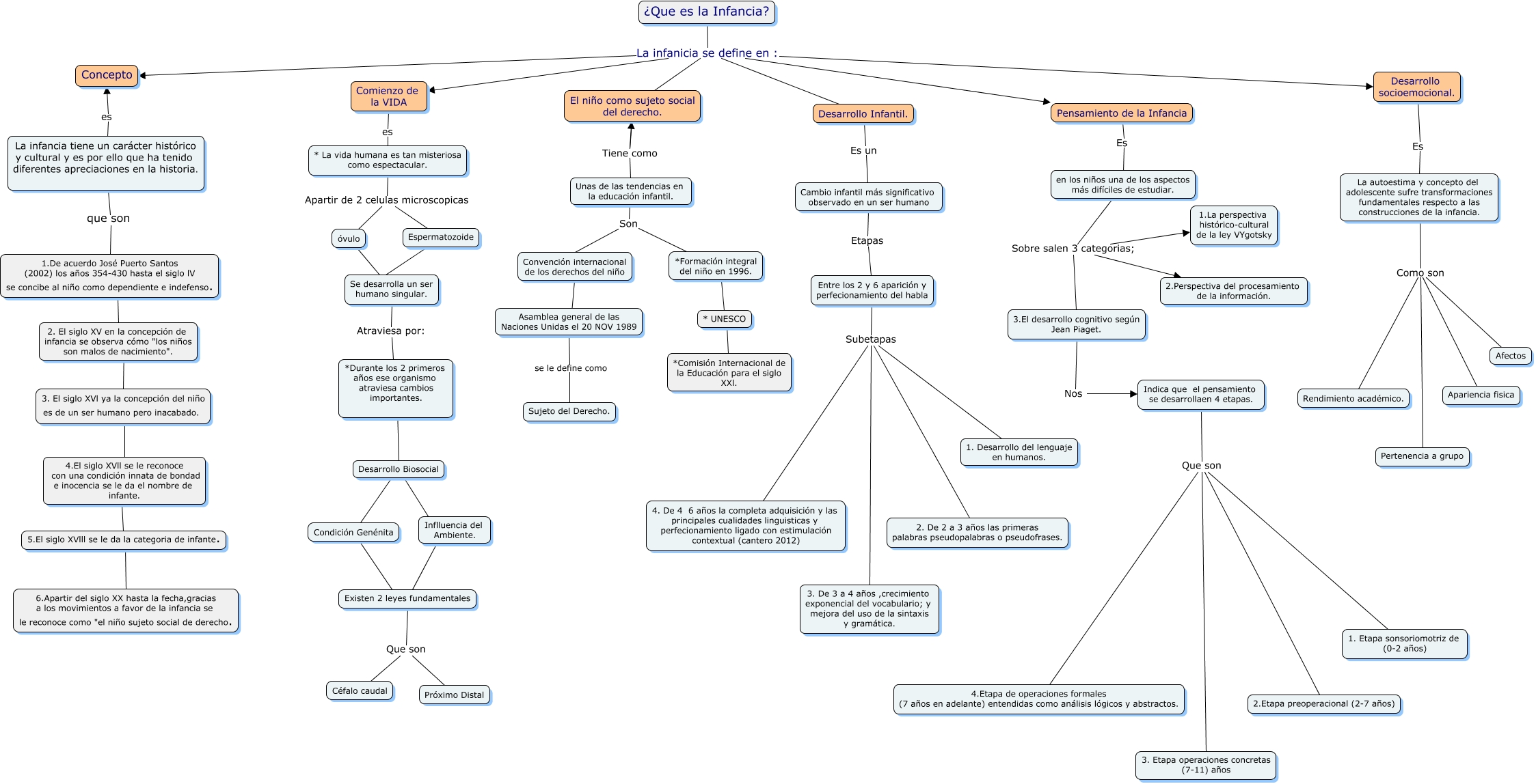 Este Cmap, tiene información relacionada con: MAPA DE LA INFANCIA, Comienzo de la VIDA es * La vida humana es tan misteriosa como espectacular., Convención internacional de los derechos del niño ???? Asamblea general de las Naciones Unidas el 20 NOV 1989, Condición Genénita ???? Existen 2 leyes fundamentales, en los niños una de los aspectos más difíciles de estudiar. Sobre salen 3 categorias; 1.La perspectiva histórico-cultural de la ley VYgotsky, El niño como sujeto social del derecho. Tiene como Unas de las tendencias en la educación infantil., Unas de las tendencias en la educación infantil. Son Convención internacional de los derechos del niño, Espermatozoide ???? Se desarrolla un ser humano singular., * La vida humana es tan misteriosa como espectacular. Apartir de 2 celulas microscopicas Espermatozoide, Desarrollo Biosocial ???? Inflluencia del Ambiente., Desarrollo Biosocial ???? Inflluencia del Ambiente., Desarrollo Infantil. Es un Cambio infantil más significativo observado en un ser humano, ¿Que es la Infancia? La infanicia se define en : Comienzo de la VIDA, 5.El siglo XVlll se le da la categoria de infante. ???? 6.Apartir del siglo XX hasta la fecha,gracias a los movimientos a favor de la infancia se le reconoce como "el niño sujeto social de derecho., La infancia tiene un carácter histórico y cultural y es por ello que ha tenido diferentes apreciaciones en la historia. que son 1.De acuerdo José Puerto Santos (2002) los años 354-430 hasta el siglo lV se concibe al niño como dependiente e indefenso., * UNESCO ???? *Comisión Internacional de la Educación para el siglo XXl., La autoestima y concepto del adolescente sufre transformaciones fundamentales respecto a las construcciones de la infancia. Como son Afectos, Desarrollo socioemocional. Es La autoestima y concepto del adolescente sufre transformaciones fundamentales respecto a las construcciones de la infancia., La autoestima y concepto del adolescente sufre transformaciones fundamentales respecto a las construcciones de la infancia. Como son Rendimiento académico., Entre los 2 y 6 aparición y perfecionamiento del habla Subetapas 3. De 3 a 4 años ,crecimiento exponencial del vocabulario; y mejora del uso de la sintaxis y gramática., Cambio infantil más significativo observado en un ser humano Etapas Entre los 2 y 6 aparición y perfecionamiento del habla