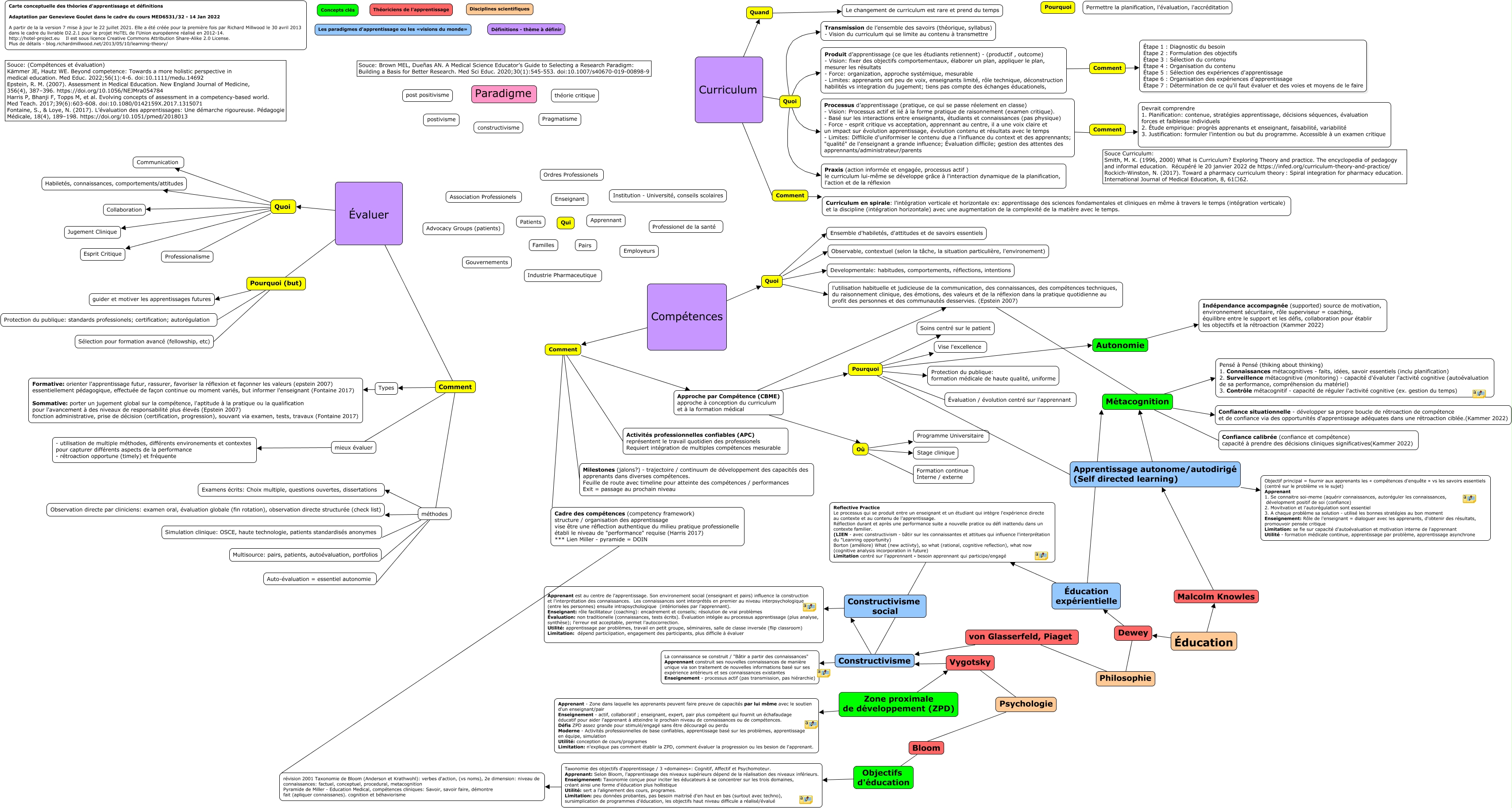 This Concept Map, created with IHMC CmapTools, has information related to: Carte GGoulet, Comment mieux évaluer, Apprentissage autonome/autodirigé (Self directed learning) Métacognition, méthodes Examens écrits: Choix multiple, questions ouvertes, dissertations, Vygotsky Constructivisme, Comment Cadre des compétences (competency framework) structure / organisation des apprentissage vise être une réflection authentique du milieu pratique professionelle établi le niveau de "performance" requise (Harris 2017) *** Lien Miller - pyramide = DOIN, Constructivisme social Apprenant est au centre de l'apprentissage. Son environement social (enseignant et pairs) influence la construction et l'interprétation des connaissances. Les connaissances sont interprétés en premier au niveau interpsychologique (entre les personnes) ensuite intrapsychologique (intériorisées par l'apprennant). Enseignant: rôle facilitateur (coaching): encadrement et conseils; résolution de vrai problèmes Évaluation: non traditionelle (connaissances, tests écrits). Évaluation intégée au processus apprentissage (plus analyse, synthèse); l'erreur est acceptable, permet l'autocorrection. Utilité: apprentissage par problèmes, travail en petit groupe, séminaires, salle de classe inversée (flip classroom) Limitation: dépend particiipation, engagement des participants, plus difficile à évaluer, mieux évaluer - utilisation de multiple méthodes, différents environements et contextes pour capturer différents aspects de la performance - rétroaction opportune (timely) et fréquente, Curriculum Comment, Zone proximale de développement (ZPD) Apprenant - Zone dans laquelle les apprenants peuvent faire preuve de capacités par lui même avec le soutien d'un enseignant/pair Enseignement - actif, collaboratif ; enseignant, expert, pair plus compétent qui fournit un échafaudage éducatif pour aider l'apprenant à atteindre le prochain niveau de connaissances ou de compétences. Défis ZPD assez grande pour stimulé/engagé sans être découragé ou perdu Moderne - Activités professionnelles de base confiables, apprentissage basé sur les problèmes, apprentissage en équipe, simulation Utilité: conception de cours/programes Limitation: n'explique pas comment établir la ZPD, comment évaluer la progression ou les besion de l'apprenant., Éducation Malcolm Knowles, von Glasserfeld, Piaget Constructivisme, Évaluer Quoi, Apprentissage autonome/autodirigé (Self directed learning) Objectif principal = fournir aux apprenants les « compétences d'enquête » vs les savoirs essentiels (centré sur le problème vs le sujet) Apprenant 1. Se connaitre soi-meme (aquérir connaissances, autoréguler les connaissances, dévelopment positif de soi (confiance) 2. Movitvation et l'autorégulation sont essentiel 3. A chaque problème sa solution - utilisé les bonnes stratégies au bon moment Enseignement: Rôle de l'enseignant = dialoguer avec les apprenants, d'obtenir des résultats, promouvoir pensée critique Limitation: se fie sur capacité d'autoévaluation et motivation interne de l'apprennant Utilité - formation médicale continue, apprentissage par problème, apprentissage asynchrone, Reflective Practice Le processus qui se produit entre un enseignant et un étudiant qui intègre l'expérience directe au contexte et au contenu de l'apprentissage. Réflection durant et après une performance suite a nouvelle pratice ou défi inattendu dans un contexte familier. (LIEN - avec constructivism - bâtir sur les connaissantes et attitues qui influence l'interprétation du "Leanring opportunity) Borton (améliore) What (new actiivty), so what (rational, cognitive reflection), what now (cognitive analysis incorporation in future) Limitation centré sur l'apprennant - besoin apprennant qui participe/engagé Constructivisme, Constructivisme Constructivisme social, Quoi Observable, contextuel (selon la tâche, la situation particulière, l'environement), Curriculum Quoi Processus d’apprentissage (pratique, ce qui se passe réelement en classe) - Vision: Processus actif et lié à la forme pratique de raisonnement (examen critique). - Basé sur les interactions entre enseignants, étudiants et connaissances (pas physique) - Force - esprit critique vs acceptation, apprennant au centre, il a une voix claire et un impact sur évolution apprentissage, évolution contenu et résultats avec le temps - Limites: Diffilcile d'uniformiser le contenu due a l'influance du context et des apprennants; "qualité" de l'enseignant a grande influence; Évaluation difficile; gestion des attentes des apprennants/administrateur/parents, Quoi Habiletés, connaissances, comportements/attitudes, von Glasserfeld, Piaget Philosophie, Comment Milestones (jalons?) - trajectoire / continuum de développement des capacités des apprenants dans diverses compétences. Feuille de route avec timeline pour atteinte des compétences / performances Exit = passage au prochain niveau
