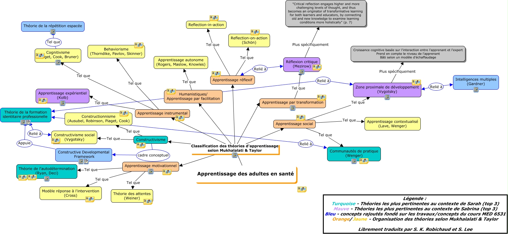 This Concept Map, created with IHMC CmapTools, has information related to: Théories d'apprentissage en santé - SKR et SL, Apprentissage par transformation Tel que Réflexion critique (Mezirow), Apprentissage des adultes en santé Classification des théories d'apprentissage selon Mukhalalati & Taylor Apprentissage social, Zone proximale de développement (Vygotsky) Plus spécifiquement Croissance cognitive basée sur l'interaction entre l'apprenant et l'expert Prend en compte le niveau de l'apprenant Bâti selon un modèle d'échaffaudage, Apprentissage motivationnel Tel que Théorie de l'autodétermination (Ryan, Deci), Apprentissage réflexif Tel que Reflection-on-action (Schön), Apprentissage social Tel que Apprentissage contextualisé (Lave, Wenger), Apprentissage des adultes en santé Classification des théories d'apprentissage selon Mukhalalati & Taylor Constructivisme, Constructive Developmental Framework Appuie Théorie de la formation identitaire professionelle, Apprentissage social Tel que Zone proximale de développement (Vygotsky), Apprentissage réflexif Tel que Reflection-in-action, Apprentissage instrumental Tel que Apprentissage expérientiel (Kolb), Apprentissage instrumental Tel que Behaviorisme (Thorndike, Pavlov, Skinner), Apprentissage des adultes en santé Classification des théories d'apprentissage selon Mukhalalati & Taylor Apprentissage motivationnel, Apprentissage social Tel que Communautés de pratique (Wenger), Apprentissage motivationnel Tel que Théorie des attentes (Weiner), Constructivisme Tel que Constructionnisme (Ausubel, Robinson, Piaget, Cook), Apprentissage des adultes en santé Classification des théories d'apprentissage selon Mukhalalati & Taylor Apprentissage instrumental, Apprentissage des adultes en santé Classification des théories d'apprentissage selon Mukhalalati & Taylor Apprentissage par transformation, Constructivisme cadre conceptuel Constructive Developmental Framework, Apprentissage motivationnel Tel que Modèle réponse à l'intervention (Cross)