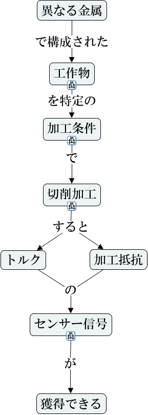 このコンセプトマップに関連する情報: 最初の概念マップ, 切削加工 すると 加工抵抗, 加工抵抗 の センサー信号, 加工条件 で 切削加工, トルク の センサー信号, センサー信号 が 獲得できる, 切削加工 すると トルク, 工作物 を特定の 加工条件, 異なる金属 で構成された 工作物
