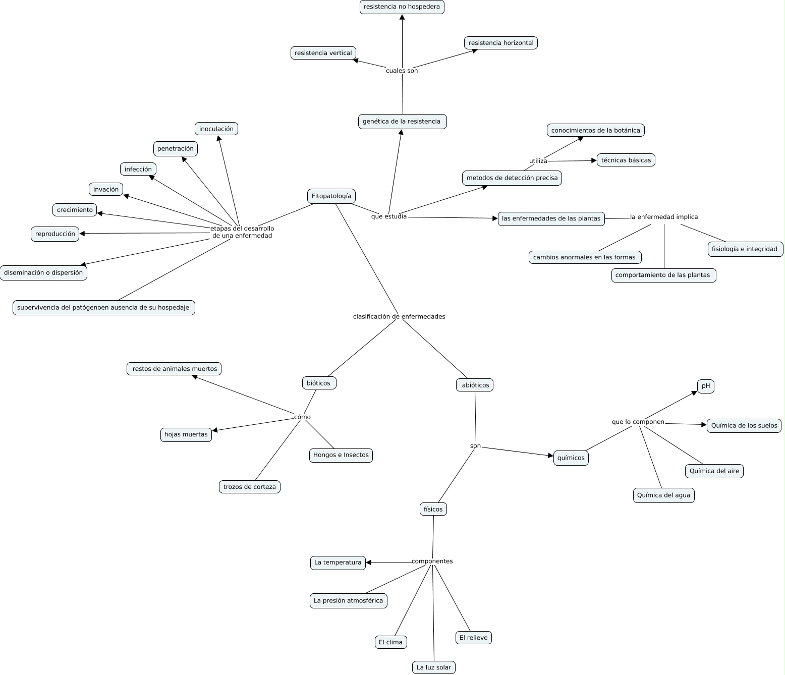 This Concept Map, created with IHMC CmapTools, has information related to: FITOPATOLOG�?A 2, Fitopatología etapas del desarrollo de una enfermedad inoculación, físicos componentes La luz solar, Fitopatología clasificación de enfermedades abióticos, Fitopatología etapas del desarrollo de una enfermedad diseminación o dispersión, Fitopatología etapas del desarrollo de una enfermedad infección, Fitopatología etapas del desarrollo de una enfermedad penetración, Fitopatología que estudia las enfermedades de las plantas, metodos de detección precisa utiliza conocimientos de la botánica, genética de la resistencia cuales son resistencia horizontal, abióticos son químicos, Fitopatología que estudia genética de la resistencia, las enfermedades de las plantas la enfermedad implica cambios anormales en las formas, Fitopatología etapas del desarrollo de una enfermedad invación, genética de la resistencia cuales son resistencia no hospedera, físicos componentes La presión atmosférica, las enfermedades de las plantas la enfermedad implica fisiología e integridad, bióticos cómo Hongos e Insectos, bióticos cómo trozos de corteza, químicos que lo componen Química de los suelos, metodos de detección precisa utiliza técnicas básicas