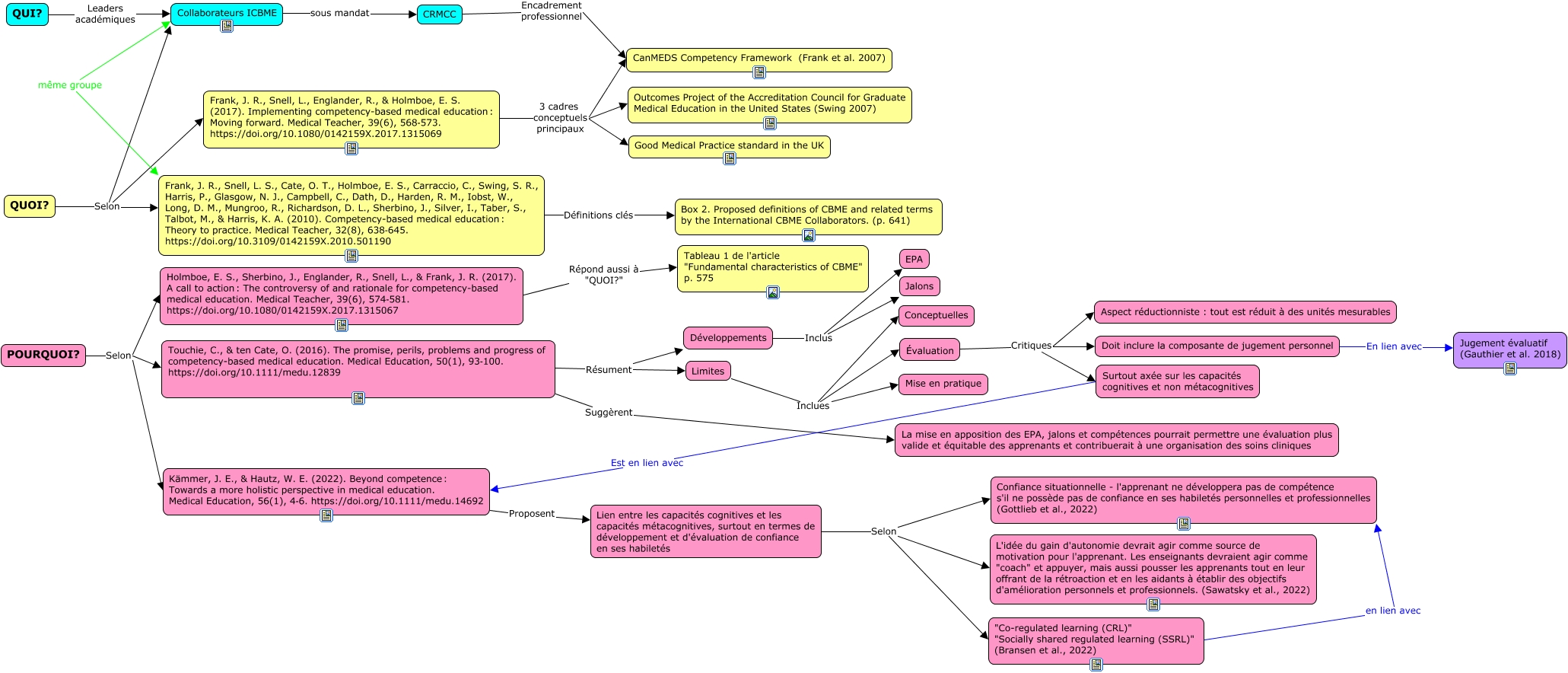 Cette carte de concepts créée avec IHMC CmapTools traite de: SKR_Compétence, Surtout axée sur les capacités cognitives et non métacognitives Est en lien avec Kämmer, J. E., & Hautz, W. E. (2022). Beyond competence : Towards a more holistic perspective in medical education. Medical Education, 56(1), 4‑6. https://doi.org/10.1111/medu.14692, Frank, J. R., Snell, L., Englander, R., & Holmboe, E. S. (2017). Implementing competency-based medical education : Moving forward. Medical Teacher, 39(6), 568‑573. https://doi.org/10.1080/0142159X.2017.1315069 3 cadres conceptuels principaux Good Medical Practice standard in the UK, Limites Inclues Mise en pratique, Frank, J. R., Snell, L., Englander, R., & Holmboe, E. S. (2017). Implementing competency-based medical education : Moving forward. Medical Teacher, 39(6), 568‑573. https://doi.org/10.1080/0142159X.2017.1315069 3 cadres conceptuels principaux Outcomes Project of the Accreditation Council for Graduate Medical Education in the United States (Swing 2007), POURQUOI? Selon Holmboe, E. S., Sherbino, J., Englander, R., Snell, L., & Frank, J. R. (2017). A call to action : The controversy of and rationale for competency-based medical education. Medical Teacher, 39(6), 574‑581. https://doi.org/10.1080/0142159X.2017.1315067, POURQUOI? Selon Kämmer, J. E., & Hautz, W. E. (2022). Beyond competence : Towards a more holistic perspective in medical education. Medical Education, 56(1), 4‑6. https://doi.org/10.1111/medu.14692, Évaluation Critiques Surtout axée sur les capacités cognitives et non métacognitives, Lien entre les capacités cognitives et les capacités métacognitives, surtout en termes de développement et d'évaluation de confiance en ses habiletés Selon "Co-regulated learning (CRL)" "Socially shared regulated learning (SSRL)" (Bransen et al., 2022), Holmboe, E. S., Sherbino, J., Englander, R., Snell, L., & Frank, J. R. (2017). A call to action : The controversy of and rationale for competency-based medical education. Medical Teacher, 39(6), 574‑581. https://doi.org/10.1080/0142159X.2017.1315067 Répond aussi à "QUOI?" Tableau 1 de l'article "Fundamental characteristics of CBME" p. 575, Évaluation Critiques Aspect réductionniste : tout est réduit à des unités mesurables, Développements Inclus EPA, Lien entre les capacités cognitives et les capacités métacognitives, surtout en termes de développement et d'évaluation de confiance en ses habiletés Selon L'idée du gain d'autonomie devrait agir comme source de motivation pour l'apprenant. Les enseignants devraient agir comme "coach" et appuyer, mais aussi pousser les apprenants tout en leur offrant de la rétroaction et en les aidants à établir des objectifs d'amélioration personnels et professionnels. (Sawatsky et al., 2022), QUOI? Selon Frank, J. R., Snell, L. S., Cate, O. T., Holmboe, E. S., Carraccio, C., Swing, S. R., Harris, P., Glasgow, N. J., Campbell, C., Dath, D., Harden, R. M., Iobst, W., Long, D. M., Mungroo, R., Richardson, D. L., Sherbino, J., Silver, I., Taber, S., Talbot, M., & Harris, K. A. (2010). Competency-based medical education : Theory to practice. Medical Teacher, 32(8), 638‑645. https://doi.org/10.3109/0142159X.2010.501190, POURQUOI? Selon Touchie, C., & ten Cate, O. (2016). The promise, perils, problems and progress of competency-based medical education. Medical Education, 50(1), 93‑100. https://doi.org/10.1111/medu.12839, Limites Inclues Évaluation, Évaluation Critiques Doit inclure la composante de jugement personnel, Frank, J. R., Snell, L. S., Cate, O. T., Holmboe, E. S., Carraccio, C., Swing, S. R., Harris, P., Glasgow, N. J., Campbell, C., Dath, D., Harden, R. M., Iobst, W., Long, D. M., Mungroo, R., Richardson, D. L., Sherbino, J., Silver, I., Taber, S., Talbot, M., & Harris, K. A. (2010). Competency-based medical education : Theory to practice. Medical Teacher, 32(8), 638‑645. https://doi.org/10.3109/0142159X.2010.501190 Définitions clés Box 2. Proposed definitions of CBME and related terms by the International CBME Collaborators. (p. 641), Touchie, C., & ten Cate, O. (2016). The promise, perils, problems and progress of competency-based medical education. Medical Education, 50(1), 93‑100. https://doi.org/10.1111/medu.12839 Résument Développements, Développements Inclus Jalons, "Co-regulated learning (CRL)" "Socially shared regulated learning (SSRL)" (Bransen et al., 2022) en lien avec Confiance situationnelle - l'apprenant ne développera pas de compétence s'il ne possède pas de confiance en ses habiletés personnelles et professionnelles (Gottlieb et al., 2022)