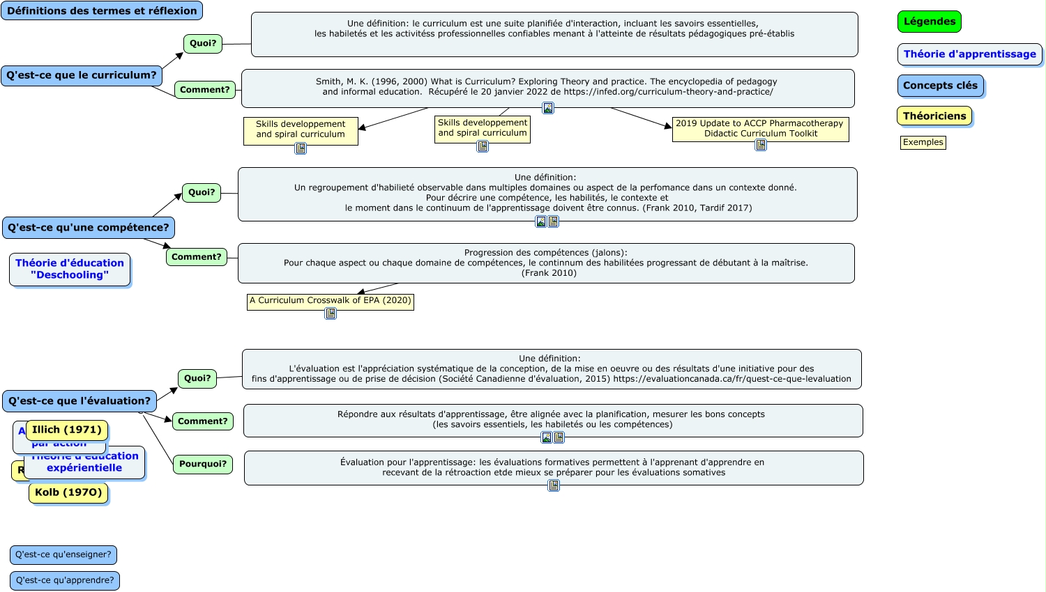 This Concept Map, created with IHMC CmapTools, has information related to: Définitions_Clandry, Quoi? ???? Une définition: Un regroupement d'habilieté observable dans multiples domaines ou aspect de la perfomance dans un contexte donné. Pour décrire une compétence, les habilités, le contexte et le moment dans le continuum de l'apprentissage doivent être connus. (Frank 2010, Tardif 2017), Quoi? ???? Une définition: L'évaluation est l'appréciation systématique de la conception, de la mise en oeuvre ou des résultats d'une initiative pour des fins d'apprentissage ou de prise de décision (Société Canadienne d'évaluation, 2015) https://evaluationcanada.ca/fr/quest-ce-que-levaluation, Q'est-ce qu'une compétence? ???? Quoi?, Q'est-ce que le curriculum? C Comment?, Comment? ???? Smith, M. K. (1996, 2000) What is Curriculum? Exploring Theory and practice. The encyclopedia of pedagogy and informal education. Récupéré le 20 janvier 2022 de https://infed.org/curriculum-theory-and-practice/, Quoi? ???? Une définition: le curriculum est une suite planifiée d'interaction, incluant les savoirs essentielles, les habiletés et les activitéss professionnelles confiables menant à l'atteinte de résultats pédagogiques pré-établis, Q'est-ce que l'évaluation? C Pourquoi?, Smith, M. K. (1996, 2000) What is Curriculum? Exploring Theory and practice. The encyclopedia of pedagogy and informal education. Récupéré le 20 janvier 2022 de https://infed.org/curriculum-theory-and-practice/ ???? Skills developpement and spiral curriculum, Q'est-ce qu'une compétence? ???? Comment?, Q'est-ce que l'évaluation? C Quoi?, Smith, M. K. (1996, 2000) What is Curriculum? Exploring Theory and practice. The encyclopedia of pedagogy and informal education. Récupéré le 20 janvier 2022 de https://infed.org/curriculum-theory-and-practice/ ???? Skills developpement and spiral curriculum, Progression des compétences (jalons): Pour chaque aspect ou chaque domaine de compétences, le continnum des habilitées progressant de débutant à la maîtrise. (Frank 2010) ???? A Curriculum Crosswalk of EPA (2020), Comment? ???? Progression des compétences (jalons): Pour chaque aspect ou chaque domaine de compétences, le continnum des habilitées progressant de débutant à la maîtrise. (Frank 2010), Q'est-ce que l'évaluation? C Comment?, Q'est-ce que le curriculum? C Quoi?, Smith, M. K. (1996, 2000) What is Curriculum? Exploring Theory and practice. The encyclopedia of pedagogy and informal education. Récupéré le 20 janvier 2022 de https://infed.org/curriculum-theory-and-practice/ ???? 2019 Update to ACCP Pharmacotherapy Didactic Curriculum Toolkit