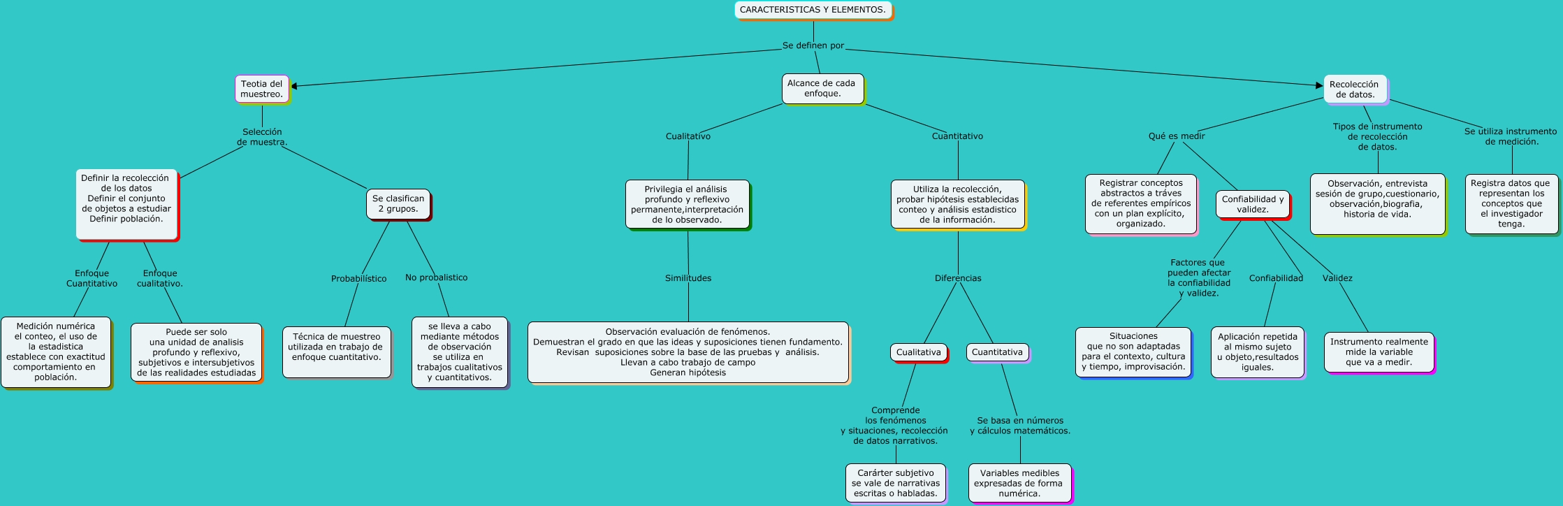 Este Cmap, tiene información relacionada con: mapa conceptual, Confiabilidad y validez. Confiabilidad Aplicación repetida al mismo sujeto u objeto,resultados iguales., Utiliza la recolección, probar hipótesis establecidas conteo y análisis estadistico de la información. Diferencias Cualitativa, Alcance de cada enfoque. Cualitativo Privilegia el análisis profundo y reflexivo permanente,interpretación de lo observado., Confiabilidad y validez. Factores que pueden afectar la confiabilidad y validez. Situaciones que no son adaptadas para el contexto, cultura y tiempo, improvisación., Confiabilidad y validez. Validez Instrumento realmente mide la variable que va a medir., Recolección de datos. Se utiliza instrumento de medición. Registra datos que representan los conceptos que el investigador tenga., Cuantitativa Se basa en números y cálculos matemáticos. Variables medibles expresadas de forma numérica., Recolección de datos. Qué es medir Registrar conceptos abstractos a tráves de referentes empíricos con un plan explícito, organizado., Utiliza la recolección, probar hipótesis establecidas conteo y análisis estadistico de la información. Diferencias Cuantitativa, Teotia del muestreo. Selección de muestra. Se clasifican 2 grupos., Alcance de cada enfoque. Cuantitativo Utiliza la recolección, probar hipótesis establecidas conteo y análisis estadistico de la información., Teotia del muestreo. Selección de muestra. Definir la recolección de los datos Definir el conjunto de objetos a estudiar Definir población., Privilegia el análisis profundo y reflexivo permanente,interpretación de lo observado. Similitudes Observación evaluación de fenómenos. Demuestran el grado en que las ideas y suposiciones tienen fundamento. Revisan suposiciones sobre la base de las pruebas y análisis. Llevan a cabo trabajo de campo Generan hipótesis, Se clasifican 2 grupos. Probabilístico Técnica de muestreo utilizada en trabajo de enfoque cuantitativo., Definir la recolección de los datos Definir el conjunto de objetos a estudiar Definir población. Enfoque cualitativo. Puede ser solo una unidad de analisis profundo y reflexivo, subjetivos e intersubjetivos de las realidades estudiadas, Recolección de datos. Qué es medir Confiabilidad y validez., Recolección de datos. Tipos de instrumento de recolección de datos. Observación, entrevista sesión de grupo,cuestionario, observación,biografia, historia de vida., CARACTERISTICAS Y ELEMENTOS. Se definen por Recolección de datos., CARACTERISTICAS Y ELEMENTOS. Se definen por Teotia del muestreo., Definir la recolección de los datos Definir el conjunto de objetos a estudiar Definir población. Enfoque Cuantitativo Medición numérica el conteo, el uso de la estadistica establece con exactitud comportamiento en población.
