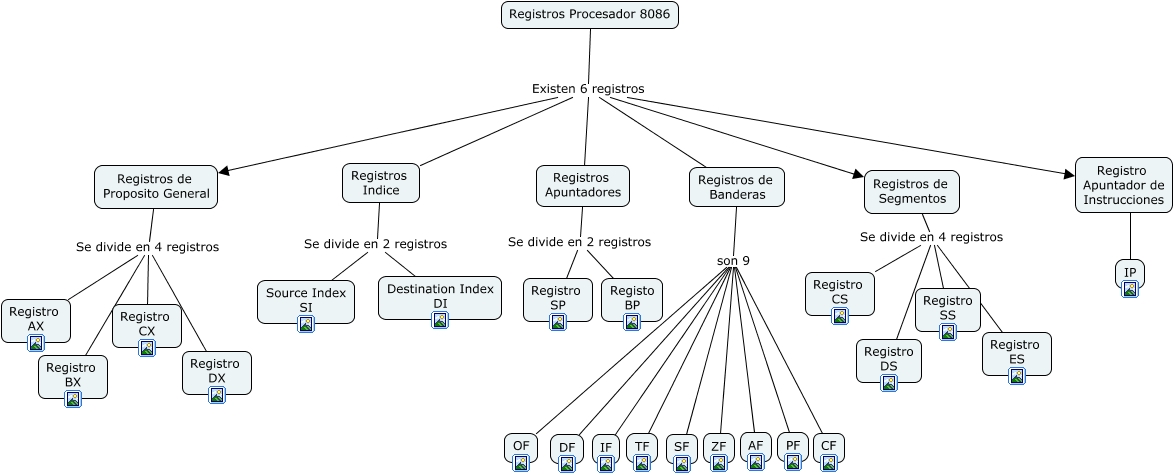 Este Cmap, tiene información relacionada con: Registros Procesador 8086, Registros de Segmentos Se divide en 4 registros Registro DS, Registros de Segmentos Se divide en 4 registros Registro ES, Registros de Banderas son 9 CF, Registros de Banderas son 9 OF, Registros de Proposito General Se divide en 4 registros Registro AX, Registros de Banderas son 9 TF, Registros de Banderas son 9 PF, Registros de Banderas son 9 DF, Registros de Proposito General Se divide en 4 registros Registro CX, Registro Apuntador de Instrucciones ???? IP, Registros de Proposito General Se divide en 4 registros Registro BX, Registros Indice Se divide en 2 registros Destination Index DI, Registros Procesador 8086 Existen 6 registros Registros de Banderas, Registros de Segmentos Se divide en 4 registros Registro CS, Registros de Banderas son 9 ZF, Registros Procesador 8086 Existen 6 registros Registros Indice, Registros Procesador 8086 Existen 6 registros Registro Apuntador de Instrucciones, Registros Indice Se divide en 2 registros Source Index SI, Registros de Banderas son 9 IF, Registros Apuntadores Se divide en 2 registros Registro SP