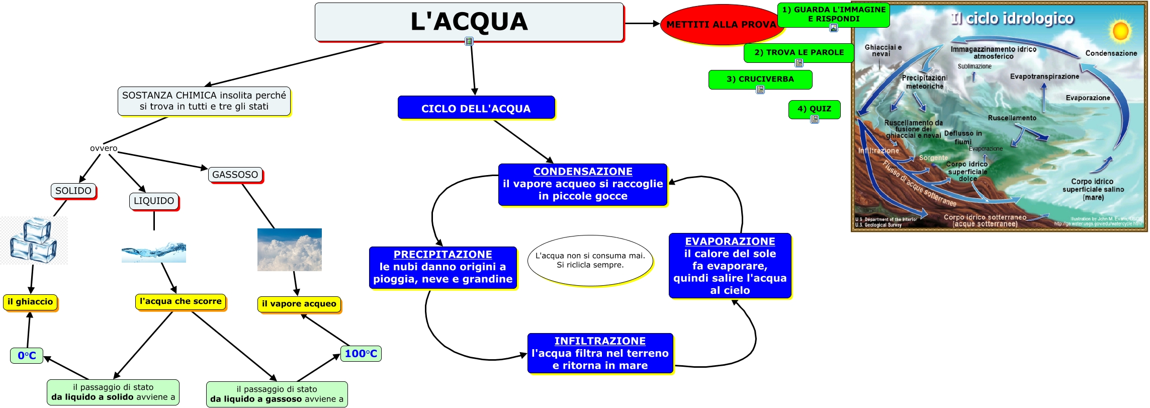 Questa Cmap, creata con IHMC CmapTools, contiene informazioni relative a: L'acqua e le sue forme, CICLO DELL'ACQUA CONDENSAZIONE il vapore acqueo si raccoglie in piccole gocce, SOSTANZA CHIMICA insolita perché si trova in tutti e tre gli stati ovvero GASSOSO, 0°C il ghiaccio, il passaggio di stato da liquido a gassoso avviene a 100°C, l'acqua che scorre il passaggio di stato da liquido a solido avviene a, l'acqua che scorre il passaggio di stato da liquido a gassoso avviene a, PRECIPITAZIONE le nubi danno origini a pioggia, neve e grandine INFILTRAZIONE l'acqua filtra nel terreno e ritorna in mare, SOLIDO il ghiaccio, L'ACQUA SOSTANZA CHIMICA insolita perché si trova in tutti e tre gli stati, INFILTRAZIONE l'acqua filtra nel terreno e ritorna in mare EVAPORAZIONE il calore del sole fa evaporare, quindi salire l'acqua al cielo, L'ACQUA METTITI ALLA PROVA, LIQUIDO l'acqua che scorre, il passaggio di stato da liquido a solido avviene a 0°C, SOSTANZA CHIMICA insolita perché si trova in tutti e tre gli stati ovvero LIQUIDO, L'ACQUA CICLO DELL'ACQUA, SOSTANZA CHIMICA insolita perché si trova in tutti e tre gli stati ovvero SOLIDO, GASSOSO il vapore acqueo, EVAPORAZIONE il calore del sole fa evaporare, quindi salire l'acqua al cielo CONDENSAZIONE il vapore acqueo si raccoglie in piccole gocce, 100°C il vapore acqueo, CONDENSAZIONE il vapore acqueo si raccoglie in piccole gocce PRECIPITAZIONE le nubi danno origini a pioggia, neve e grandine