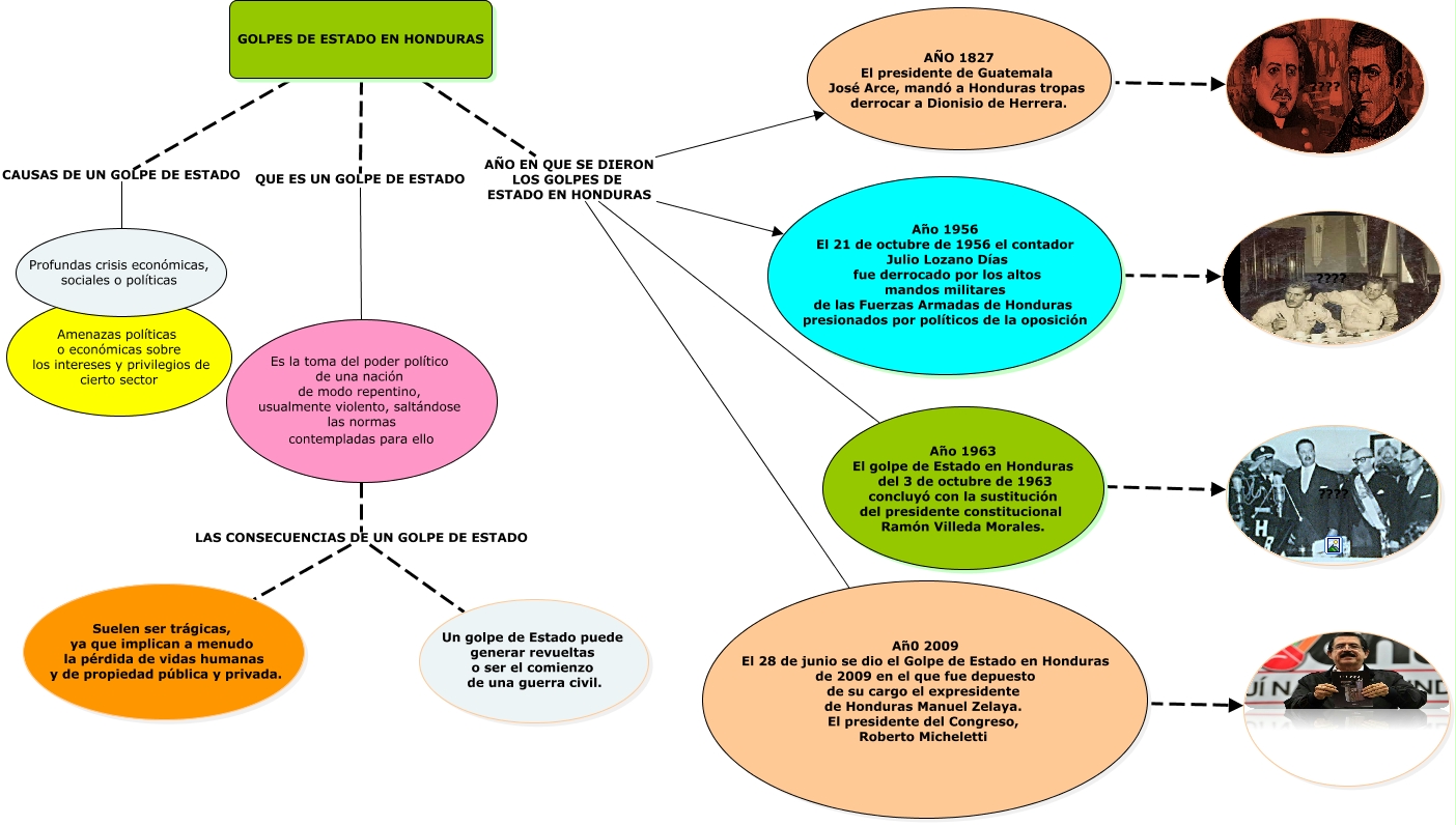 Este Cmap, tiene información relacionada con: MAPA CONCEPTUAL GOLPES DE ESTADO ORIGINAL, Año 1956 El 21 de octubre de 1956 el contador Julio Lozano Días fue derrocado por los altos mandos militares de las Fuerzas Armadas de Honduras presionados por políticos de la oposición ???? ????, Año 1963 El golpe de Estado en Honduras del 3 de octubre de 1963 concluyó con la sustitución del presidente constitucional Ramón Villeda Morales. ???? ????, GOLPES DE ESTADO EN HONDURAS CAUSAS DE UN GOLPE DE ESTADO Profundas crisis económicas, sociales o políticas , GOLPES DE ESTADO EN HONDURAS AÑO EN QUE SE DIERON LOS GOLPES DE ESTADO EN HONDURAS Añ0 2009 El 28 de junio se dio el Golpe de Estado en Honduras de 2009 en el que fue depuesto de su cargo el expresidente de Honduras Manuel Zelaya. El presidente del Congreso, Roberto Micheletti, Es la toma del poder político de una nación de modo repentino, usualmente violento, saltándose las normas contempladas para ello LAS CONSECUENCIAS DE UN GOLPE DE ESTADO Un golpe de Estado puede generar revueltas o ser el comienzo de una guerra civil., GOLPES DE ESTADO EN HONDURAS AÑO EN QUE SE DIERON LOS GOLPES DE ESTADO EN HONDURAS Año 1963 El golpe de Estado en Honduras del 3 de octubre de 1963 concluyó con la sustitución del presidente constitucional Ramón Villeda Morales., GOLPES DE ESTADO EN HONDURAS AÑO EN QUE SE DIERON LOS GOLPES DE ESTADO EN HONDURAS Año 1956 El 21 de octubre de 1956 el contador Julio Lozano Días fue derrocado por los altos mandos militares de las Fuerzas Armadas de Honduras presionados por políticos de la oposición, GOLPES DE ESTADO EN HONDURAS AÑO EN QUE SE DIERON LOS GOLPES DE ESTADO EN HONDURAS AÑO 1827 El presidente de Guatemala José Arce, mandó a Honduras tropas derrocar a Dionisio de Herrera., Profundas crisis económicas, sociales o políticas ???? Amenazas políticas o económicas sobre los intereses y privilegios de cierto sector , GOLPES DE ESTADO EN HONDURAS QUE ES UN GOLPE DE ESTADO Es la toma del poder político de una nación de modo repentino, usualmente violento, saltándose las normas contempladas para ello, AÑO 1827 El presidente de Guatemala José Arce, mandó a Honduras tropas derrocar a Dionisio de Herrera. ???? ????, Añ0 2009 El 28 de junio se dio el Golpe de Estado en Honduras de 2009 en el que fue depuesto de su cargo el expresidente de Honduras Manuel Zelaya. El presidente del Congreso, Roberto Micheletti ????, Es la toma del poder político de una nación de modo repentino, usualmente violento, saltándose las normas contempladas para ello LAS CONSECUENCIAS DE UN GOLPE DE ESTADO Suelen ser trágicas, ya que implican a menudo la pérdida de vidas humanas y de propiedad pública y privada.