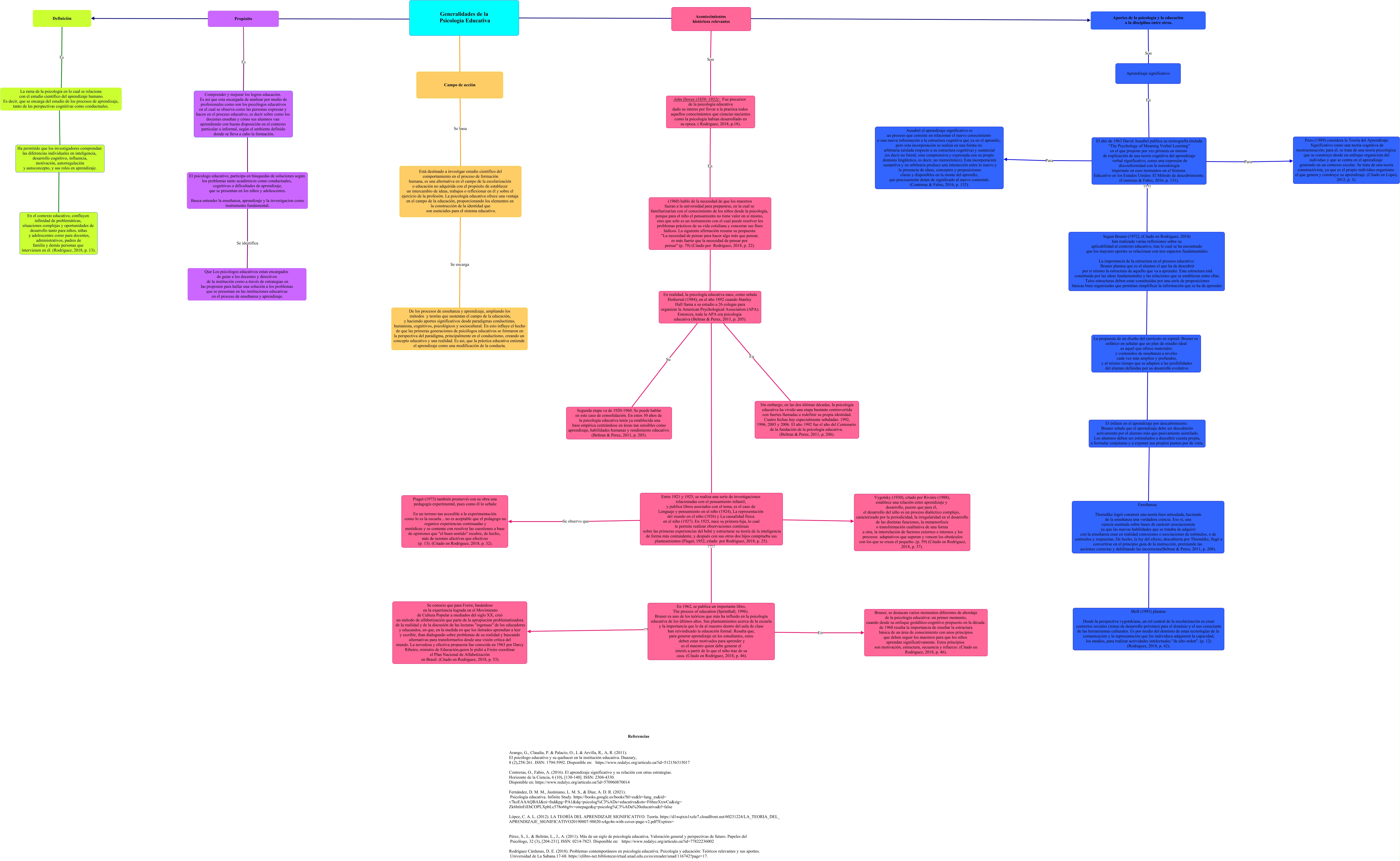 Este Cmap, tiene información relacionada con: Generalidades de la Psicologia Educativa_Edna Tatiana Diaz, Está destinado a investigar estudio científico del comportamiento en el proceso de formación humana, es una alternativa en el campo de la escolarización o educación no adquirida con el propósito de establecer un intercambio de ideas, trabajos o reflexionar en él y sobre el ejercicio de la profesión. La psicología educativa ofrece una ventaja en el campo de la educación, proporcionando los elementos en la construcción de la identidad que son esenciales para el sistema educativo. Se encarga De los procesos de enseñanza y aprendizaje, ampliando los métodos y teorías que sustentan el campo de la educación, y haciendo aportes significativos desde paradigmas conductistas, humanista, cognitivos, psicológicos y sociocultural. En esto influye el hecho de que las primeras generaciones de psicólogos educativos se formaron en la perspectiva del paradigma, principalmente en el conductismo, creando un concepto educativo y una realidad. Es asi, que la práctica educativa entiende el aprendizaje como una modificación de la conducta., Ha permitido que los investigadores comprendan las diferencias individuales en inteligencia, desarrollo cognitivo, influencia, motivación, autorregulación y autoconcepto, y sus roles en aprendizaje. ???? En el contexto educativo, confluyen infinidad de problemáticas, situaciones complejas y oportunidades de desarrollo tanto para niños, niñas y adolescentes como para docentes, administrativos, padres de familia y demás personas que intervienen en él. (Rodríguez, 2018, p. 13)., Generalidades de la Psicología Educativa ???? Acontecimientos históricos relevantes, Aportes de la psicología y la educación a la disciplina entre otros. Son Aprendizaje significativo, Acontecimientos históricos relevantes Son John Dewey (1859- 1952): Fue precursor de la psicologia educativa dado su interes por llevar a la practica todos aquellos conocimientos que ciencias nacientes como la psicologia habian desarrollado en su epoca. ( Rodriguez, 2018, p.18)., El énfasis en el aprendizaje por descubrimiento: Bruner señala que el aprendizaje debe ser descubierto activamente por el alumno más que pasivamente asimilado. Los alumnos deben ser estimulados a descubrir cuenta propia, a formular conjeturas y a exponer sus propios puntos por de vista. ???? Enseñanza: Thorndike logró construir una teoría bien articulada, haciendo de la enseñanza una verdadera ciencia. Eso sí, una ciencia asentada sobre bases de carácter asociacionista ya que las nuevas habilidades que se trataba de adquirir con la enseñanza eran en realidad conexiones o asociaciones de estímulos, o de estímulos y respuestas. De hecho, la ley del efecto, descubierta por Thorndike, llegó a convertirse en el principio guía de la instrucción, premiando las acciones correctas y debilitando las incorrectas(Beltran & Perez, 2011, p. 208)., Comprender y mejorar los logros educación. Es así que esta encargada de analizar por medio de profesionales como son los psicólogos educativos en el cual se observa como las personas expresan y hacen en el proceso educativo, es decir sobre como los docentes enseñan y cómo sus alumnos van aprendiendo con buena disposición en el contexto particular o informal, según el ambiente definido donde se lleva a cabo la formación. f El psicologo educativo, participa en búsquedas de soluciones según los problemas tanto académicos como conductuales, cognitivos o dificultades de aprendizaje, que se presentan en los niños y adolescentes. Busca entender la enseñanza, aprendizaje y la investigacion como instrumento fundamental., (1960) habló de la necesidad de que los maestros fueran a la universidad para prepararse, en la cual se familiarizarían con el conocimiento de los niños desde la psicología, porque para el niño el pensamiento no tiene valor en sí mismo, sino que solo es un instrumento con el cual puede resolver los problemas prácticos de su vida cotidiana y concertar sus fines lúdicos. La siguiente afirmación resume su propuesta: "La necesidad de pensar para hacer algo más que pensar, es más fuerte que la necesidad de pensar por pensar" (p. 79) (Citado por Rodriguez, 2018, p. 22). ???? En realidad, la psicología educativa nace, como señala Hothersal (1984), en el año 1892 cuando Stanley Hall llama a su estudio a 26 colegas para organizar la American Psychological Association (APA). Entonces, toda la APA era psicología educativa (Beltran & Perez, 2011, p. 205)., Generalidades de la Psicología Educativa ???? Aportes de la psicología y la educación a la disciplina entre otros., Definición Es La rama de la psicología en lo cual se relaciona con el estudio científico del aprendizaje humano. Es decir, que se encarga del estudio de los procesos de aprendizaje, tanto de las perspectivas cognitivas como conductuales., En realidad, la psicología educativa nace, como señala Hothersal (1984), en el año 1892 cuando Stanley Hall llama a su estudio a 26 colegas para organizar la American Psychological Association (APA). Entonces, toda la APA era psicología educativa (Beltran & Perez, 2011, p. 205). En Sin embargo, en las dos últimas décadas, la psicología educativa ha vivido una etapa bastante controvertida con fuertes llamadas a redefinir su propia identidad. Cuatro fechas hay especialmente señaladas: 1992, 1996, 2003 y 2006. El año 1992 fue el año del Centenario de la fundación de la psicología educativa. (Beltran & Perez, 2011, p. 206)., Entre 1921 y 1925, se realiza una serie de investigaciones relacionadas con el pensamiento infantil, y publica libros asociados con el tema, es el caso de Lenguaje y pensamiento en el niño (1924), La representación del mundo en el niño (1926) y La causalidad física en el niño (1927). En 1925, nace su primera hija, lo cual le permite realizar observaciones continuas sobre las primeras experiencias del beb
