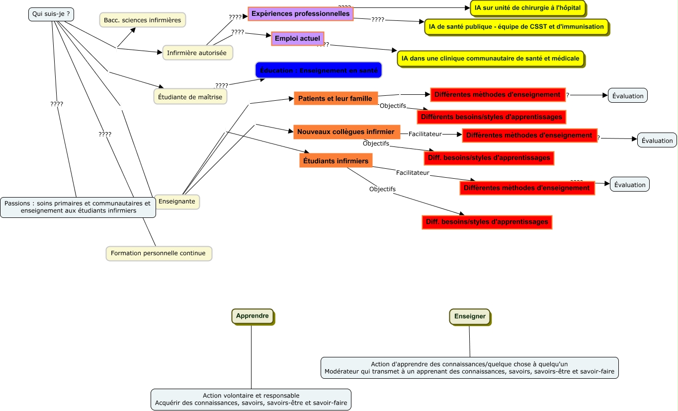 This Concept Map, created with IHMC CmapTools, has information related to: Cmap introduction_MChenier, Étudiants infirmiers Objectifs Diff. besoins/styles d'apprentissages, Qui suis-je ? Étudiante de maîtrise, Étudiante de maîtrise ???? Éducation : Enseignement en santé, Apprendre ???? Action volontaire et responsable Acquérir des connaissances, savoirs, savoirs-être et savoir-faire, Qui suis-je ? ???? Passions : soins primaires et communautaires et enseignement aux étudiants infirmiers, Infirmière autorisée ???? Emploi actuel, Qui suis-je ? Bacc. sciences infirmières, Enseignante Nouveaux collègues infirmier, Expériences professionnelles ???? IA de santé publique - équipe de CSST et d'immunisation, Enseignante Patients et leur famille, Infirmière autorisée ???? Expériences professionnelles, Qui suis-je ? Enseignante, Enseigner ???? Action d'apprendre des connaissances/quelque chose à quelqu'un Modérateur qui transmet à un apprenant des connaissances, savoirs, savoirs-être et savoir-faire, Nouveaux collègues infirmier Objectifs Diff. besoins/styles d'apprentissages, Enseignante Étudiants infirmiers, Emploi actuel ???? IA dans une clinique communautaire de santé et médicale, Différentes méthodes d'enseignement ???? Évaluation, Étudiants infirmiers Facilitateur Différentes méthodes d'enseignement, Nouveaux collègues infirmier Facilitateur Différentes méthodes d'enseignement, Patients et leur famille Différentes méthodes d'enseignement