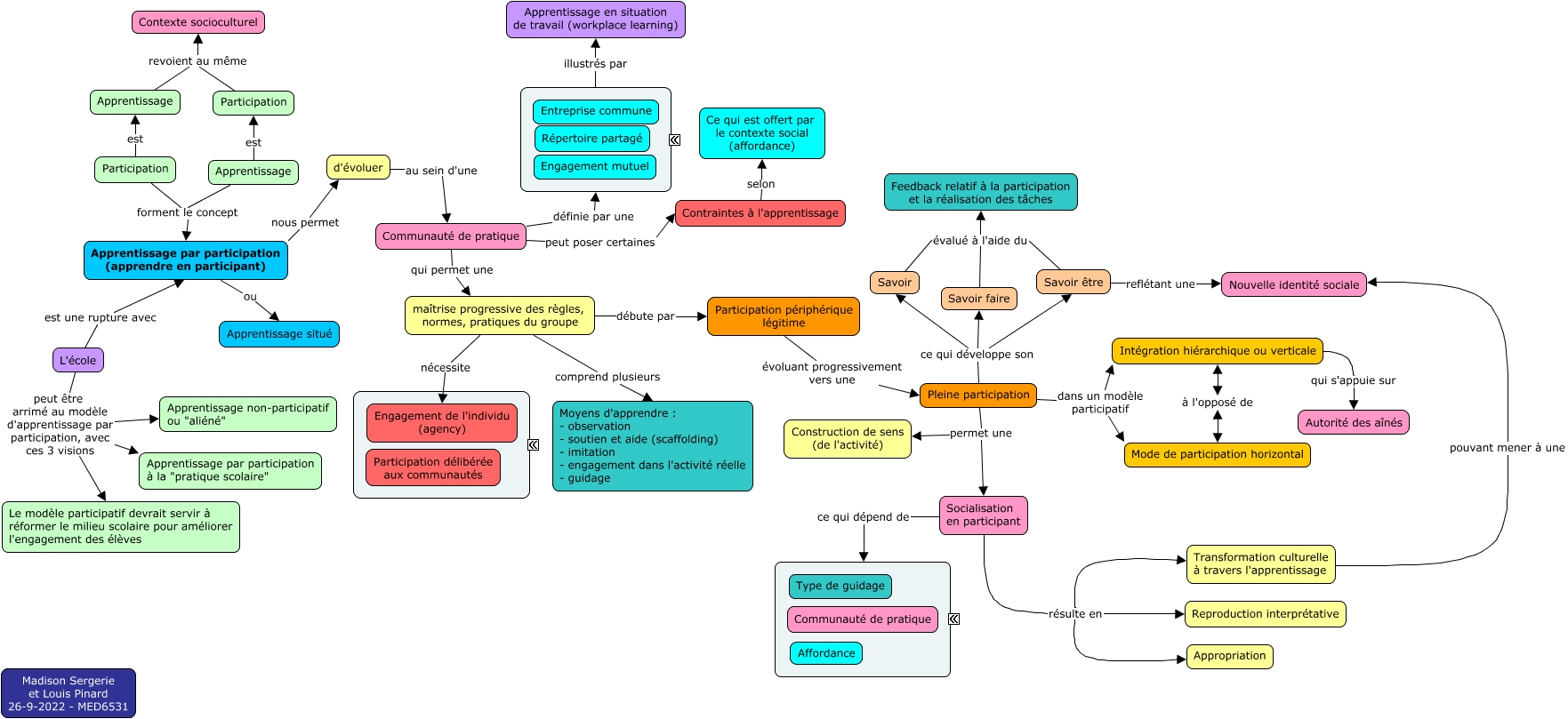 This Concept Map, created with IHMC CmapTools, has information related to: Theorie-apprendre-en-participant-LPinard-MSergerie, Participation revoient au même Contexte socioculturel, Communauté de pratique définie par une ????, Socialisation en participant ce qui dépend de ????, Apprentissage par participation (apprendre en participant) ou Apprentissage situé, L'école peut être arrimé au modèle d'apprentissage par participation, avec ces 3 visions Apprentissage par participation à la "pratique scolaire", Intégration hiérarchique ou verticale qui s'appuie sur Autorité des aînés, Apprentissage par participation (apprendre en participant) nous permet d'évoluer, Socialisation en participant résulte en Transformation culturelle à travers l'apprentissage, Transformation culturelle à travers l'apprentissage pouvant mener à une Nouvelle identité sociale, maîtrise progressive des règles, normes, pratiques du groupe comprend plusieurs Moyens d'apprendre : - observation - soutien et aide (scaffolding) - imitation - engagement dans l'activité réelle - guidage, Participation périphérique légitime évoluant progressivement vers une Pleine participation, Pleine participation ce qui développe son Savoir, maîtrise progressive des règles, normes, pratiques du groupe débute par Participation périphérique légitime, Contraintes à l'apprentissage selon Ce qui est offert par le contexte social (affordance), Pleine participation ce qui développe son Savoir faire, Communauté de pratique peut poser certaines Contraintes à l'apprentissage, Participation est Apprentissage, Intégration hiérarchique ou verticale à l'opposé de Mode de participation horizontal, Savoir faire évalué à l'aide du Feedback relatif à la participation et la réalisation des tâches, Participation revoient au même Contexte socioculturel