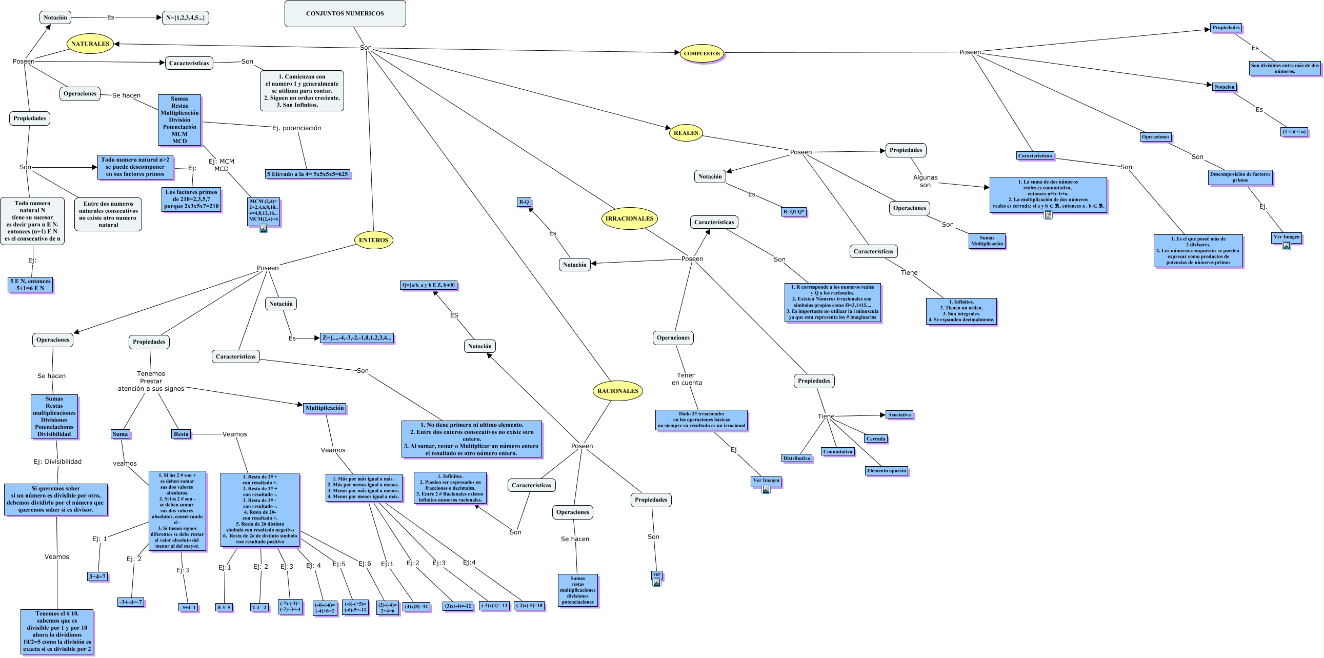 Este Cmap, tiene información relacionada con: Conjuntos Numéricos, Todo numero natural N tiene su sucesor es decir para n E N. entonces (n+1) E N es el consecutivo de n Ej: 5 E N, entonces 5+1=6 E N, COMPUESTOS Poseen Característicaa, IRRACIONALES Poseen Operaciones, Característicaa Son 1. Es el que poseé más de 2 divisores. 2. Los números compuestos se pueden expresar como productos de potencias de números primos, RACIONALES Poseen Notación, 1. Si los 2 # son + se deben sumar sus dos valores absolutos. 2. Si los 2 # son - se deben sumar sus dos valores absolutos, conservando el - 3. Si tienen signos diferentes se debe restar el valor absoluto del menor al del mayor. Ej: 2 -3+-4=-7, Características Son 1. No tiene primero ni ultimo elemento. 2. Entre dos enteros consecutivos no existe otro entero. 3. Al sumar, restar o Multiplicar un número entero el resultado es otro número entero., Multiplicación Veamos 1. Más por más igual a más. 2. Más por menos igual a menos. 3. Menos por más igual a menos. 4. Menos por menos igual a más., 1. Si los 2 # son + se deben sumar sus dos valores absolutos. 2. Si los 2 # son - se deben sumar sus dos valores absolutos, conservando el - 3. Si tienen signos diferentes se debe restar el valor absoluto del menor al del mayor. Ej: 1 3+4=7, COMPUESTOS Poseen Operaciones, 1. Más por más igual a más. 2. Más por menos igual a menos. 3. Menos por más igual a menos. 4. Menos por menos igual a más. Ej:3 (-3)x(4)=-12, Propiedades Algunas son 1. La suma de dos números reales es conmutativa, entonces a+b=b+a. 2. La multiplicación de dos números reales es cerrada: si a y b ∈ ℜ, entonces a . b ∈ ℜ., RACIONALES Poseen Operaciones, CONJUNTOS NUMERICOS Son IRRACIONALES, Propiedades Tenemos Prestar atención a sus signos Suma, ENTEROS Poseen Operaciones, Notación Es (1 < d < n), 1. Más por más igual a más. 2. Más por menos igual a menos. 3. Menos por más igual a menos. 4. Menos por menos igual a más. Ej:4 (-2)x(-5)=10, Propiedades Tiene Distributiva, REALES Poseen Notación