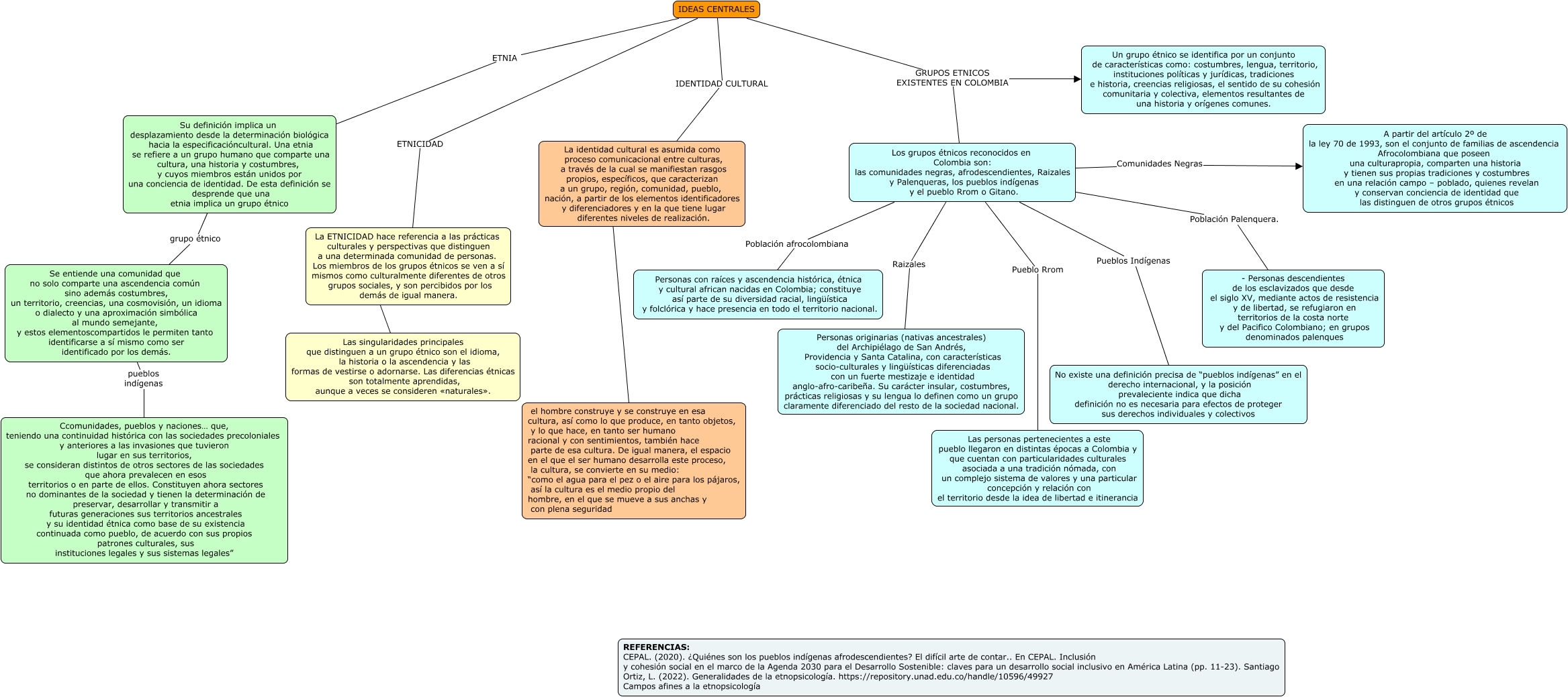 Este Cmap, tiene información relacionada con: Ideas Centrales, IDEAS CENTRALES IDENTIDAD CULTURAL La identidad cultural es asumida como proceso comunicacional entre culturas, a través de la cual se manifiestan rasgos propios, específicos, que caracterizan a un grupo, región, comunidad, pueblo, nación, a partir de los elementos identificadores y diferenciadores y en la que tiene lugar diferentes niveles de realización., La ETNICIDAD hace referencia a las prácticas culturales y perspectivas que distinguen a una determinada comunidad de personas. Los miembros de los grupos étnicos se ven a sí mismos como culturalmente diferentes de otros grupos sociales, y son percibidos por los demás de igual manera. ???? Las singularidades principales que distinguen a un grupo étnico son el idioma, la historia o la ascendencia y las formas de vestirse o adornarse. Las diferencias étnicas son totalmente aprendidas, aunque a veces se consideren «naturales»., Los grupos étnicos reconocidos en Colombia son: las comunidades negras, afrodescendientes, Raizales y Palenqueras, los pueblos indígenas y el pueblo Rrom o Gitano. Pueblos Indígenas No existe una definición precisa de “pueblos indígenas” en el derecho internacional, y la posición prevaleciente indica que dicha definición no es necesaria para efectos de proteger sus derechos individuales y colectivos, IDEAS CENTRALES GRUPOS ETNICOS EXISTENTES EN COLOMBIA Los grupos étnicos reconocidos en Colombia son: las comunidades negras, afrodescendientes, Raizales y Palenqueras, los pueblos indígenas y el pueblo Rrom o Gitano., IDEAS CENTRALES ETNICIDAD La ETNICIDAD hace referencia a las prácticas culturales y perspectivas que distinguen a una determinada comunidad de personas. Los miembros de los grupos étnicos se ven a sí mismos como culturalmente diferentes de otros grupos sociales, y son percibidos por los demás de igual manera., Los grupos étnicos reconocidos en Colombia son: las comunidades negras, afrodescendientes, Raizales y Palenqueras, los pueblos indígenas y el pueblo Rrom o Gitano. Comunidades Negras A partir del artículo 2º de la ley 70 de 1993, son el conjunto de familias de ascendencia Afrocolombiana que poseen una culturapropia, comparten una historia y tienen sus propias tradiciones y costumbres en una relación campo – poblado, quienes revelan y conservan conciencia de identidad que las distinguen de otros grupos étnicos, Se entiende una comunidad que no solo comparte una ascendencia común sino además costumbres, un territorio, creencias, una cosmovisión, un idioma o dialecto y una aproximación simbólica al mundo semejante, y estos elementoscompartidos le permiten tanto identificarse a sí mismo como ser identificado por los demás. pueblos indígenas Ccomunidades, pueblos y naciones… que, teniendo una continuidad histórica con las sociedades precoloniales y anteriores a las invasiones que tuvieron lugar en sus territorios, se consideran distintos de otros sectores de las sociedades que ahora prevalecen en esos territorios o en parte de ellos. Constituyen ahora sectores no dominantes de la sociedad y tienen la determinación de preservar, desarrollar y transmitir a futuras generaciones sus territorios ancestrales y su identidad étnica como base de su existencia continuada como pueblo, de acuerdo con sus propios patrones culturales, sus instituciones legales y sus sistemas legales”, Los grupos étnicos reconocidos en Colombia son: las comunidades negras, afrodescendientes, Raizales y Palenqueras, los pueblos indígenas y el pueblo Rrom o Gitano. Población Palenquera. - Personas descendientes de los esclavizados que desde el siglo XV, mediante actos de resistencia y de libertad, se refugiaron en territorios de la costa norte y del Pacifico Colombiano; en grupos denominados palenques, Su definición implica un desplazamiento desde la determinación biológica hacia la especificacióncultural. Una etnia se refiere a un grupo humano que comparte una cultura, una historia y costumbres, y cuyos miembros están unidos por una conciencia de identidad. De esta definición se desprende que una etnia implica un grupo étnico grupo étnico Se entiende una comunidad que no solo comparte una ascendencia común sino además costumbres, un territorio, creencias, una cosmovisión, un idioma o dialecto y una aproximación simbólica al mundo semejante, y estos elementoscompartidos le permiten tanto identificarse a sí mismo como ser identificado por los demás., Los grupos étnicos reconocidos en Colombia son: las comunidades negras, afrodescendientes, Raizales y Palenqueras, los pueblos indígenas y el pueblo Rrom o Gitano. Pueblo Rrom Las personas pertenecientes a este pueblo llegaron en distintas épocas a Colombia y que cuentan con particularidades culturales asociada a una tradición nómada, con un complejo sistema de valores y una particular concepción y relación con el territorio desde la idea de libertad e itinerancia, Los grupos étnicos reconocidos en Colombia son: las comunidades negras, afrodescendientes, Raizales y Palenqueras, los pueblos indígenas y el pueblo Rrom o Gitano. Raizales Personas originarias (nativas ancestrales) del Archipiélago de San Andrés, Providencia y Santa Catalina, con características socio-culturales y lingüísticas diferenciadas con un fuerte mestizaje e identidad anglo-afro-caribeña. Su carácter insular, costumbres, prácticas religiosas y su lengua lo definen como un grupo claramente diferenciado del resto de la sociedad nacional., IDEAS CENTRALES GRUPOS ETNICOS EXISTENTES EN COLOMBIA Un grupo étnico se identifica por un conjunto de características como: costumbres, lengua, territorio, instituciones políticas y jurídicas, tradiciones e historia, creencias religiosas, el sentido de su cohesión comunitaria y colectiva, elementos resultantes de una historia y orígenes comunes., IDEAS CENTRALES ETNIA Su definición implica un desplazamiento desde la determinación b