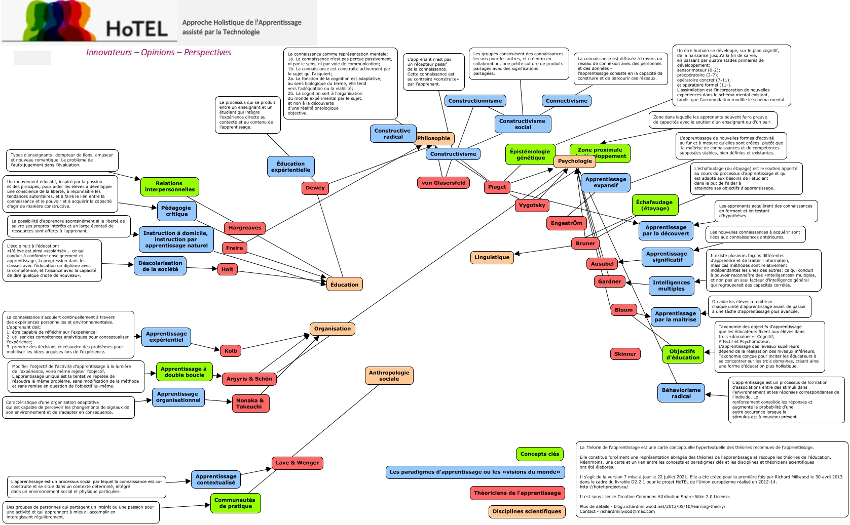 Cette carte de concepts créée avec IHMC CmapTools traite de: Copie de Copie de Théorie de l'apprentissage FR 22 sept.cmap, Des groupes de personnes qui partagent un intérêt ou une passion pour une activité et qui apprennent à mieux l'accomplir en interagissant régulièrement. Communautés de pratique, La connaissance est diffusée à travers un réseau de connexion avec des personnes et des données - l'apprentissage consiste en la capacité de construire et de parcourir ces réseaux. Constructivisme social, Dewey Philosophie, Le processus qui se produit entre un enseignant et un étudiant qui intègre l'expérience directe au contexte et au contenu de l'apprentissage. Dewey, Bloom Apprentissage par la maîtrise, Modifier l'objectif de l'activité d'apprentissage à la lumière de l'expérience, voire même rejeter l'objectif. L'apprentissage unique est la tentative répétée de résoudre la même problème, sans modification de la méthode et sans remise en question de l'objectif lui-même. Apprentissage à double boucle, Anthropologie sociale Communautés de pratique, L'apprentissage de nouvelles formes d'activité au fur et à mesure qu'elles sont créées, plutôt que la maîtrise de connaissances et de compétences supposées stables, bien définies et existantes. Apprentissage expansif, Les apprenants acquièrent des connaissances en formant et en testant d'hypothèses. Apprentissage par la découvert, Relations interpersonnelles Hargreaves, Caractéristique d'une organisation adaptative qui est capable de percevoir les changements de signaux de son environnement et de s'adapter en conséquence. Apprentissage organisationnel, Échafaudage (étayage) Bruner, Instruction à domicile, instruction par apprentissage naturel Éducation, Apprentissage expansif EngestrÖm, Zone proximale de développement Vygotsky, L'apprentissage est un processus de formation d'associations entre des stimuli dans l'environnement et les réponses correspondantes de l'individu. Le renforcement consolide les réponses et augmente la probabilité d'une autre occurence lorsque le stimulus est à nouveau présent. Béhaviorisme radical, La possibilité d'apprendre spontanément si la liberté de suivre ses propres intérêts et un large éventail de ressources sont offerts à l'apprenant. Instruction à domicile, instruction par apprentissage naturel, Intelligences multiples Gardner, Un mouvement éducatif, inspiré par la passion et des principes, pour aider les élèves à développer une conscience de la liberté, à reconnaître les tendances autoritaires, et à faire le lien entre la connaissance et le pouvoir et à acquérir la capacité d'agir de manière constructive. Pédagogie critique, von Glasersfeld Philosophie