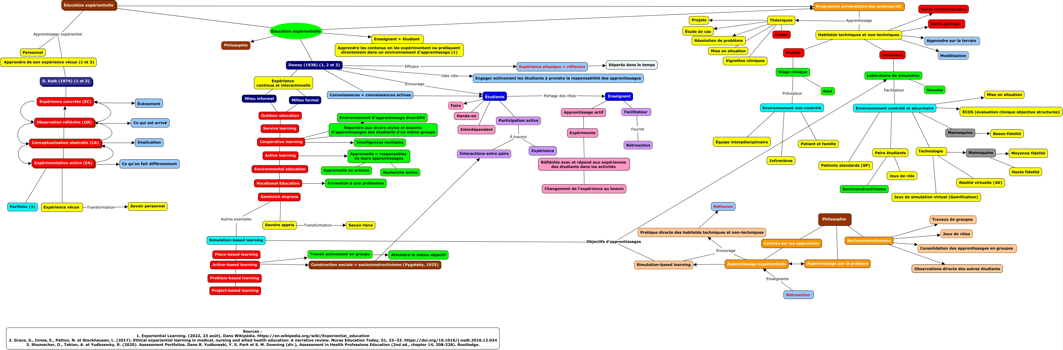 This Concept Map, created with IHMC CmapTools, has information related to: Expérientielle ou par la pratique ou experiential learning or learning with practise, Socioconstructivisme ???? Consolidation des apprentissages en groupes, Programme universitaire des sciences inf. Apprentissage Théoriques, Philosophie ???? Apprentissage par la pratique, Apprentissage actif ???? Réfléchie avec et répond aux expériences des étudiants dans les activités, Éducation expérientielle Apprentissage expérientiel Personnel, Cooperative learning ???? Répondre aux divers styles et besoins d'apprentissages des étudiants d'un même groupe, Conceptualisation abstraite (CA) ???? Implication, Hôpital ???? Stage clinique, Active-based learning ???? Travail activement en groupe, Éducation expérientielle Éducation expérientielle Dewey (1938) (1, 2 et 3), Habiletés techniques et non-techniques ???? Université, Apprentissage par la pratique ???? Apprentissage expérientielle, Théoriques ???? Projets, Conceptualisation abstraite (CA) ???? Observation réfléchie (OR), Pratique directe des habiletés techniques et non-techniques ???? Réflexion, Conceptualisation abstraite (CA) ???? Expérimentation active (EA), Sandwich degrees Autres exemples Simulation-based learning, Mannequins ???? Basse-fidelité, Milieu formel ???? Outdoor education, Environnement contrôlé et sécuritaire ???? Mannequins