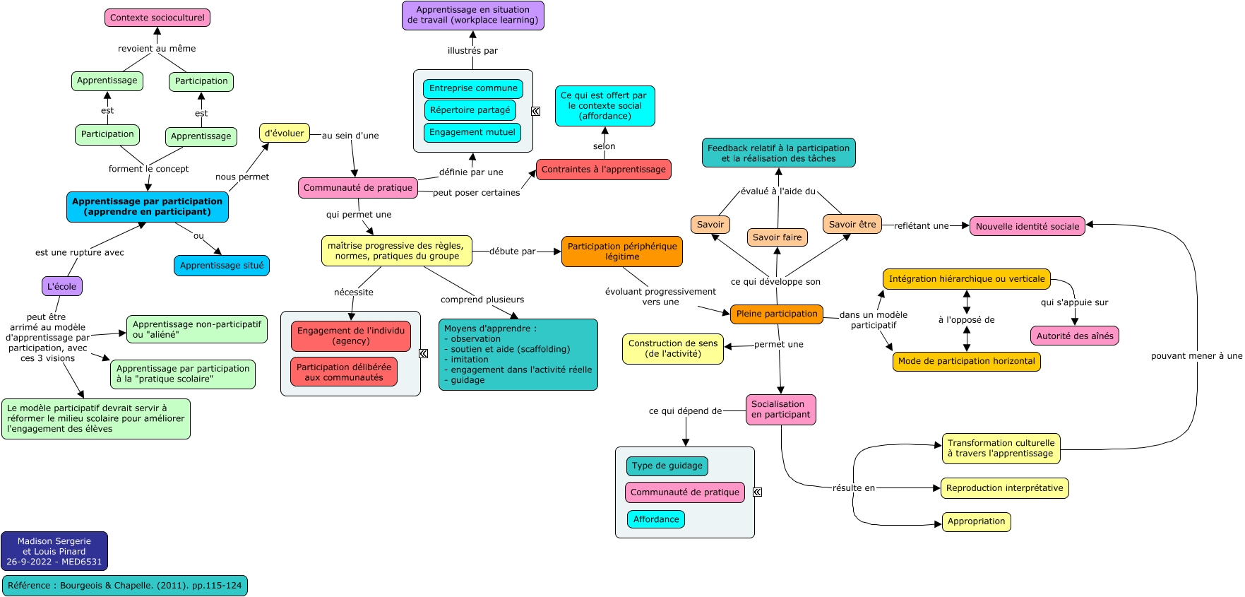 This Concept Map, created with IHMC CmapTools, has information related to: Theorie-apprendre-en-participant-LPinard-MSergerie, Participation revoient au même Contexte socioculturel, Communauté de pratique définie par une ????, Socialisation en participant ce qui dépend de ????, Apprentissage par participation (apprendre en participant) ou Apprentissage situé, L'école peut être arrimé au modèle d'apprentissage par participation, avec ces 3 visions Apprentissage par participation à la "pratique scolaire", Intégration hiérarchique ou verticale qui s'appuie sur Autorité des aînés, Apprentissage par participation (apprendre en participant) nous permet d'évoluer, Socialisation en participant résulte en Transformation culturelle à travers l'apprentissage, Transformation culturelle à travers l'apprentissage pouvant mener à une Nouvelle identité sociale, maîtrise progressive des règles, normes, pratiques du groupe comprend plusieurs Moyens d'apprendre : - observation - soutien et aide (scaffolding) - imitation - engagement dans l'activité réelle - guidage, Participation périphérique légitime évoluant progressivement vers une Pleine participation, Pleine participation ce qui développe son Savoir, maîtrise progressive des règles, normes, pratiques du groupe débute par Participation périphérique légitime, Contraintes à l'apprentissage selon Ce qui est offert par le contexte social (affordance), Pleine participation ce qui développe son Savoir faire, Communauté de pratique peut poser certaines Contraintes à l'apprentissage, Participation est Apprentissage, Intégration hiérarchique ou verticale à l'opposé de Mode de participation horizontal, Savoir faire évalué à l'aide du Feedback relatif à la participation et la réalisation des tâches, Participation revoient au même Contexte socioculturel