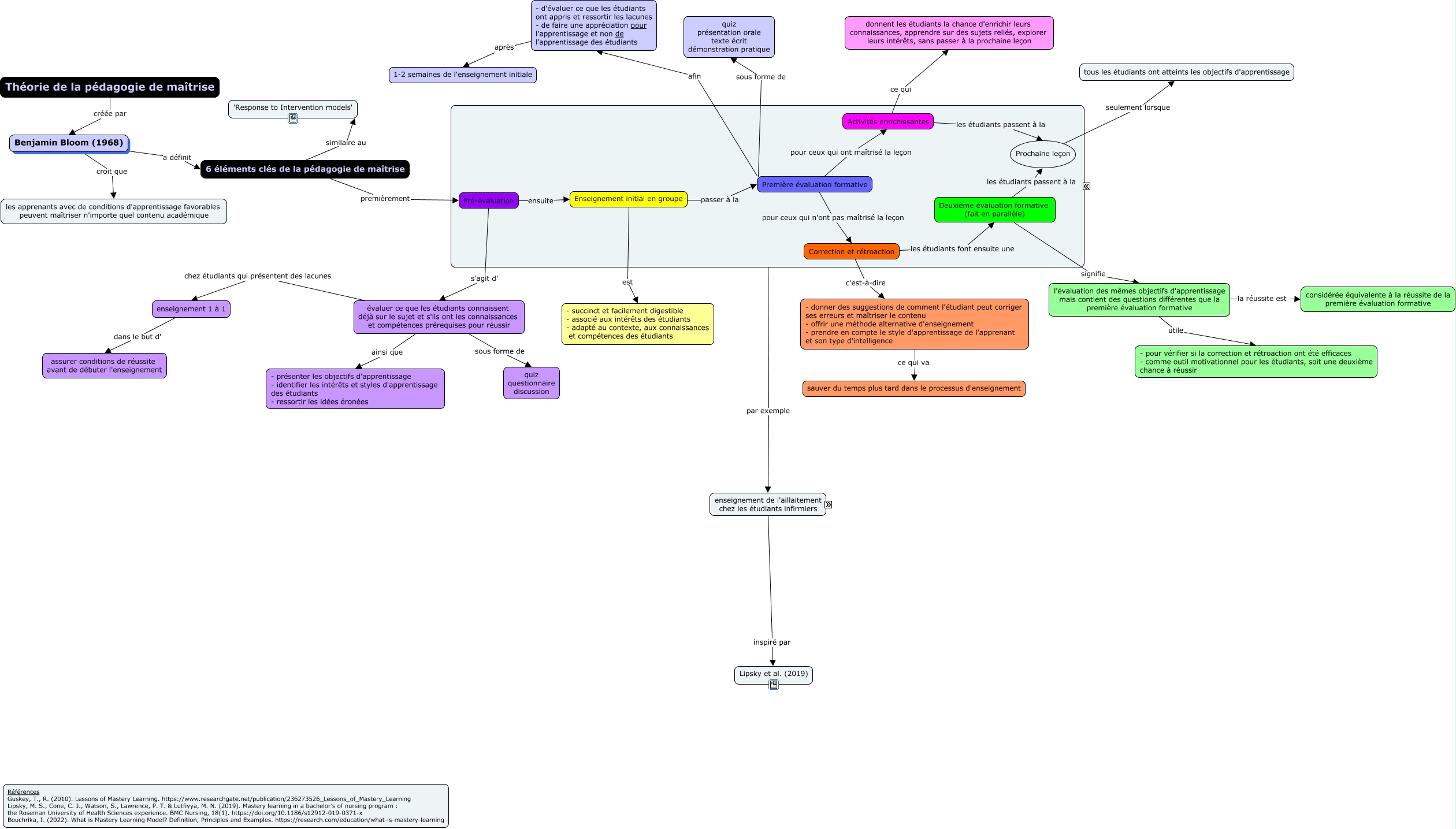 This Concept Map, created with IHMC CmapTools, has information related to: Pédagogie de maîtrise MSergerie, Deuxième évaluation formative (fait en parallèle) signifie l'évaluation des mêmes objectifs d'apprentissage mais contient des questions différentes que la première évaluation formative, 6 éléments clés de la pédagogie de maîtrise premièrement Pré-évaluation, Théorie de la pédagogie de maîtrise créée par Benjamin Bloom (1968), Première évaluation formative pour ceux qui n'ont pas maîtrisé la leçon Correction et rétroaction, Quiz formatif sur l'allaitement pour ceux qui n'ont pas maîtrisé la leçon Revue des réponses du quiz et discussion des réponses en petits groupes, l'évaluation des mêmes objectifs d'apprentissage mais contient des questions différentes que la première évaluation formative la réussite est considérée équivalente à la réussite de la première évaluation formative, Première évaluation formative sous forme de quiz présentation orale texte écrit démonstration pratique, Activité d'enseignement des principes d'allaitement enfin Prochaine leçon : complications possibles de l'allaitement, évaluer ce que les étudiants connaissent déjà sur le sujet et s'ils ont les connaissances et compétences prérequises pour réussir chez étudiants qui présentent des lacunes enseignement 1 à 1, évaluer ce que les étudiants connaissent déjà sur le sujet et s'ils ont les connaissances et compétences prérequises pour réussir sous forme de quiz questionnaire discussion, Activités enrichissantes ce qui donnent les étudiants la chance d'enrichir leurs connaissances, apprendre sur des sujets reliés, explorer leurs intérêts, sans passer à la prochaine leçon, Introduction aux nouveaux concepts d'allaitement sous forme de présentation magistrale prochainement Quiz formatif sur l'allaitement, Correction et rétroaction les étudiants font ensuite une Deuxième évaluation formative (fait en parallèle), Quiz formatif sur l'allaitement pour ceux qui ont maîtrisé la leçon Activité d'enseignement des principes d'allaitement, Benjamin Bloom (1968) croit que les apprenants avec de conditions d'apprentissage favorables peuvent maîtriser n'importe quel contenu académique, - d'évaluer ce que les étudiants ont appris et ressortir les lacunes - de faire une appréciation pour l'apprentissage et non de l'apprentissage des étudiants après 1-2 semaines de l'enseignement initiale, Prochaine leçon seulement lorsque tous les étudiants ont atteints les objectifs d'apprentissage, Benjamin Bloom (1968) a définit 6 éléments clés de la pédagogie de maîtrise, Première évaluation formative afin - d'évaluer ce que les étudiants ont appris et ressortir les lacunes - de faire une appréciation pour l'apprentissage et non de l'apprentissage des étudiants, Revue des réponses du quiz et discussion des réponses en petits groupes ensuite Deuxième quiz formatif